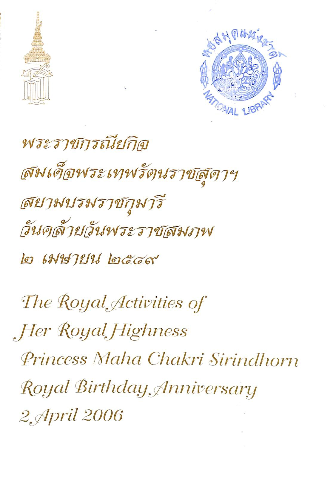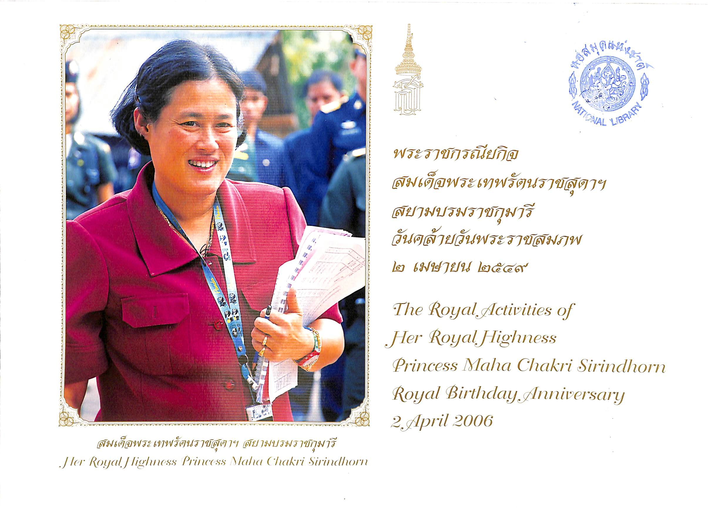 สำนักงานเสริมสร้างเอกลักษณ์ของชาติ สำนักงานปลัดสำนักนายกรัฐมนตรี ทำเนียบรัฐบาล, “พระราชกรณียกิจ สมเด็จพระเทพรัตนราชสุดาฯ สยามบรมราชกุมารี วันคล้ายวันพระราชสมภพ ๒ เมษายน ๒๕๔๙,” D-Library | National Library of Thailand, accessed April 2, 2026, http://164.115.27.97/digital2024/items/show/16236.