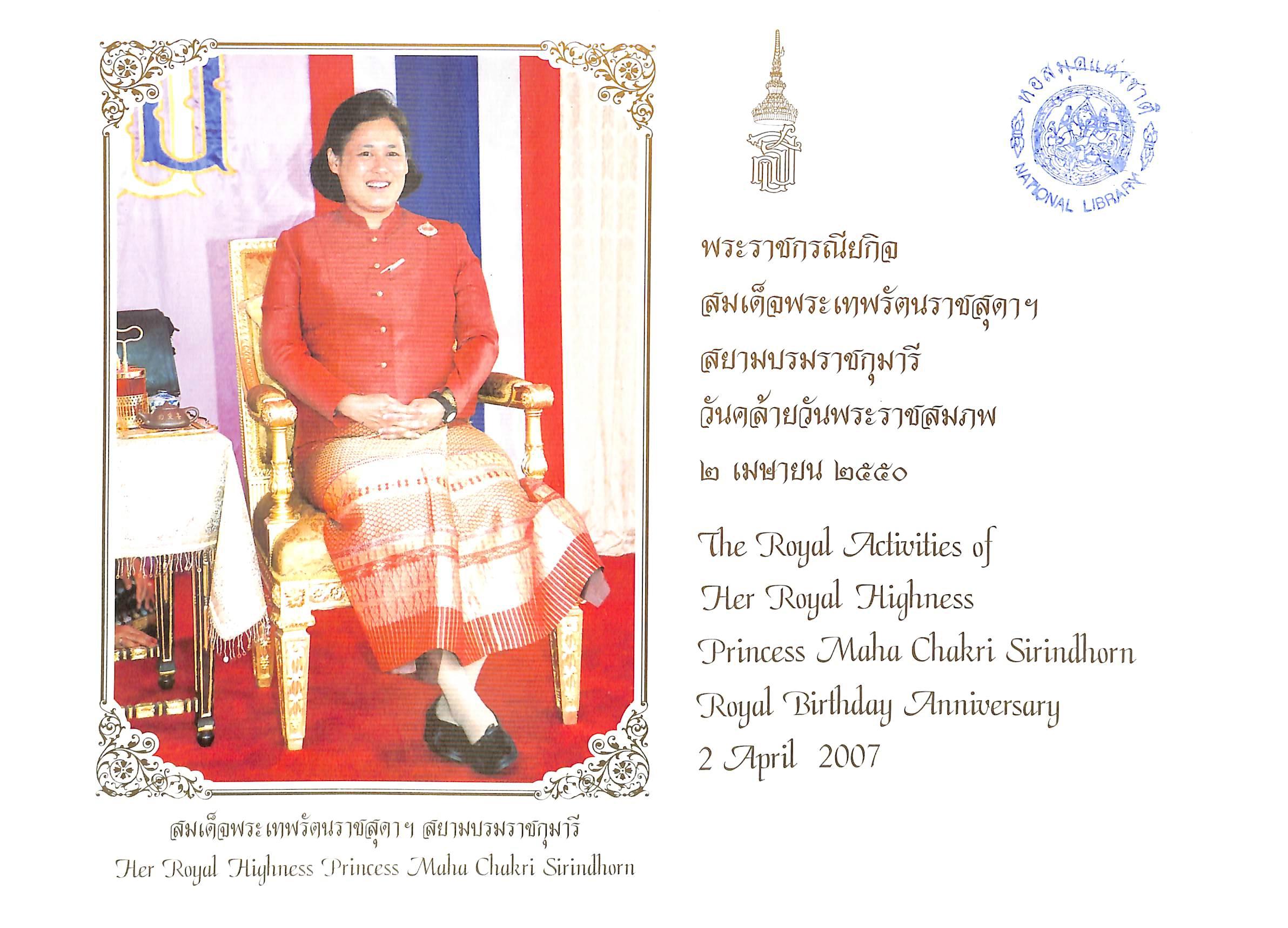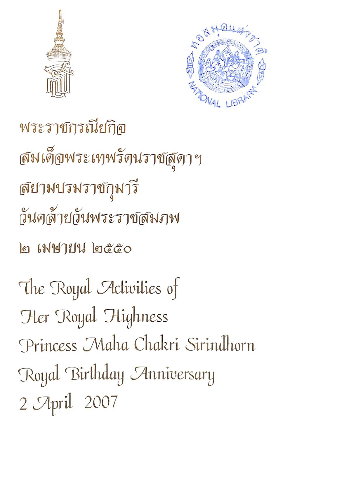 สำนักงานเสริมสร้างเอกลักษณ์ของชาติ สำนักงานปลัดสำนักนายกรัฐมนตรี ทำเนียบรัฐบาล, “พระราชกรณียกิจ สมเด็จพระเทพรัตนราชสุดาฯ สยามบรมราชกุมารี วันคล้ายวันพระราชสมภพ ๒ เมษายน ๒๕๕๐,” D-Library | National Library of Thailand, accessed April 2, 2026, http://164.115.27.97/digital2024/items/show/16237.