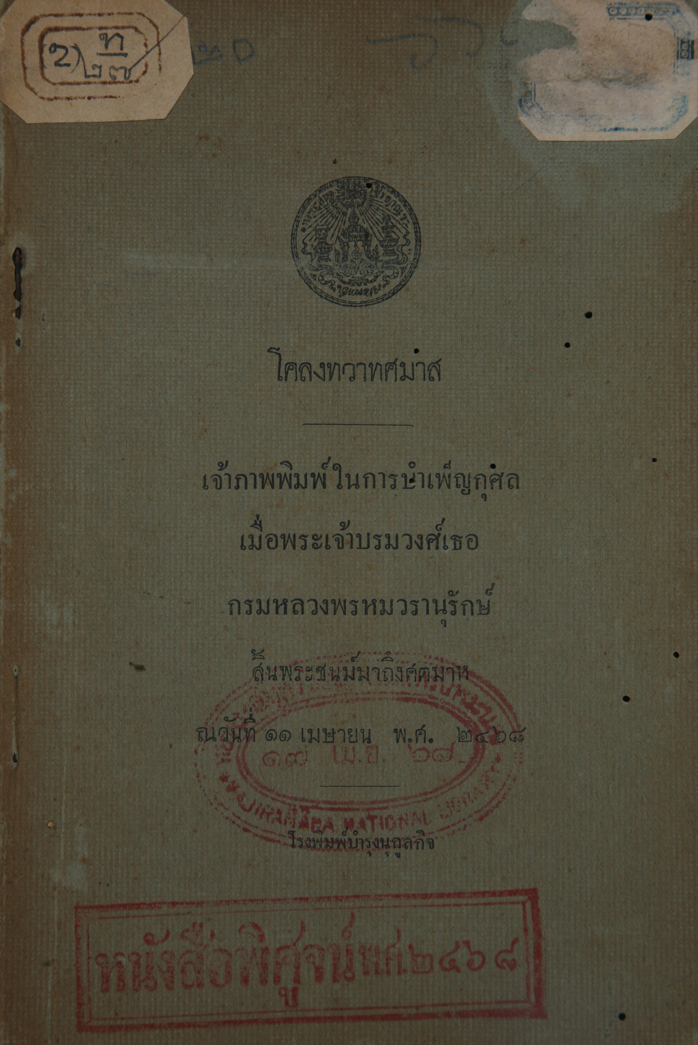 - เจ้าภาพพิมพ์ในการบำเพ็ญกุศลเมื่อพระเจ้าบรมวงศ์เธอ กรมหลวงพรหมวรานุรักษ์สิ้นพระชนม์มาถึงศตมาห ณ วันที่ 11 เมษายน พ.ศ. 2468