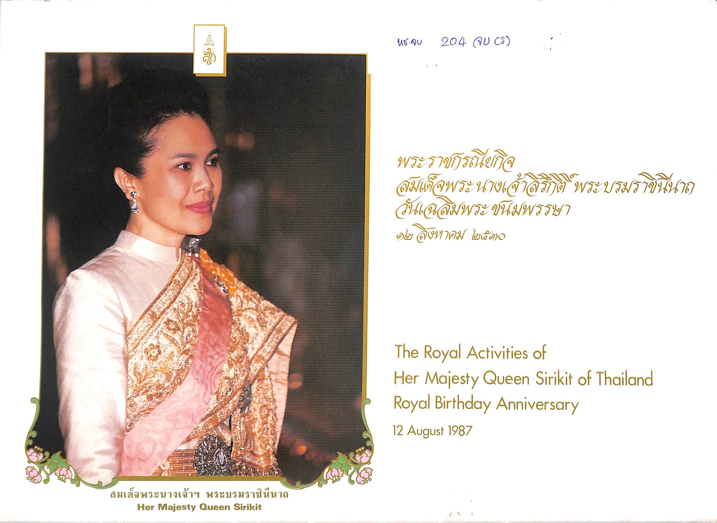 สำนักงานเสริมสร้างเอกลักษณ์ของชาติ สำนักเลขาธิการนายกรัฐมนตรี ทำเนียบรัฐบาล, “พระราชกรณียกิจ สมเด็จพระนางเจ้าสิริกิติ์ พระบรมราชินีนาถ วันเฉลิมพระชนมพรรษา ๑๒ สิงหาคม ๒๕๓๐,” D-Library | National Library of Thailand, accessed April 2, 2026, http://164.115.27.97/digital2024/items/show/17777.