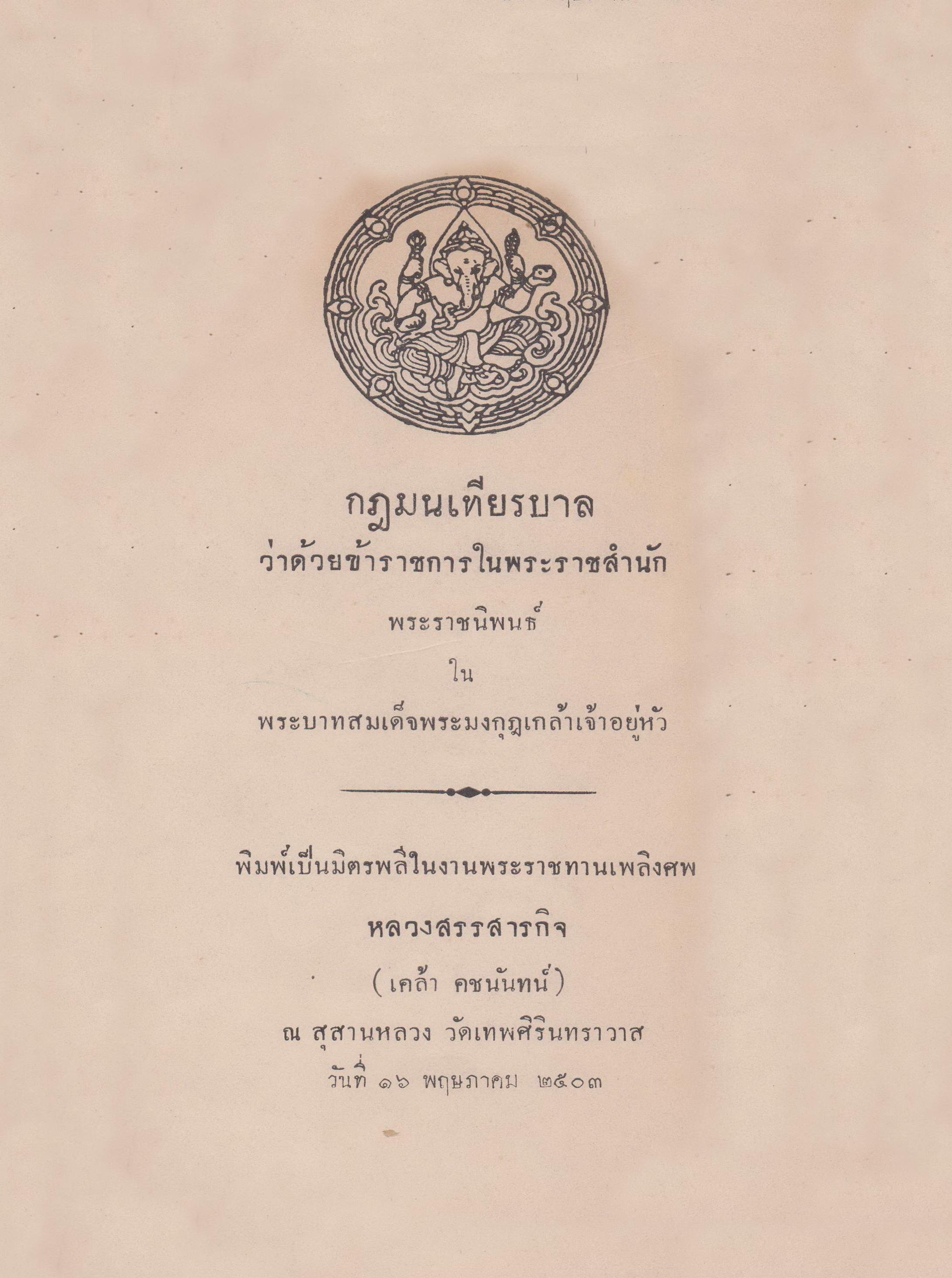- พิมพ์เป็นมิตรพลีในงานพระราชทานเพลิงศพหลวงสรรสารกิจ (เคล้า คชนันท์) วันที่ 21 มีนาคม 2503 กฎมนเทียรบาล ฉบับนี้ ประกาศใช้เป็นกฎหมาย เมื่อพุทธ ศักราช 2457 และพระบาทสมเด็จพระมงกุฎเกล้าเจ้าอยู่หัว ทรงร่างขึ้นด้วยลายพระหัตถ์ของพระองค์เอง เพื่อใช้สำหรับข้าราชการในพระราชสำนัก โดยมีพระราชประสงค์จะกวดขันความประพฤติของข้าราชการในพระราชสำนักให้ประพฤติปฏิบัติในสิ่งที่ดีงาม แบ่งเป็น 9 หมวด หมวดที่ 1 ว่าด้วยนามและลักษณะใช้กฎมนเทียรบาลนี้ หมวดที่ 2 ว่าด้วยผู้ที่จะต้องปฏิบัติตามกฎนี้ หมวดที่ 3 อธิบายคำในกฎนี้ หมวดที่ 4 ว่าด้วยการจดทะเบียนครอบครัวและเคหะสถาน หมวดที่ 5 ว่าด้วยหน้าที่เจ้าพนักงานทะเบียน หมวดที่ 6 ว่าด้วยการขออนุญาตให้มีครอบครัวและเคหะสถาน หมวดที่ 7 ว่าด้วยคนหม้าย และคนไม่มีเคหะสถาน หมวดที่ 8 อธิบายด้วยชั้นความผิดและการลงทัณฑ์ หมวดที่ 9 ว่าด้วยการกำหนดโทษสำหรับความผิด