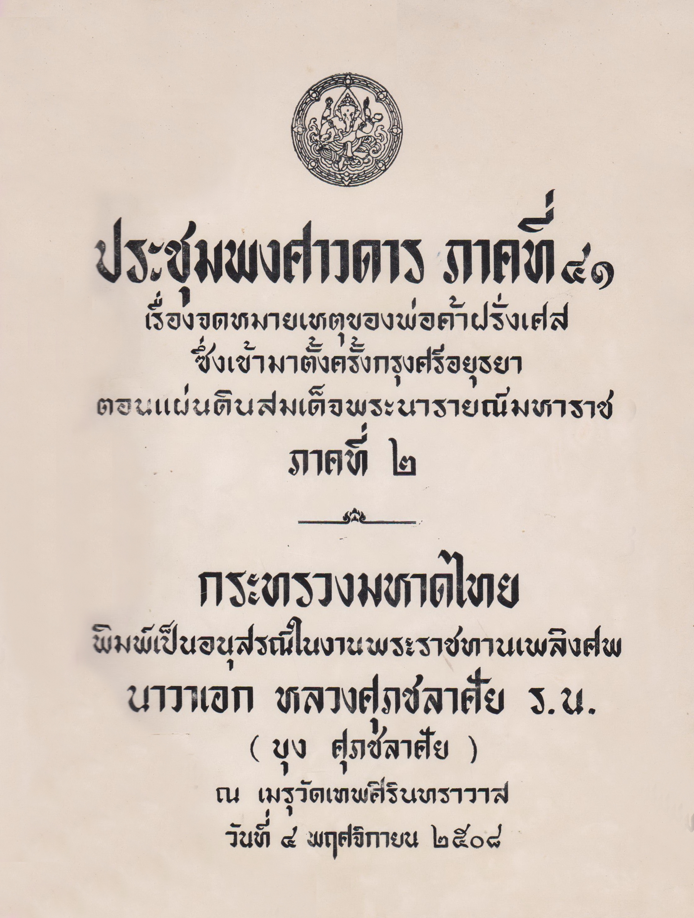 - กระทรวงมหาดไทย พิมพ์เป็นอนุสรณ์ในงานพระราชทานเพลิงศพ นาวาเอกหลวง ศุภชลาศัย (บุง ศุภชลาศัย) วันที่ 4 พฤศจิกายน 2508 คำแปลจดหมายเหตุของคณะพ่อค้าฝรั่งเศส ซึ่งเข้ามาตั้งครั้ง กรุงศรีอยุธยาภาค 2 นี้ นับเป็นประชุมพงศาวดารภาคที่ 41 ได้ขอคัดภาษาฝรั่งเศส มาจากประเทศฝรั่งเศส ในพ.ศ. 2463 จดหมายเหตุ เล่มนี้ว่าโดยรูปเรื่องที่เกี่ยวกับพงศาวดาร ก็คล้ายกับจดหมายเหตุคณะบาทหลวงฝรั่งเศส ผิดกันแต่ความมุ่งหมาย ถ้าเป็นของคณะบาทหลวง จะมุ่งหมายในการสอนศาสนามากกว่า มีเหตุการณ์อันใดที่เกี่ยวกับศาสนาก็จดบันทึกไว้ ส่วนประวัติเหตุการณ์บ้านเมือง ใครรู้เห็นอย่างไรก็จดบันทึกไปตามนั้น ซี่งสามารถให้ความรู้ในพงศาวดารสมัยนั้น