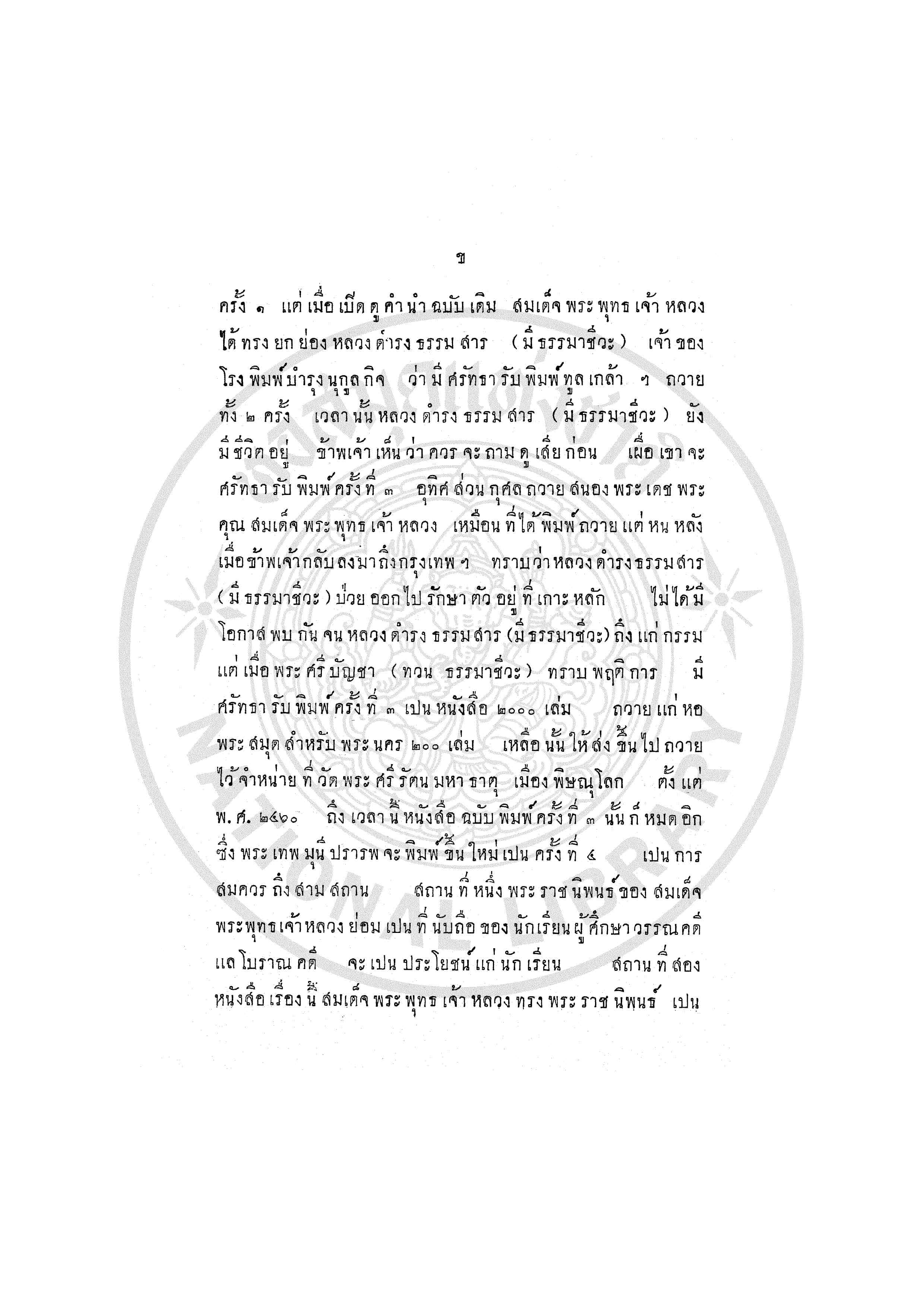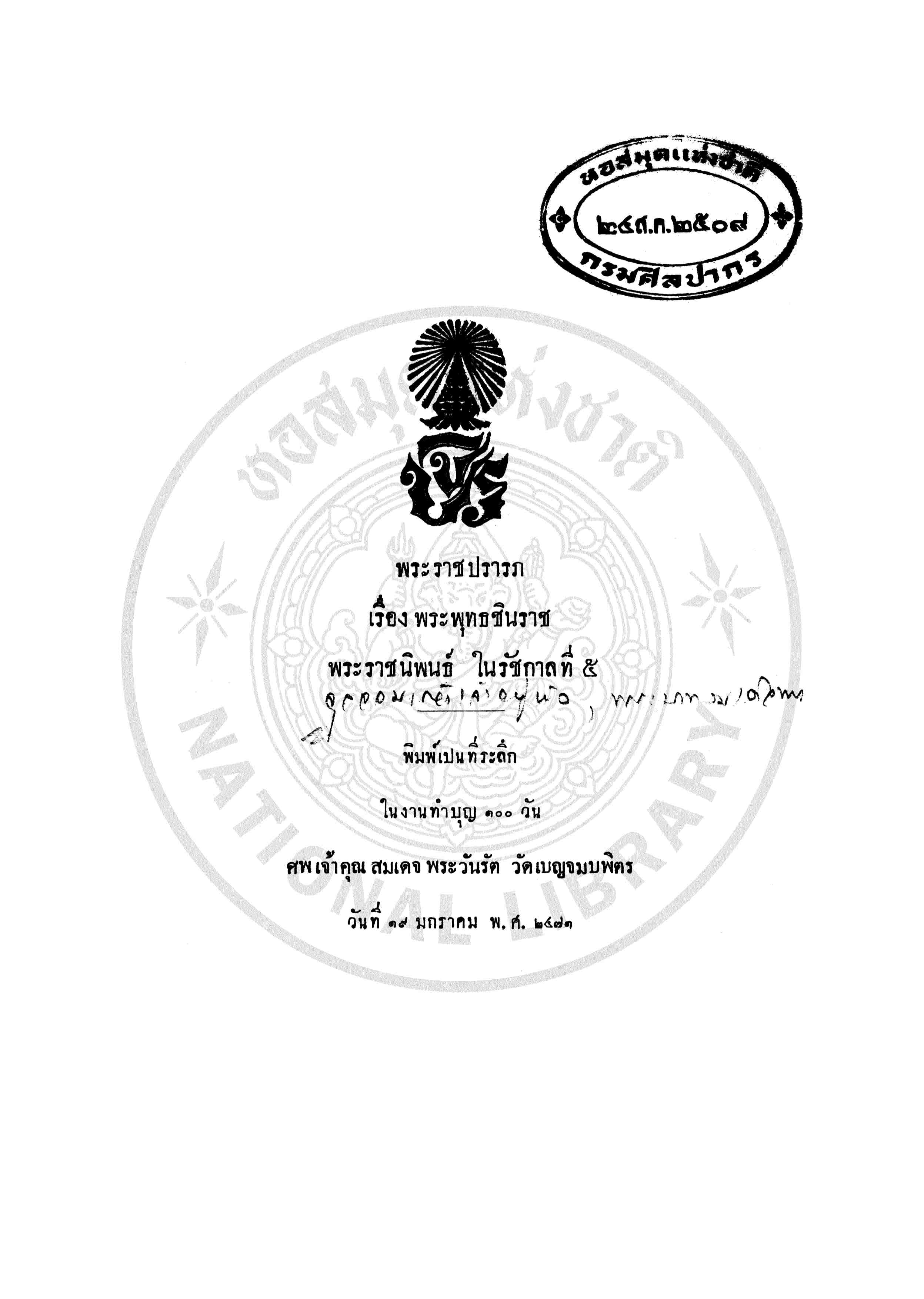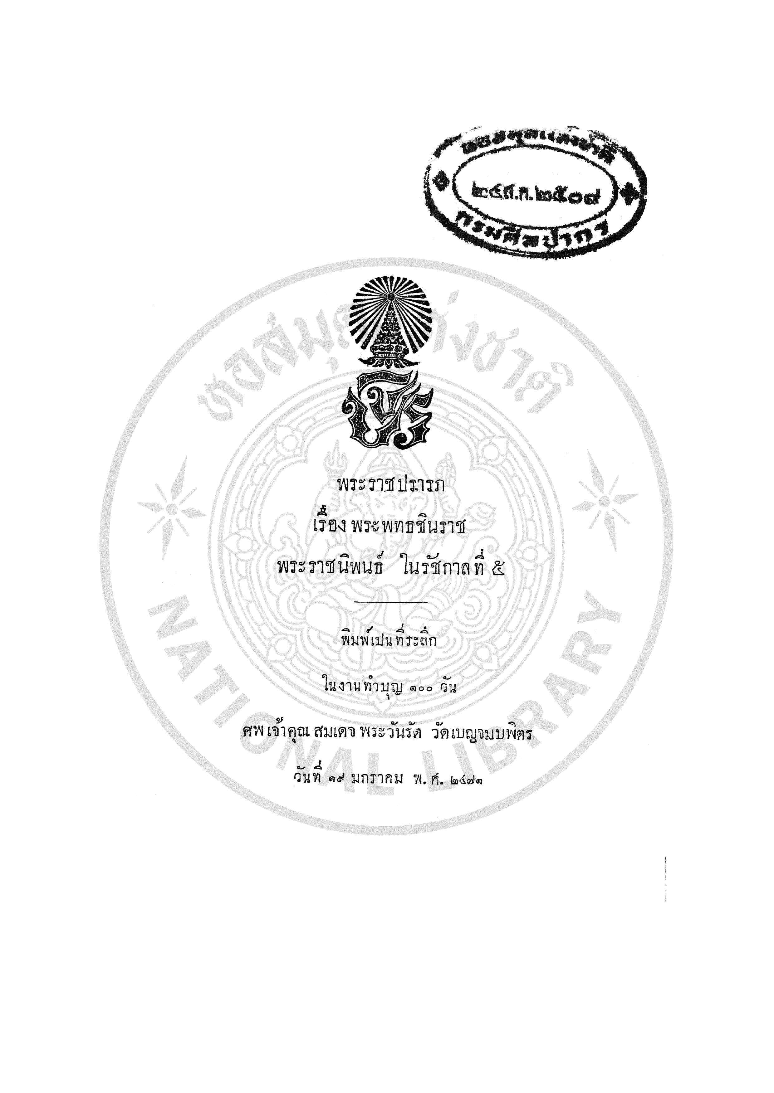 - พิมพ์เป็นที่ระลึกในงานทำบุญ 100 วัน ศพเจ้าคุณ สมเด็จพระวันรัต วัดเบญจมบพิตร วันที่ 19 มกราคม พ.ศ.2471