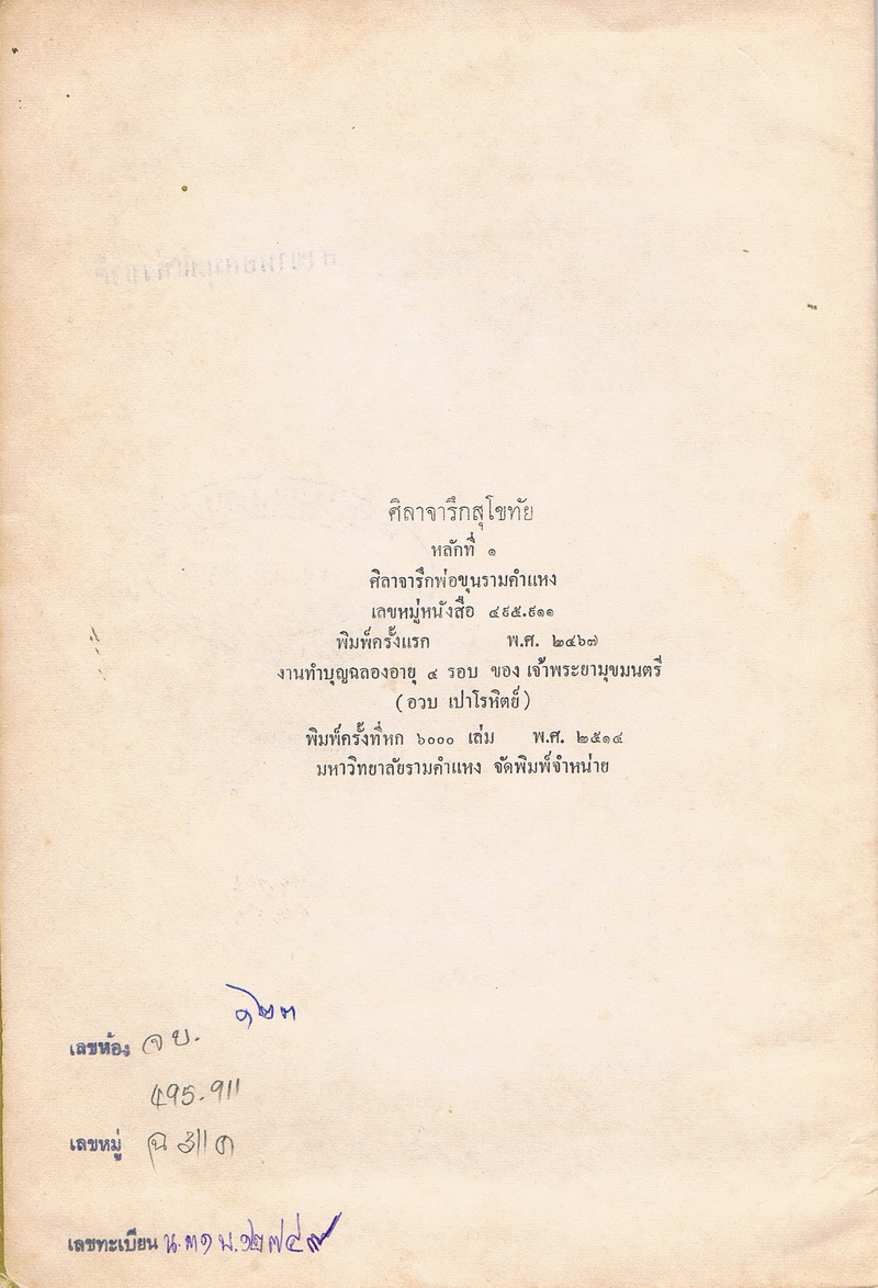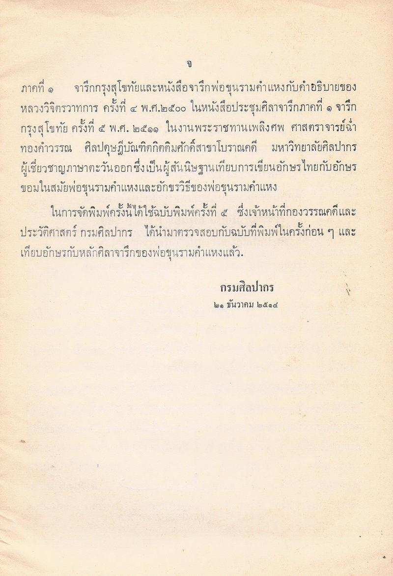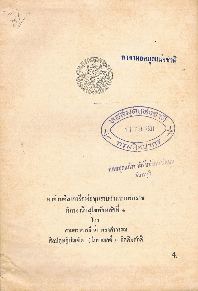 ฉ่ำ ทองคำวรรณ, “ศิลาจารึกสุโขทัย หลักที่ 1,” D-Library | National Library of Thailand, accessed April 2, 2026, http://164.115.27.97/digital2024/items/show/3244.