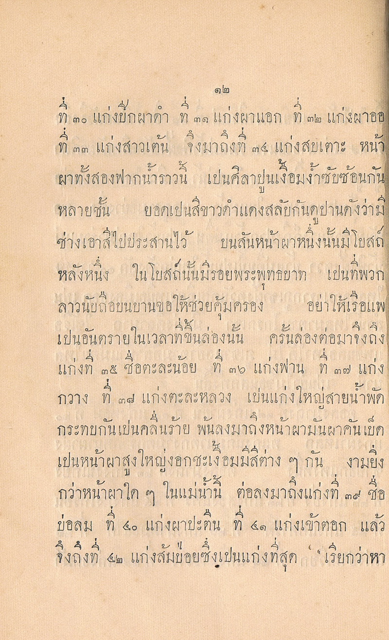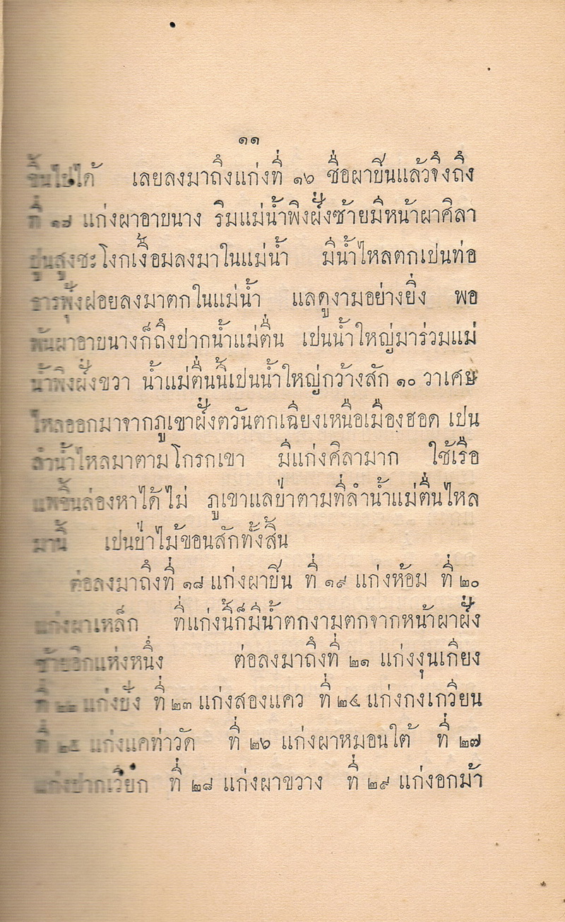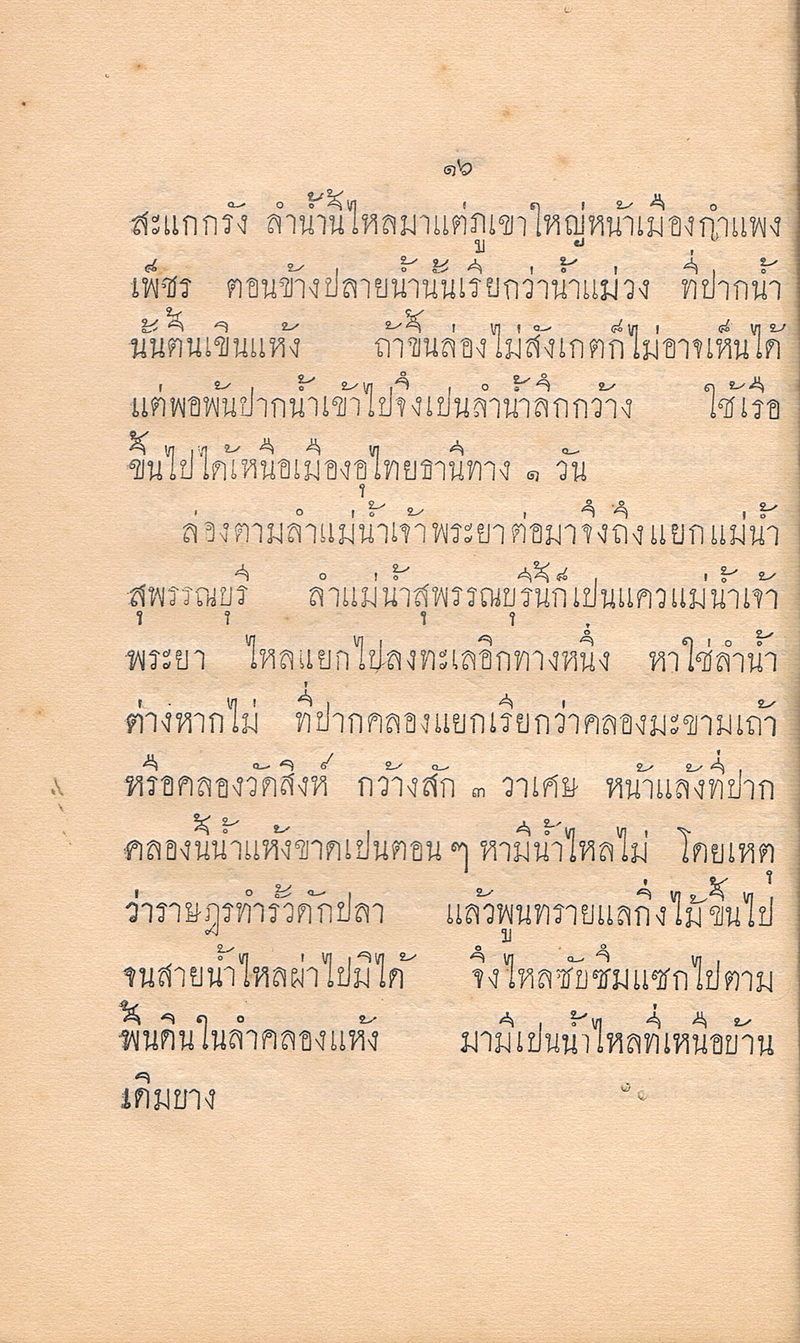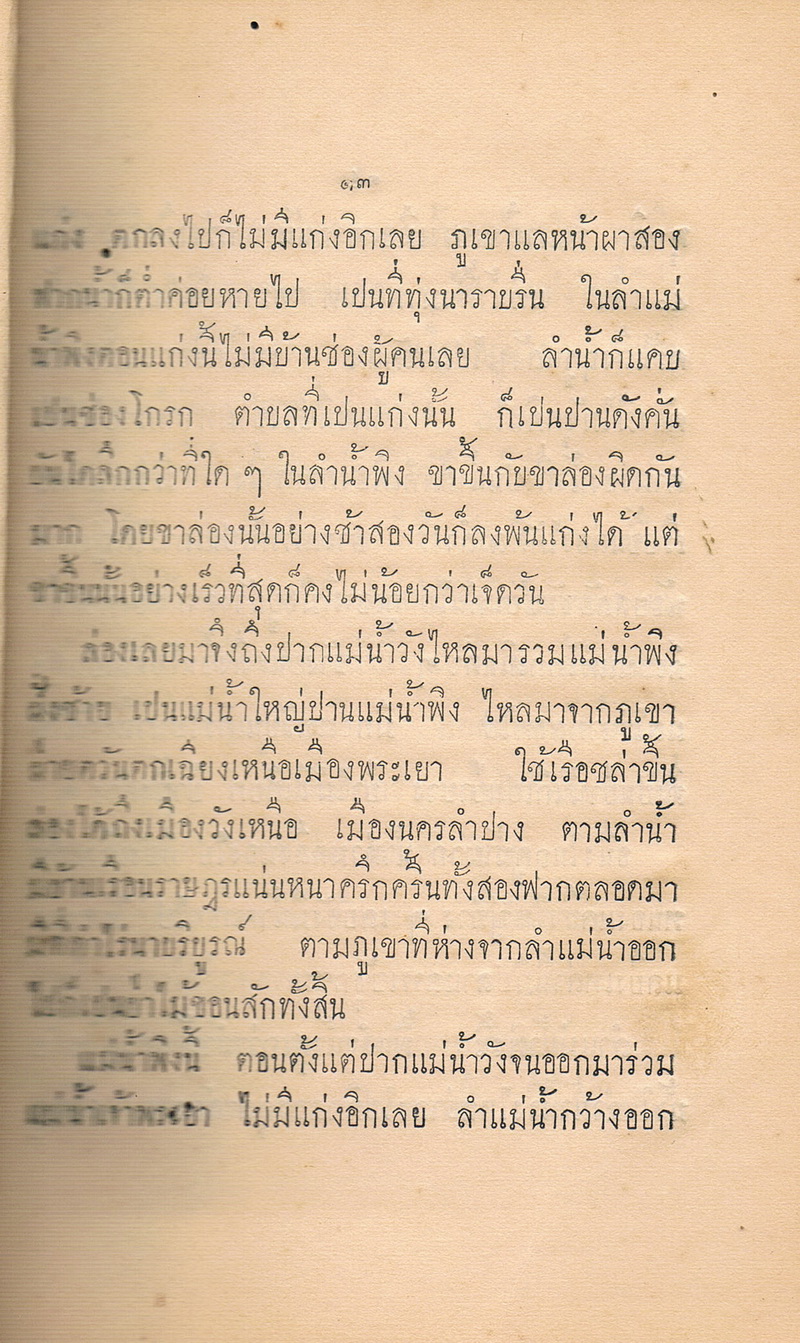 - หนังสือเล่มนี้ได้พูดถึงแม่น้ำที่มีในประเทศสยาม เริ่มต้นด้วยข้างฝ่ายเหนือแยกแควลำแม่น้ำพิงก่อน ไหลมาจากภูเขาสูงใหญ่แห่งหนึ่งชื่อดอยถ้วยข้างฝ่ายเหนือเมืองเชียงใหม่ ลงใต้มามีลำน้ำแม่กวง เป็นลำแม่น้ำที่เมืองลำพูน ต่อด้วยลำน้ำแม่ลี้ ลำแม่น้ำสุพรรณบุรี แม่น้ำแควใหญ่ แม่น้ำสุโขทัย จนถึงแม่น้ำเจ้าพระยา และยังได้พูดถึงแม่น้ำบางปะกง แม่น้ำของ ซึ่งเป็นแม่น้ำอยู่ในประเทศสยามข้างฝ่ายทิศตะวันออกเฉียงเหนือ เป็นลำแม่น้ำใหญ่ยาวมาจากประเทศจีน