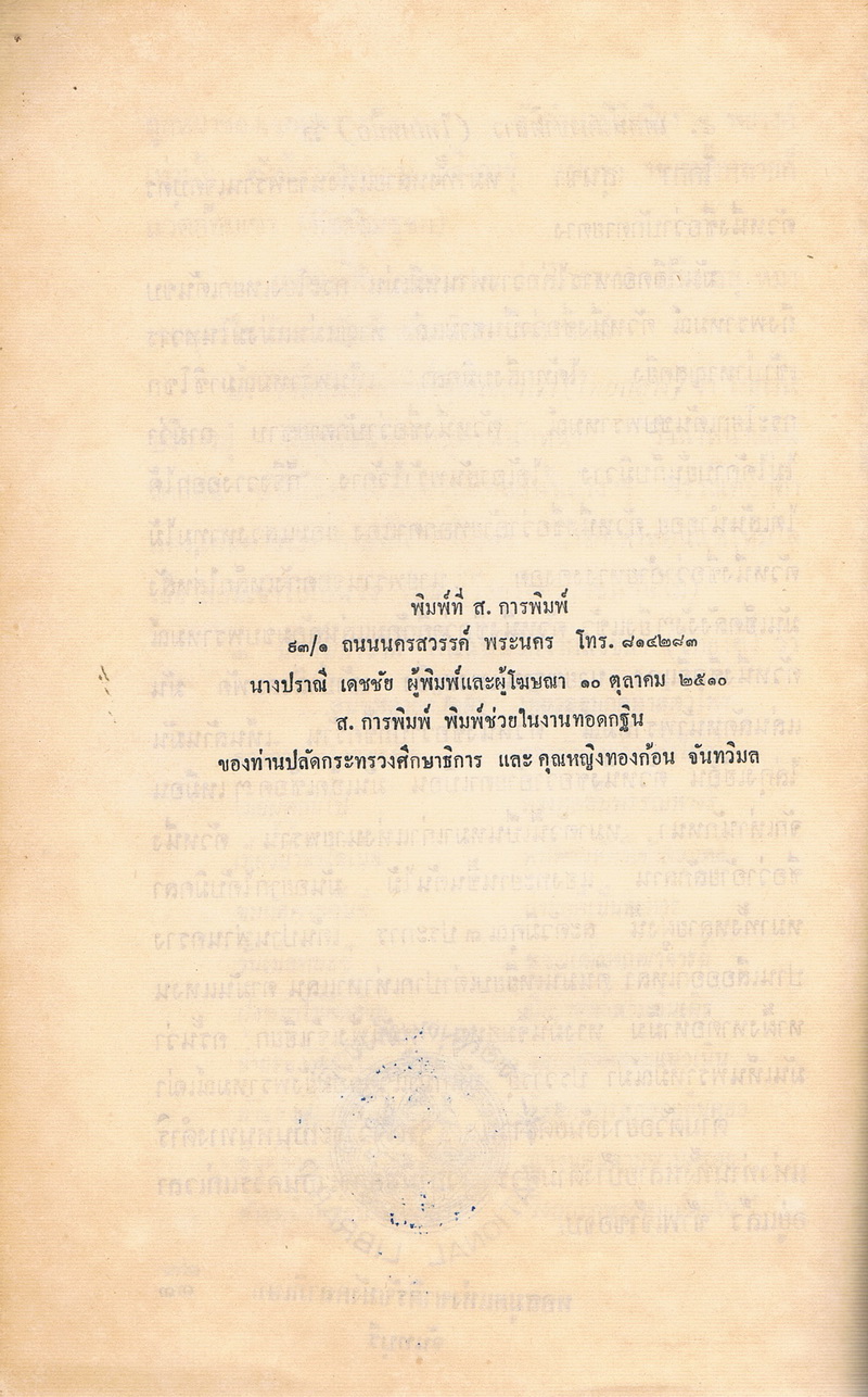 - พิมพ์แจกเป็นที่ระลึกเนื่องในการทอดกฐิน ณ วัดไผ่ล้อม จังหวัดจันทบุรี ของนายอภัย และคุณหญิงทองก้อน จันทวิมล วันที่ 22 ตุลาคม พ.ศ.2510