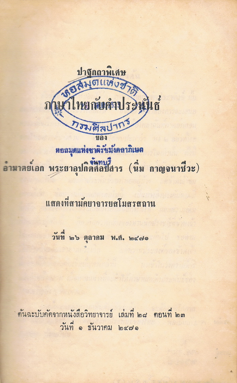 อุปกิตศิลปสาร, พระยา, “ปาฐกถาพิเศษ ภาษาไทยกับคำประพันธ์,” D-Library | National Library of Thailand, accessed April 2, 2026, http://164.115.27.97/digital2024/items/show/3380.