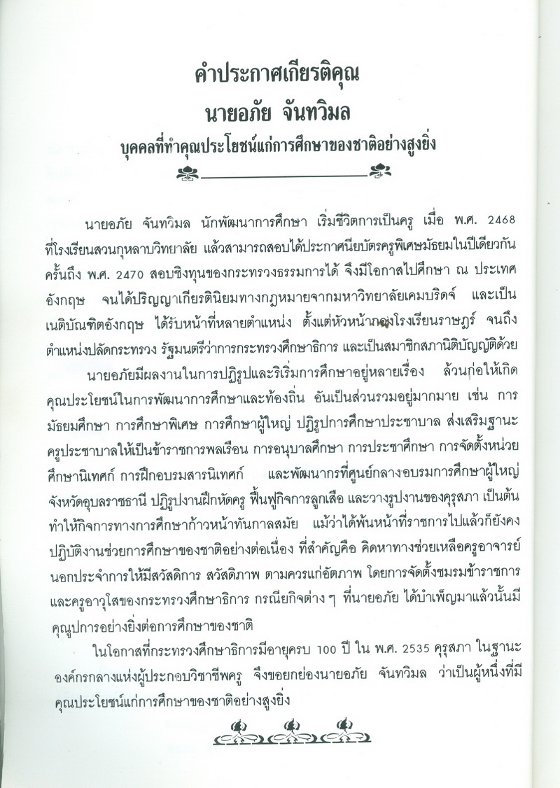 - นายอภัย จันทวิมล เป็นบุคคลที่ทำคุณประโยชน์แก่การศึกษาของชาติอย่างสูงยิ่ง