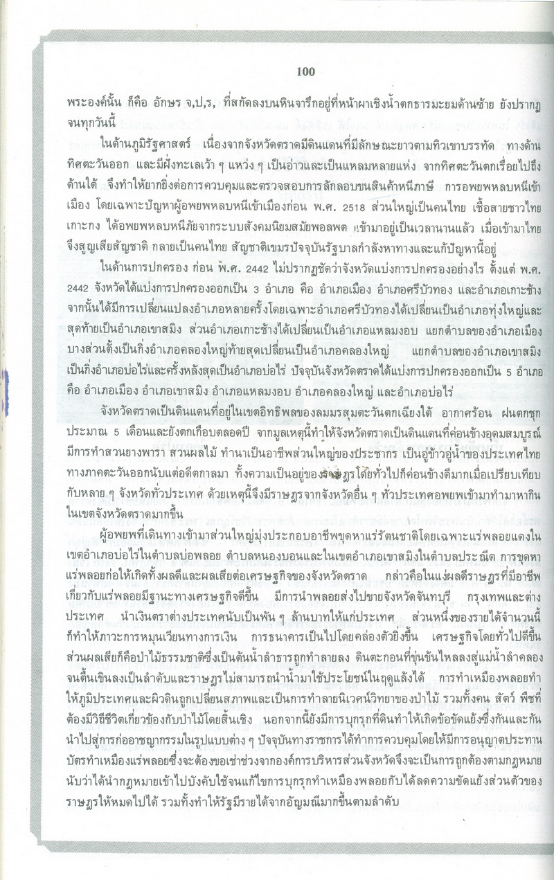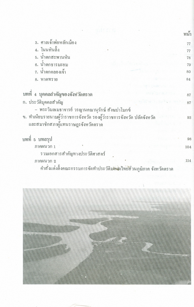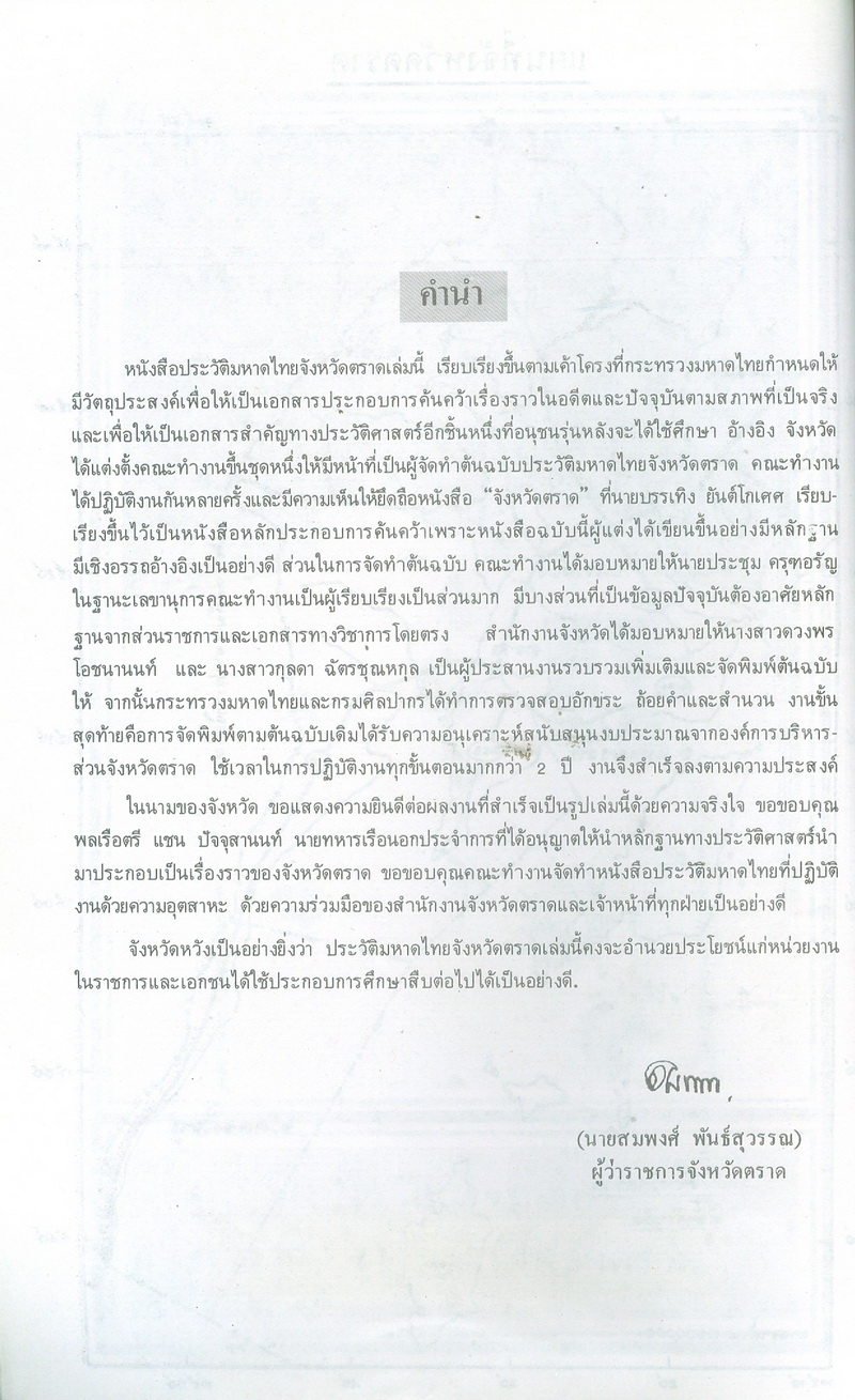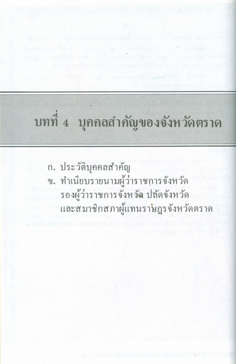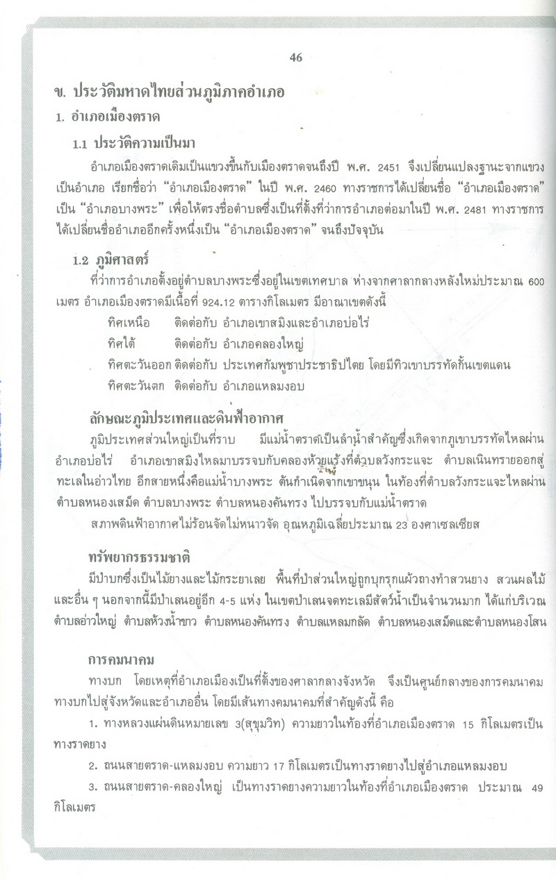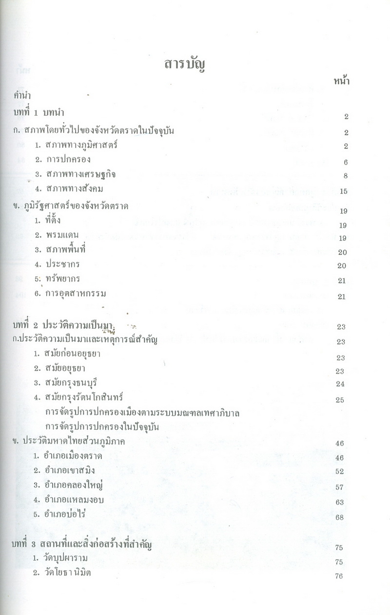 - หนังสือแนะนำเรื่องราวในอดีตและปัจจุบันของจังหวัดตราดตามเค้าโครงที่กระทรวงมหาดไทยได้กำหนด ซึ่งได้แก่ สภาพโดยทั่วไปของจังหวัดตราด ภูมิรัฐศาสตร์ของจังหวัดตราด ประวัติความเป็นมาในสมัยต่างๆ ประวัติมหาดไทยส่วนภูมิภาคในอำเภอต่างๆ สถานที่และสิ่งก่อสร้างที่สำคัญ และบุคคลสำคัญของจังหวัดตราด