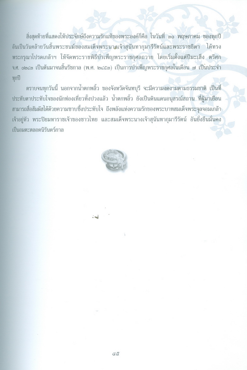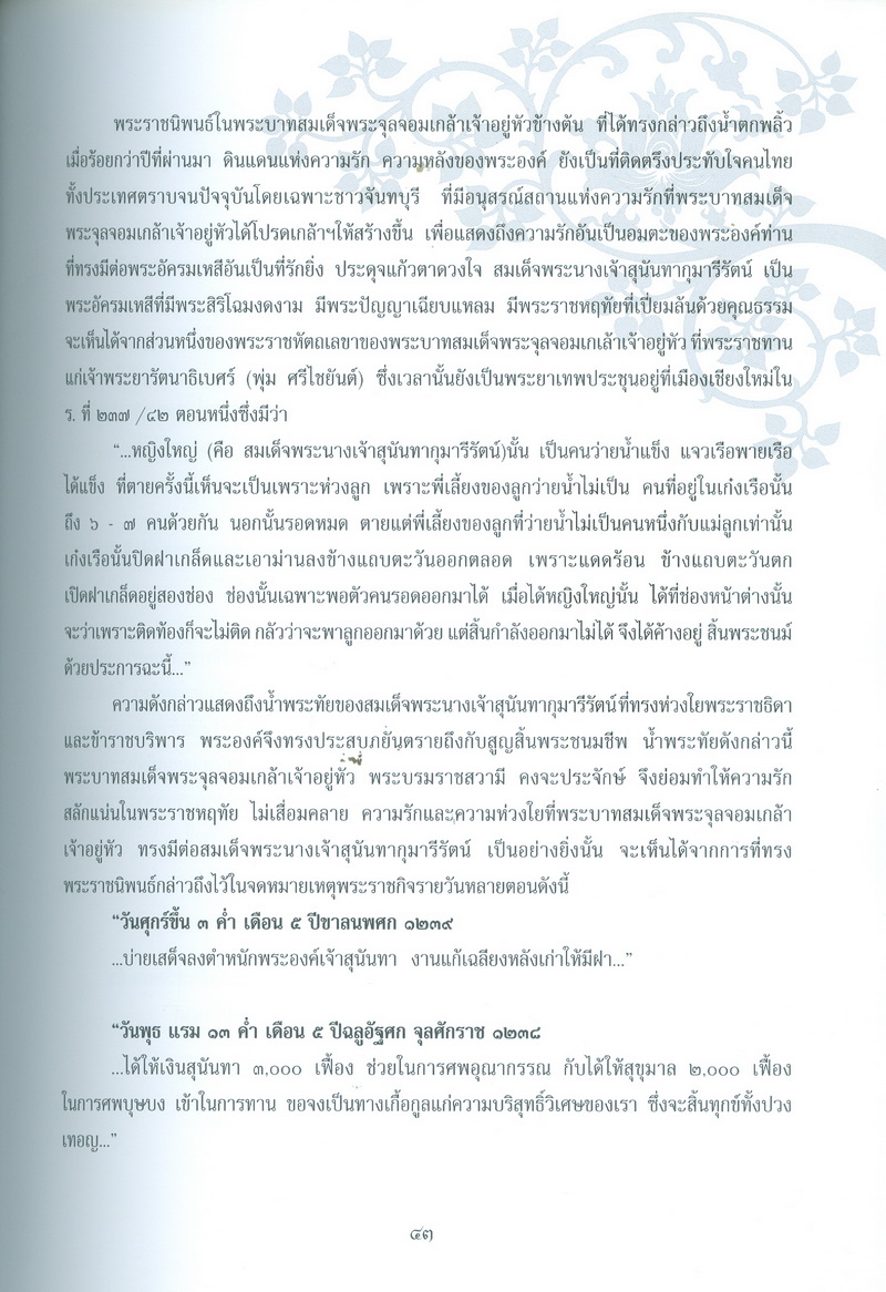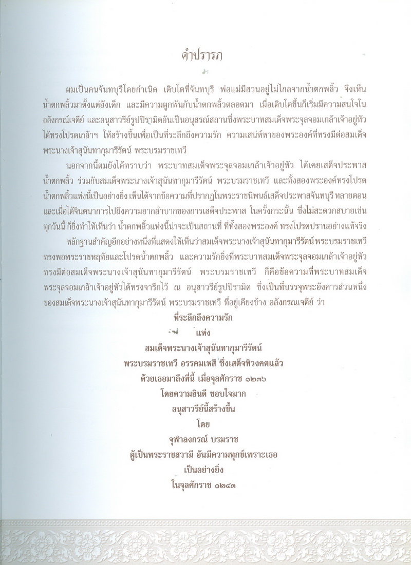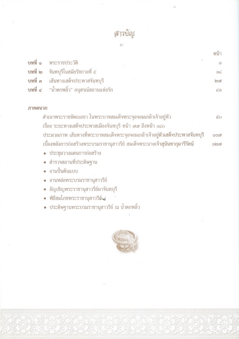 - หนังสือเล่มนี้ได้กล่าวถึงพระราชประวัติของสมเด็จพระนางเจ้าสุนันทากุมารีรัตน์พระบรมราชเทวีกับจังหวัดจันทบุรีในรัชสมัยพระบาทสมเด็จพระจุลจอมเกล้าเจ้าอยู่หัว และเรื่องราวการเสด็จประพาสเมืองจันทบุรีเมื่อจุลศักราช 1238 ความเป็นมาของอนุสรณ์สถานแห่งรักอมตะ ณ น้ำตกพลิ้ว และที่สำคัญคือ สำเนาพระราชหัตถเลขาระยะทางเสด็จประพาสจันทบุรีที่แสดงให้เห็นถึงพระมหากรุณาธิคุณที่พระองค์ทรงมีต่อชาวจันทบุรี