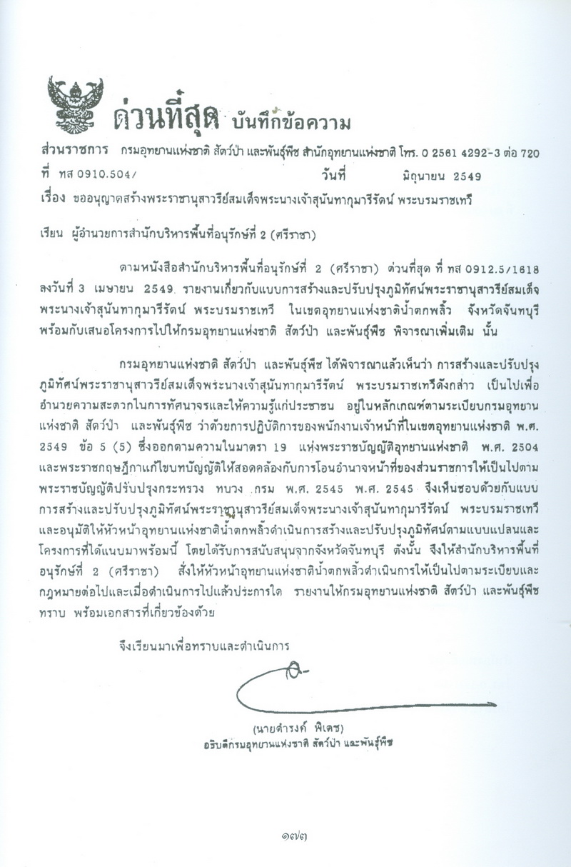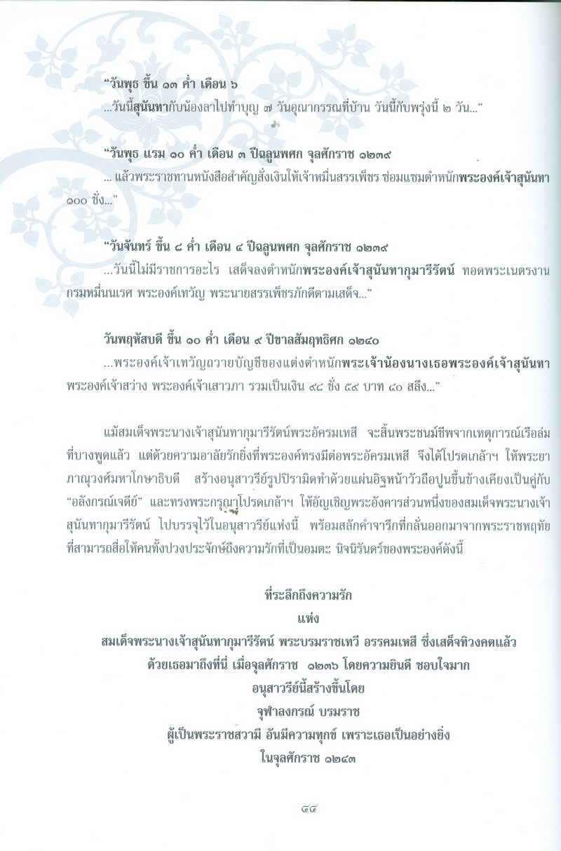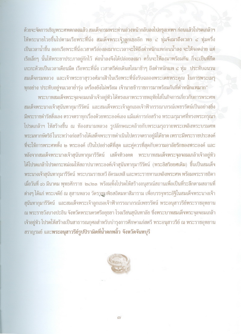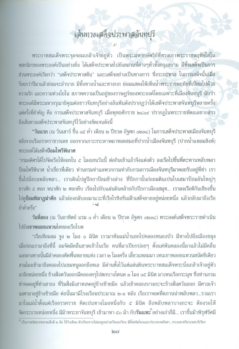 - หนังสือเล่มนี้ได้กล่าวถึงพระราชประวัติของสมเด็จพระนางเจ้าสุนันทากุมารีรัตน์พระบรมราชเทวีกับจังหวัดจันทบุรีในรัชสมัยพระบาทสมเด็จพระจุลจอมเกล้าเจ้าอยู่หัว และเรื่องราวการเสด็จประพาสเมืองจันทบุรีเมื่อจุลศักราช 1238 ความเป็นมาของอนุสรณ์สถานแห่งรักอมตะ ณ น้ำตกพลิ้ว และที่สำคัญคือ สำเนาพระราชหัตถเลขาระยะทางเสด็จประพาสจันทบุรีที่แสดงให้เห็นถึงพระมหากรุณาธิคุณที่พระองค์ทรงมีต่อชาวจันทบุรี