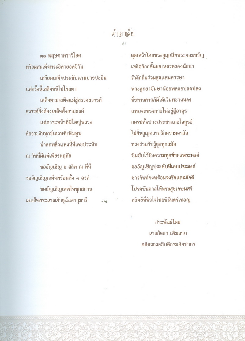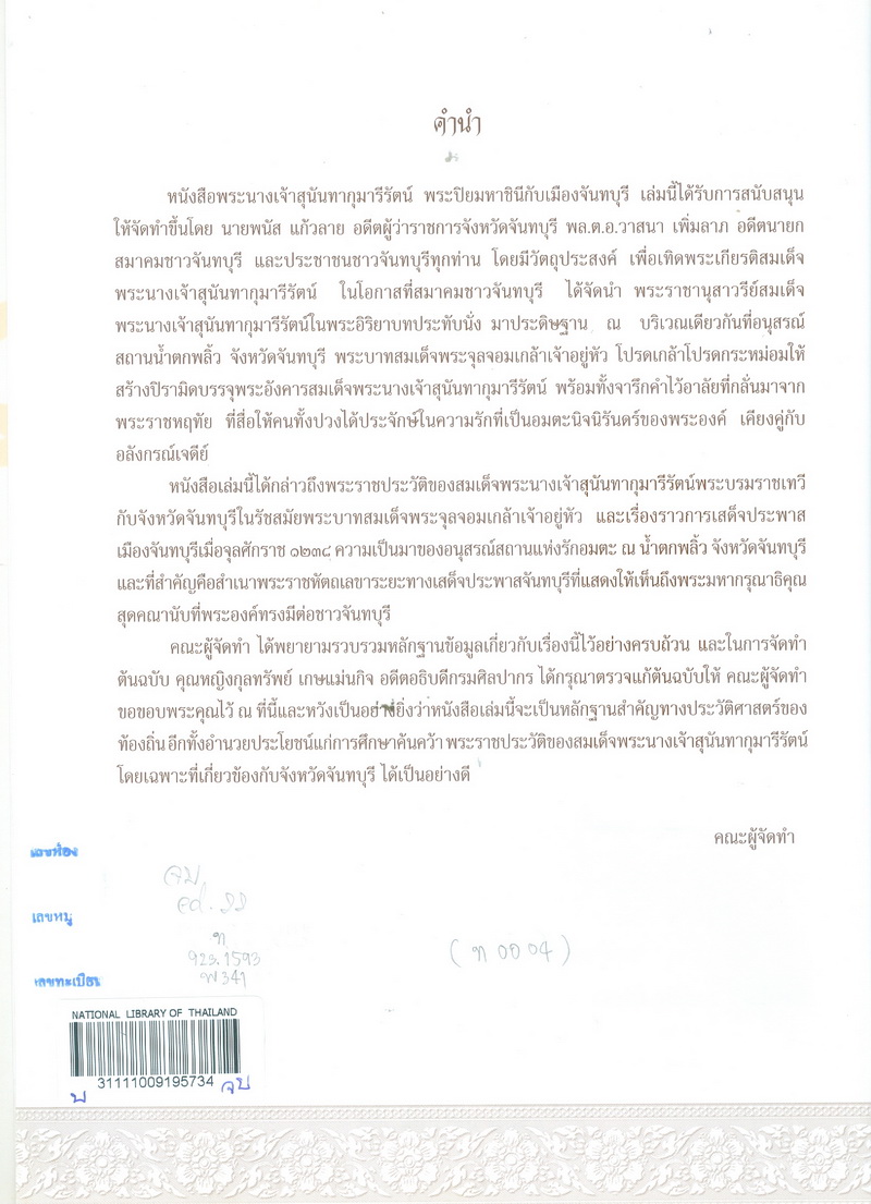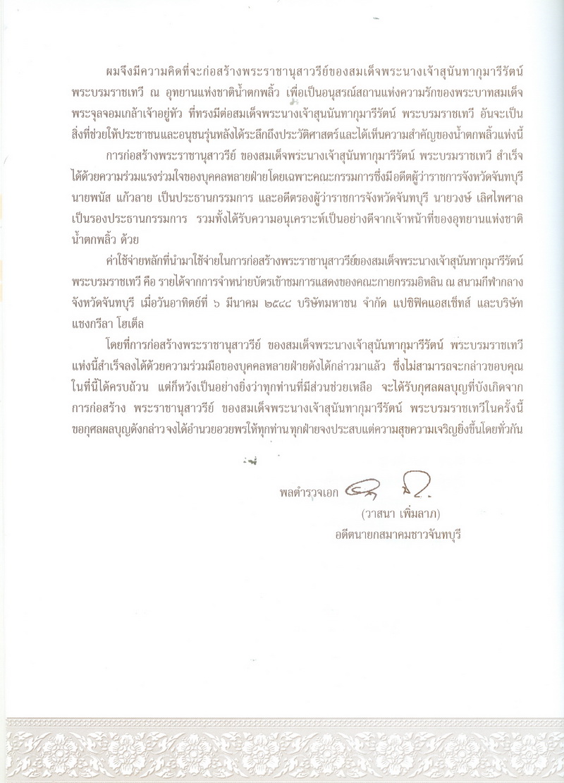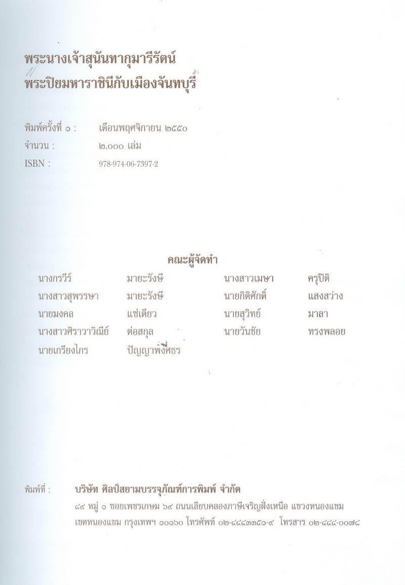 - พิมพ์เป็นที่ระลึกในการจัดสร้างพระราชานุสาวรีย์สมเด็จพระนางเจ้าสุนันทากุมารีรัตน์ ณ อุทยานแห่งชาติน้ำตกพลิ้ว จังหวัดจันทบุรี 20 มิถุนายน 2551