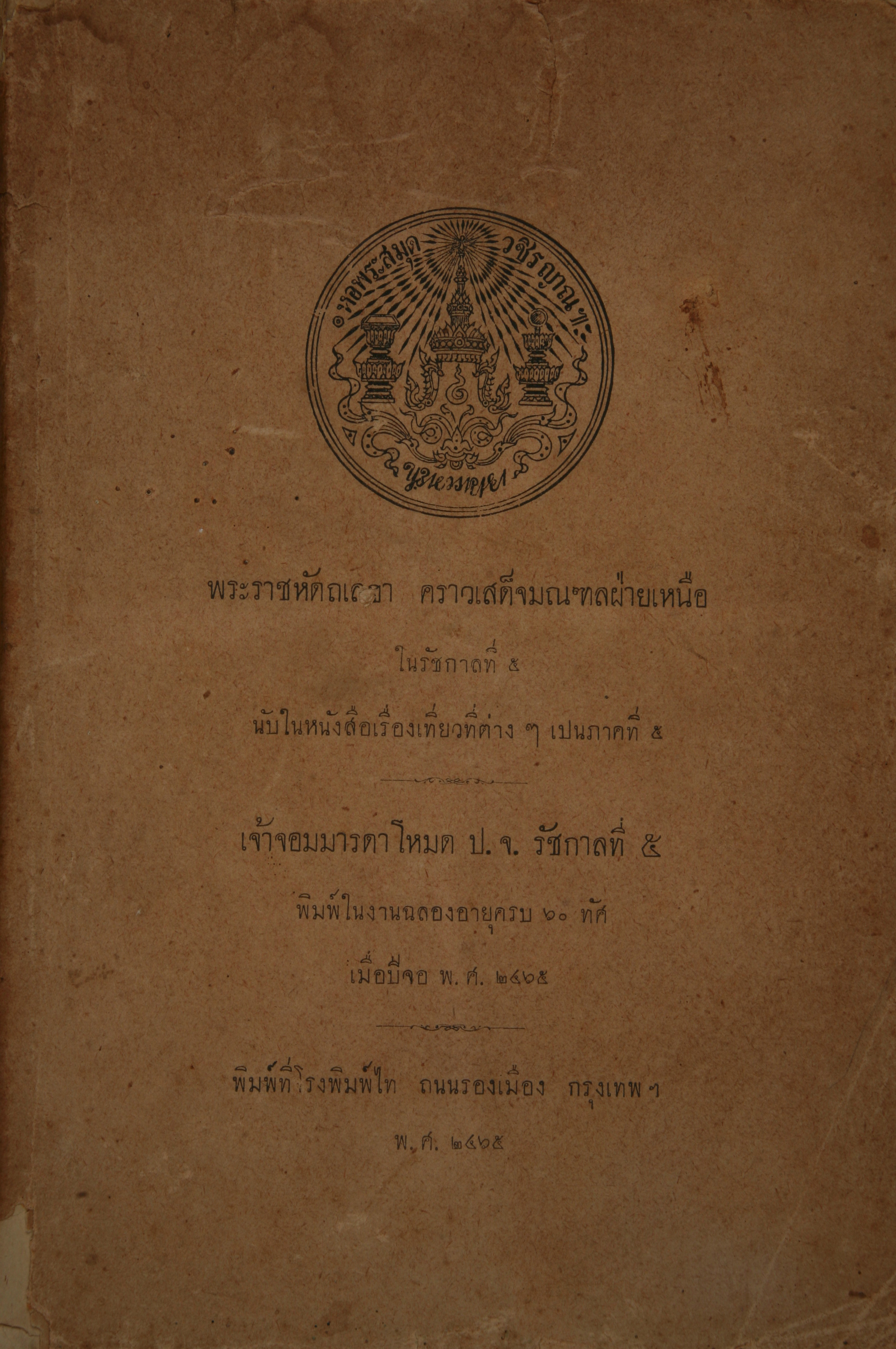 - ทรงพระราชนิพนธ์เป็นรายงานการเสด็จตรวจราชการมณฑลฝ่ายเหนือ เมื่อพ.ศ. ๒๔๔๔ พระราชทานไปยังที่ประชุมผู้สำเร็จราชการรักษาพระนคร เสด็จโดยทางรถไฟจากกรุงเทพฯ ถึงพระราชวังบางปะอิน ต่อจากนั้นทรงเรือพระที่นั่งไปตามแม่น้ำเจ้าพระยาจนถึงเมืองฝาง เมืองอุตรดิฐ ทรงเล่าเรื่องต่าง ๆ ตามทางที่เสด็จผ่านการเสด็จคราวนี้มีการพระราชทานพระแสงราชศาสตราและพระราชทานเสมาแก่เด็กชาวเมืองเป็นครั้งแรก เหตุการณ์ที่สำคัญคือ โปรดเกล้าฯ ให้ทรงหล่อพระพุทธชินราชจำลอง ที่เมืองพิษณุโลก เพื่อนำมาเป็นพระประธานในพระอุโบสถวัดเบญจมบพิตร หนังสือเรื่องนี้นับอยู่ในเรื่องเที่ยวที่ต่าง ๆ ภาคที่ ๕