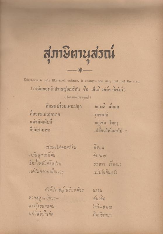 - ภายในเล่มแบ่งเนื้อหาออกเป็น 2 ภาค คือ ภาคแรกคือศิลปวิทยาการ ที่เกี่ยวกับสุภาษิตานุสรณ์ เรื่องพระนารายณ์ สาส์นสมเด็จ เรื่องสุริยพันธุ์ (ตอนที่28 ต่อ) เรื่องกรุงสยามเมื่อ 250 ปีล่วงมาแล้ว บทความเรื่องไทย ตอนที่19 สุโขทัยคืออะไร สำรวจศิลาจารึกในแง่อวิชชา (ตอนที่2) และเรื่องความเป็นมาแห่งพระพุทธศาสนาในประเทศไทย