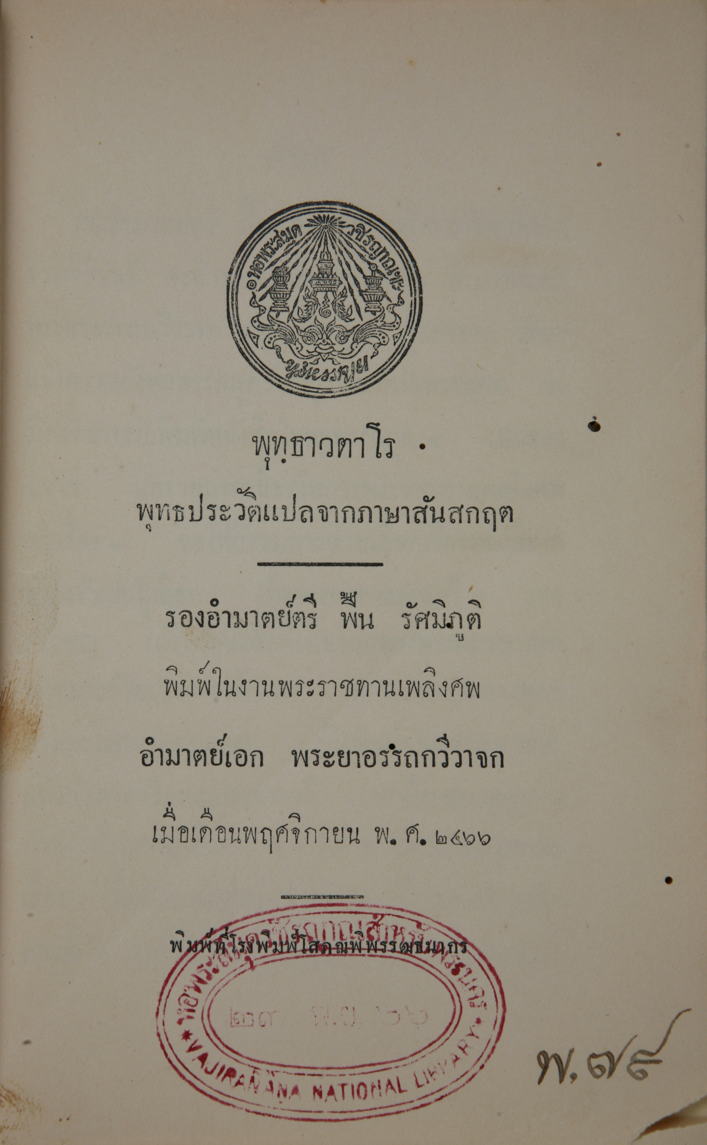 - พิมพ์ในงานพระราชทานเพลิงศพ อำมาตย์เอก พระยาอรรถกวีวาจก