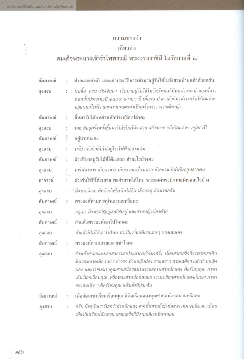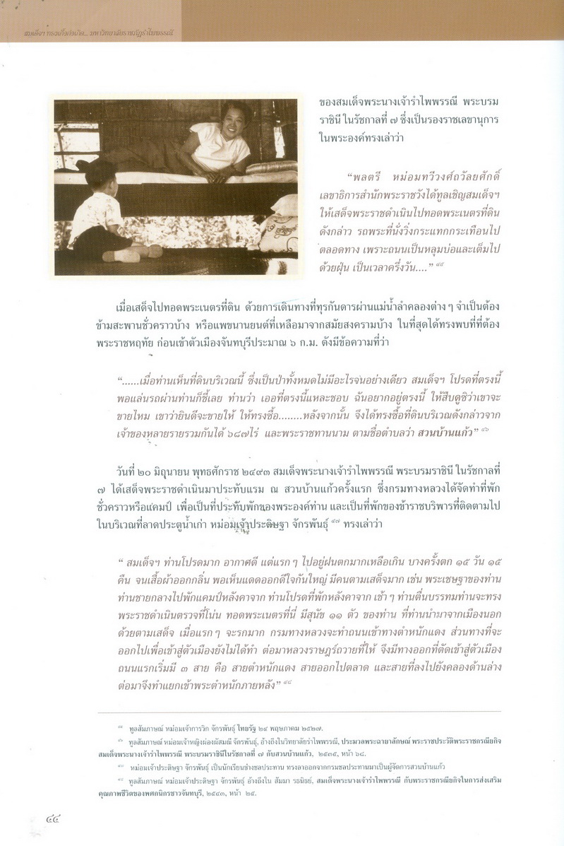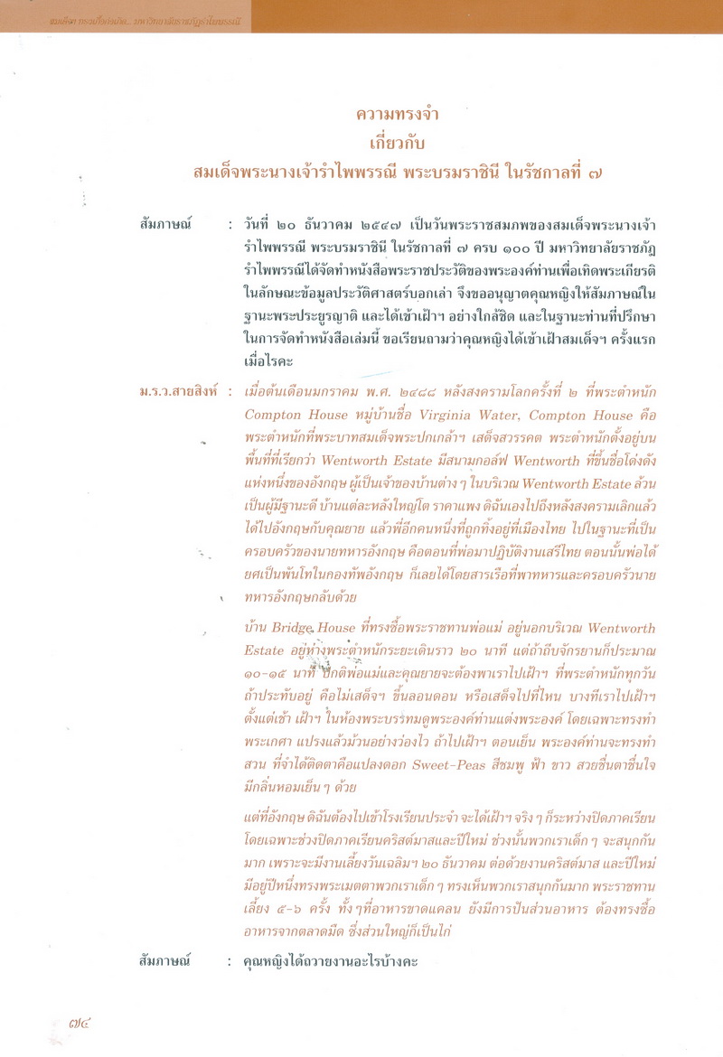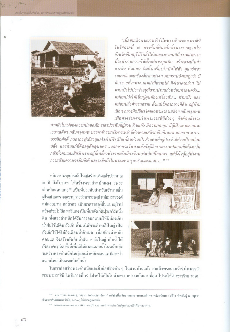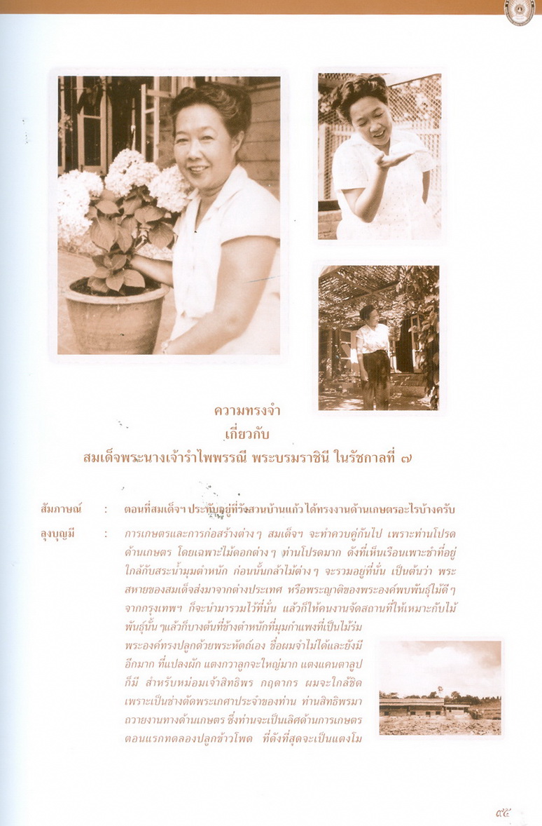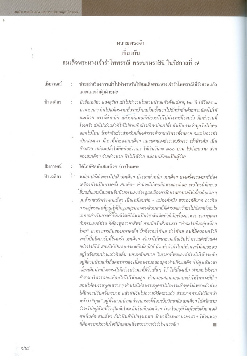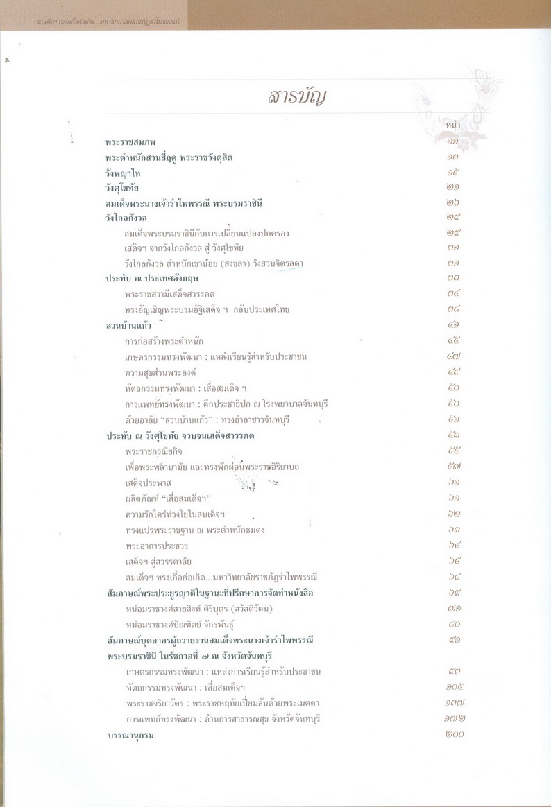 - เป็นพระราชประวัติ สมเด็จพระนางเจ้ารำไพพรรณี พระบรมราชินีในรัชกาลที่7 ในลักษณะข้อมูลประวัติศาสตร์บอกเล่า โดยเริ่มตั้งแต่พระราชสมภพ เสด๊จไปประทับที่พระตำหนักสวนสี่ฤดู ทรงอภิเษกสมรสกับพระบาทสมเด็จพระปกเกล้าเจ้าอยู่หัวรัชกาลที่7 และประทับอยู่ที่พระตำหนักวังศุโขทัย มีการเปลี่ยนแปลงการปกครองพระราชสวามีเสด็จสวรรคต สวนบ้านแก้ว และประทับ ณ วังศุโขทัยจวบจนเสด็จสวรรคต ต่อจากนั้นเป็นบทสัมภาษณ์พระประยูรญาติในฐานะที่ปรึกษา การจัดการหนังสือ สัมภาษณ์บุคลาผู้ถวายงานสมเด็จพระนางเจ้ารำไพพรรณี ณ จังหวัดจันทบุรี
