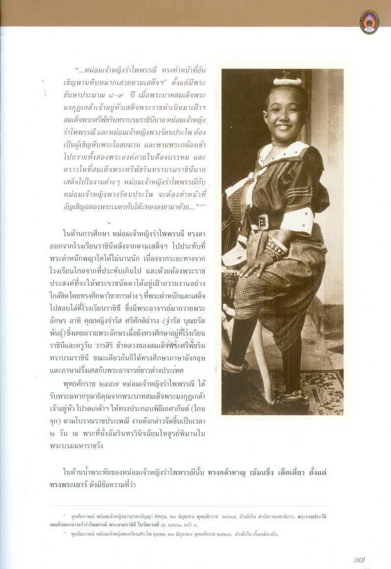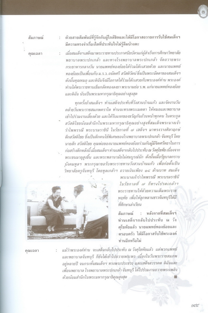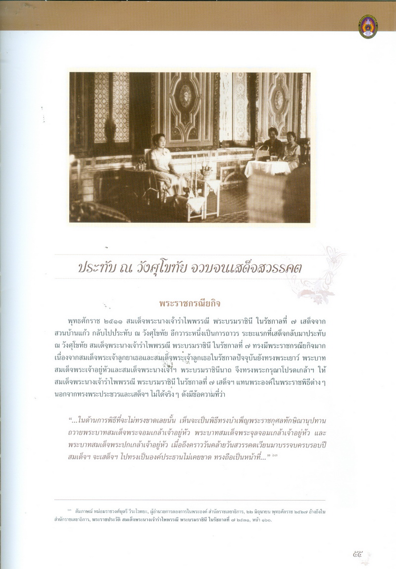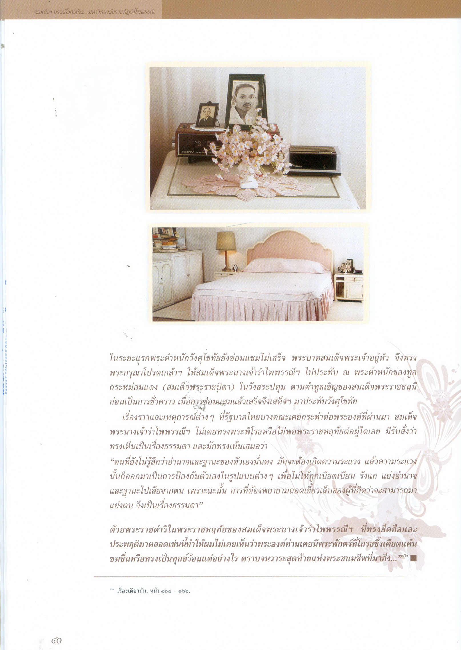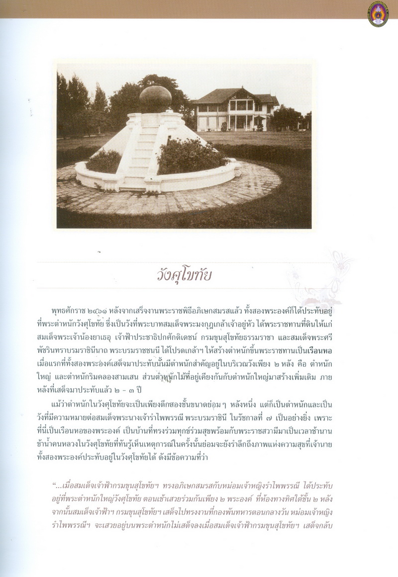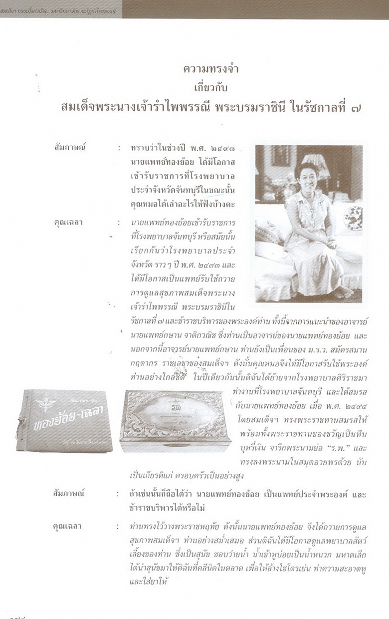 - เป็นพระราชประวัติ สมเด็จพระนางเจ้ารำไพพรรณี พระบรมราชินีในรัชกาลที่7 ในลักษณะข้อมูลประวัติศาสตร์บอกเล่า โดยเริ่มตั้งแต่พระราชสมภพ เสด๊จไปประทับที่พระตำหนักสวนสี่ฤดู ทรงอภิเษกสมรสกับพระบาทสมเด็จพระปกเกล้าเจ้าอยู่หัวรัชกาลที่7 และประทับอยู่ที่พระตำหนักวังศุโขทัย มีการเปลี่ยนแปลงการปกครองพระราชสวามีเสด็จสวรรคต สวนบ้านแก้ว และประทับ ณ วังศุโขทัยจวบจนเสด็จสวรรคต ต่อจากนั้นเป็นบทสัมภาษณ์พระประยูรญาติในฐานะที่ปรึกษา การจัดการหนังสือ สัมภาษณ์บุคลาผู้ถวายงานสมเด็จพระนางเจ้ารำไพพรรณี ณ จังหวัดจันทบุรี