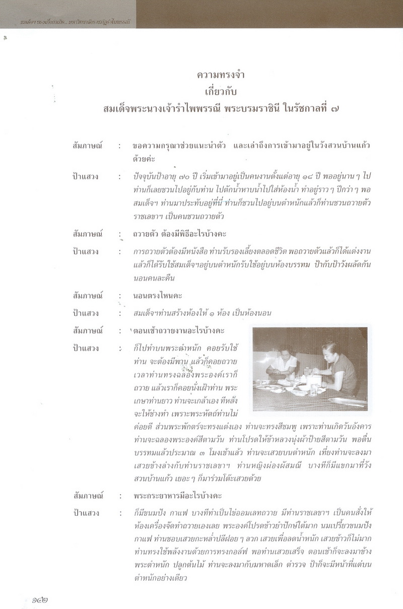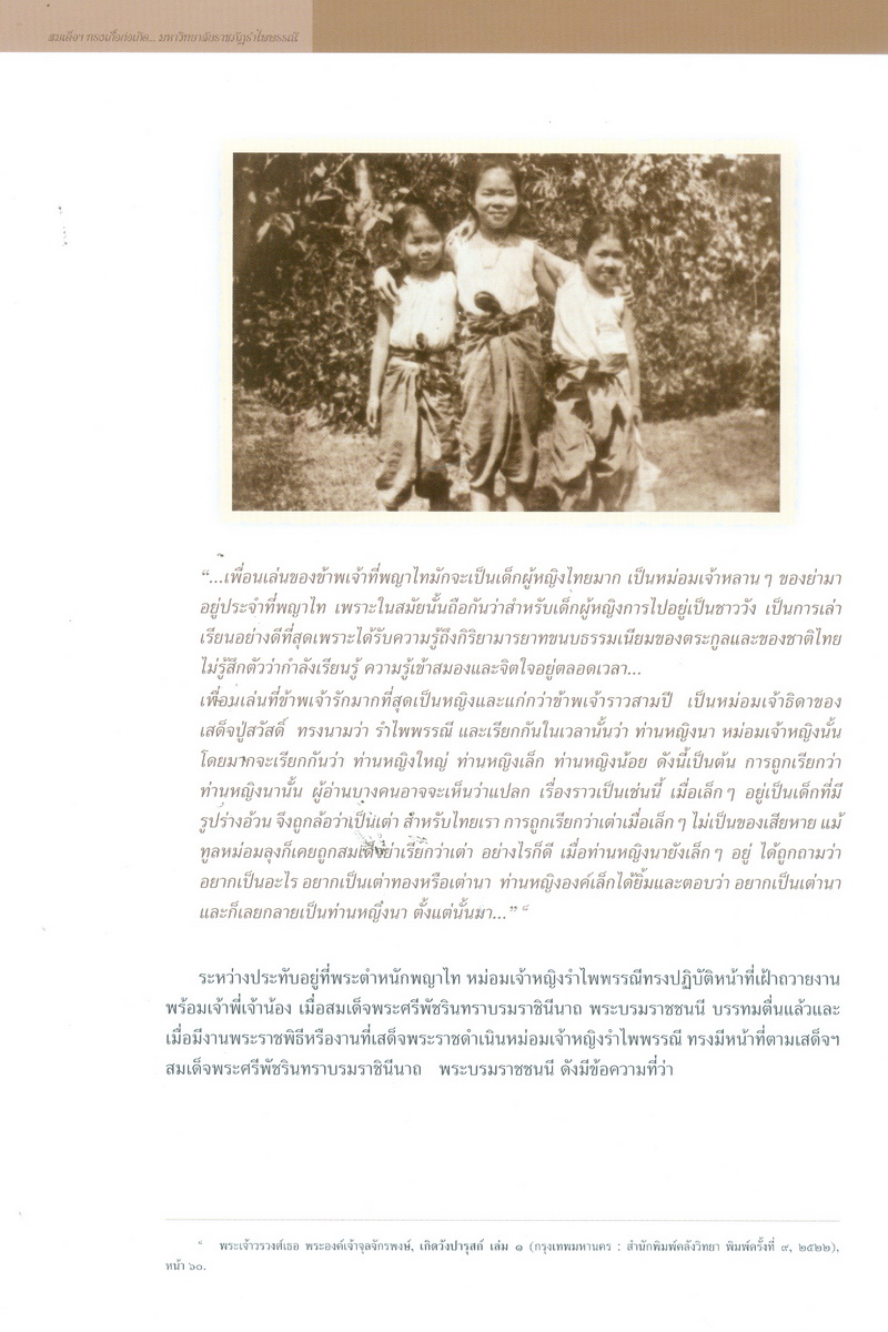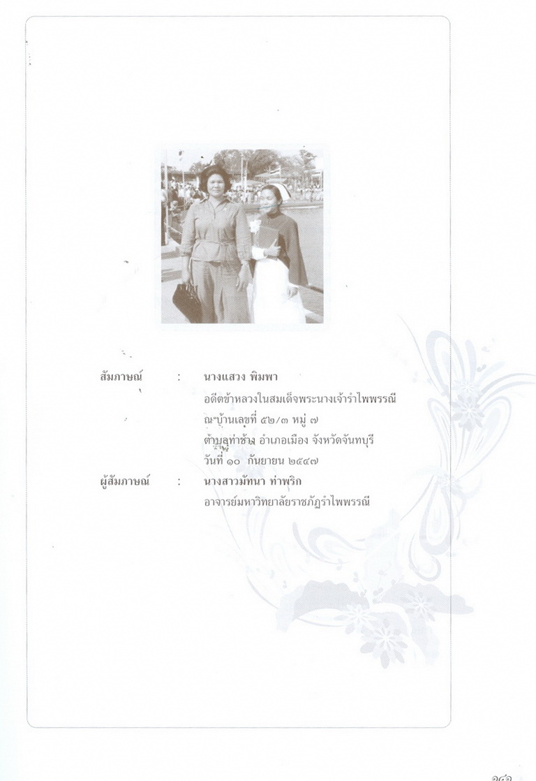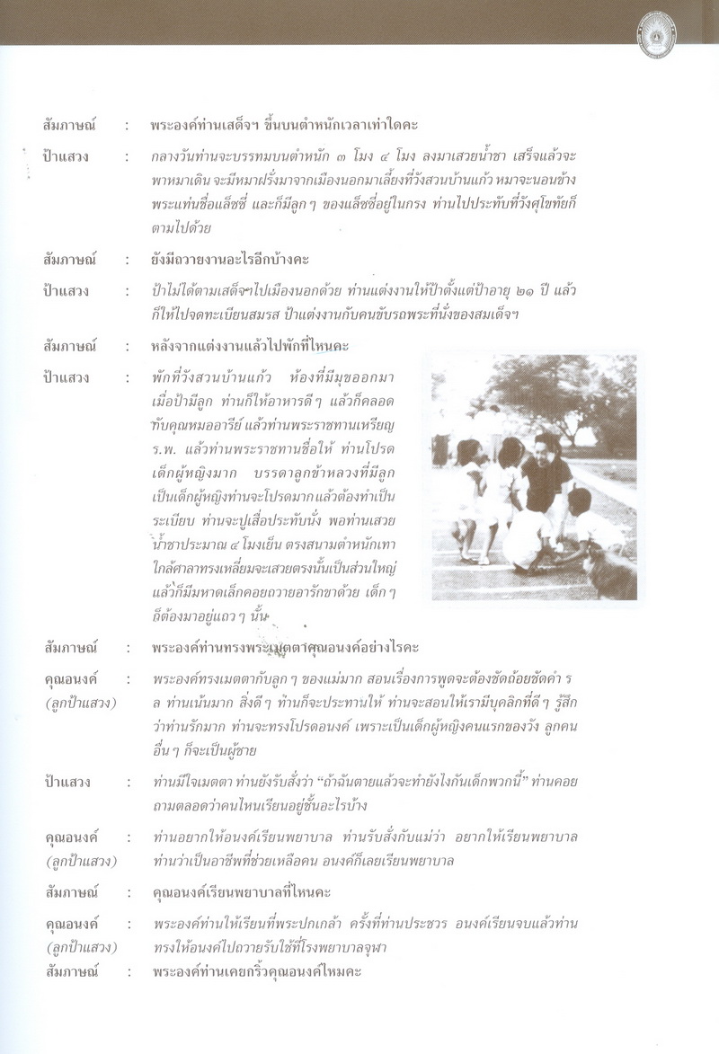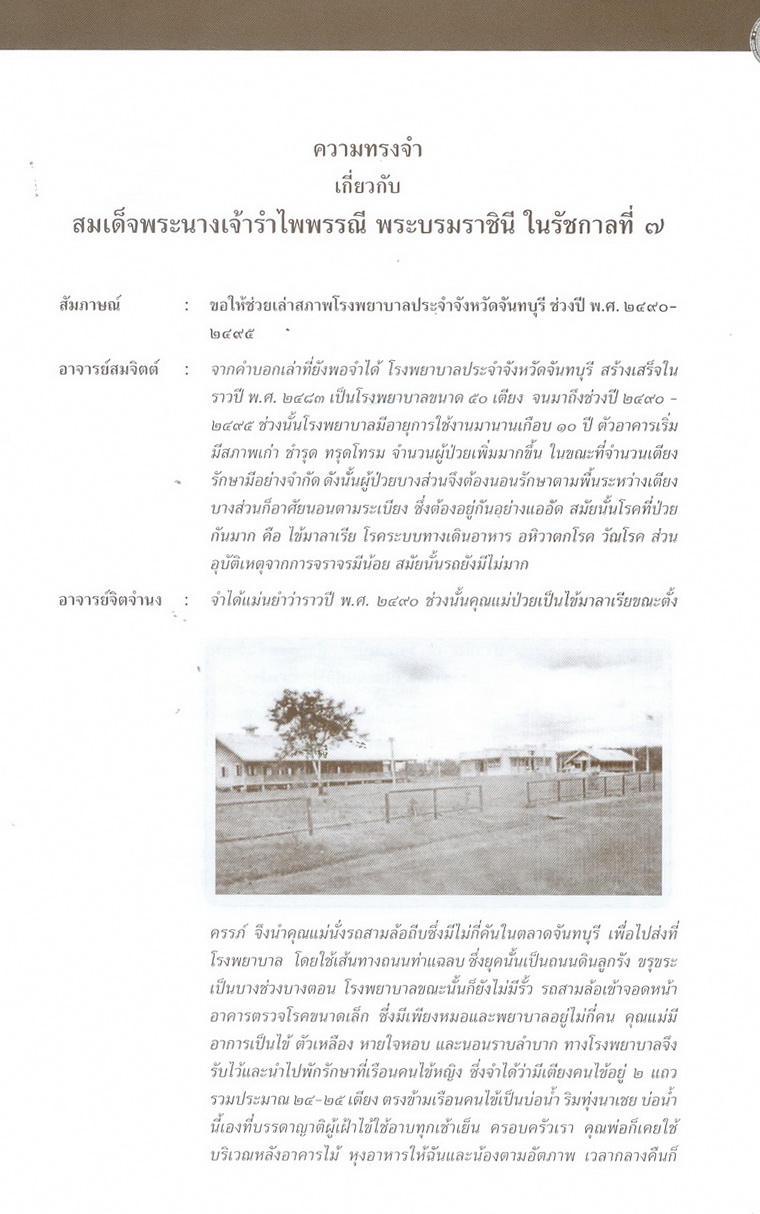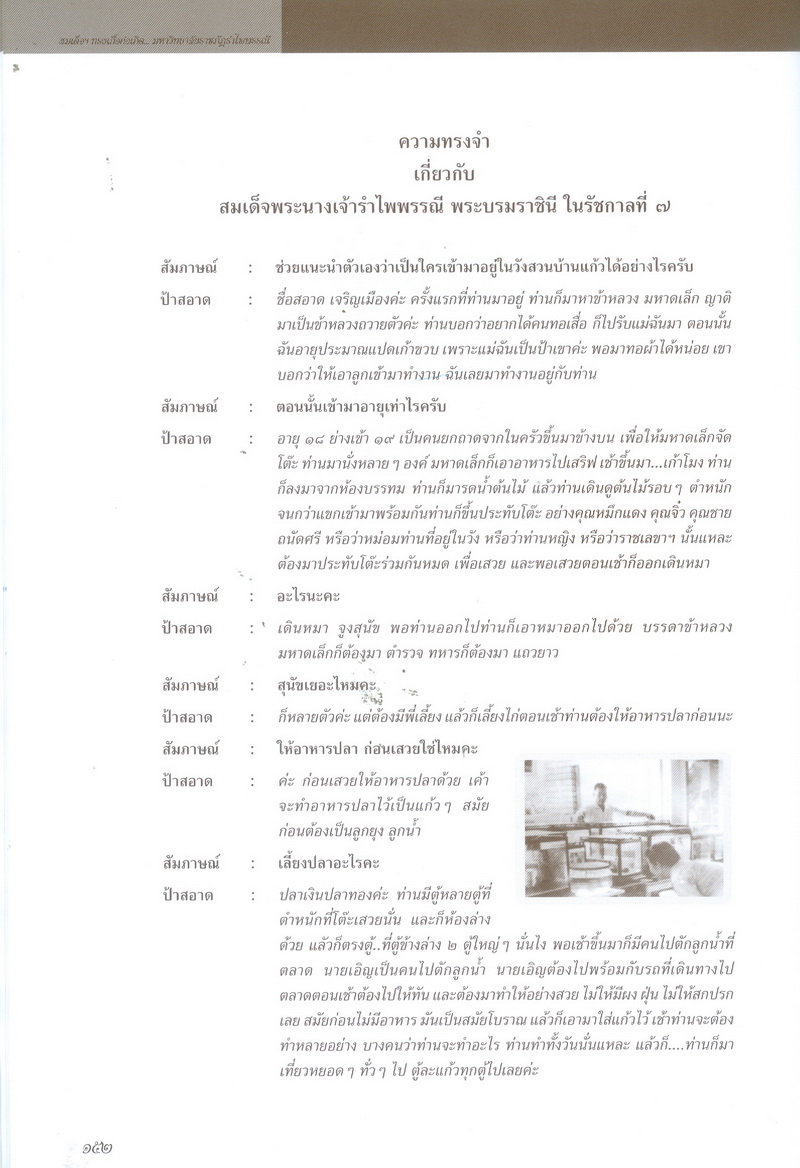 - เป็นพระราชประวัติ สมเด็จพระนางเจ้ารำไพพรรณี พระบรมราชินีในรัชกาลที่7 ในลักษณะข้อมูลประวัติศาสตร์บอกเล่า โดยเริ่มตั้งแต่พระราชสมภพ เสด๊จไปประทับที่พระตำหนักสวนสี่ฤดู ทรงอภิเษกสมรสกับพระบาทสมเด็จพระปกเกล้าเจ้าอยู่หัวรัชกาลที่7 และประทับอยู่ที่พระตำหนักวังศุโขทัย มีการเปลี่ยนแปลงการปกครองพระราชสวามีเสด็จสวรรคต สวนบ้านแก้ว และประทับ ณ วังศุโขทัยจวบจนเสด็จสวรรคต ต่อจากนั้นเป็นบทสัมภาษณ์พระประยูรญาติในฐานะที่ปรึกษา การจัดการหนังสือ สัมภาษณ์บุคลาผู้ถวายงานสมเด็จพระนางเจ้ารำไพพรรณี ณ จังหวัดจันทบุรี