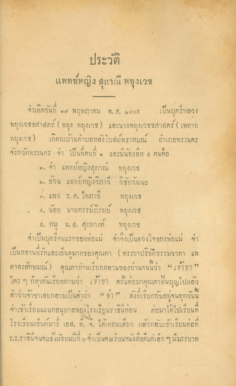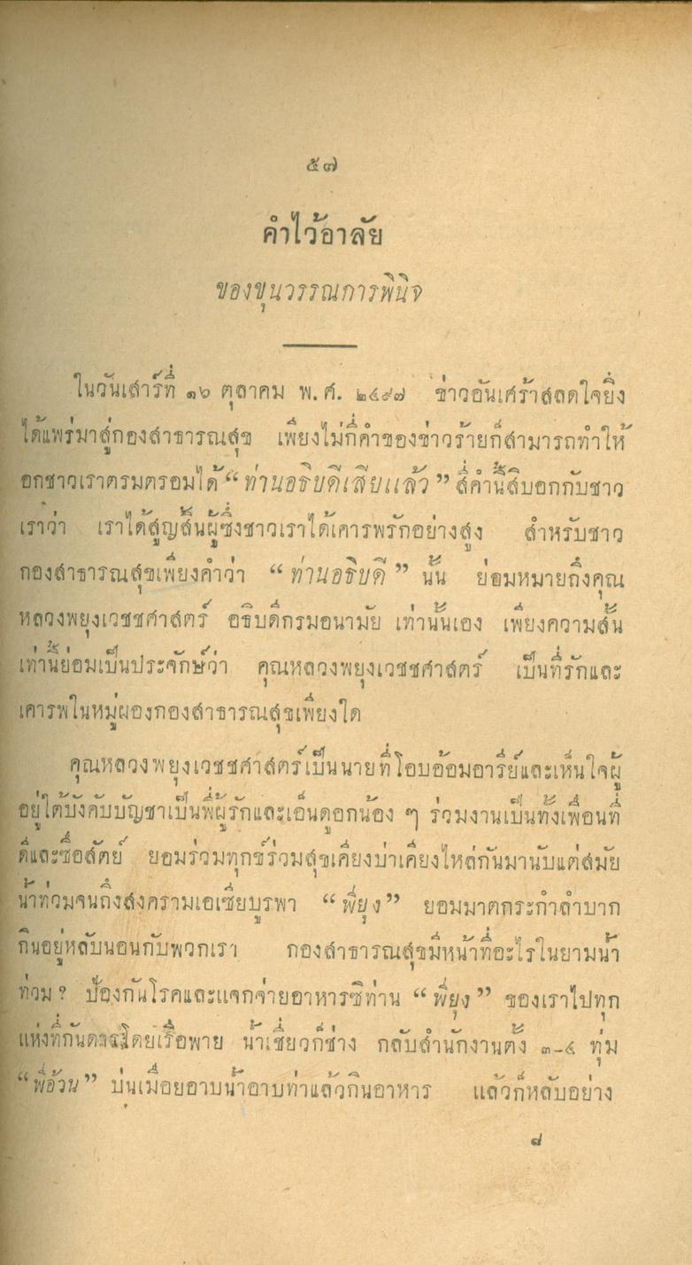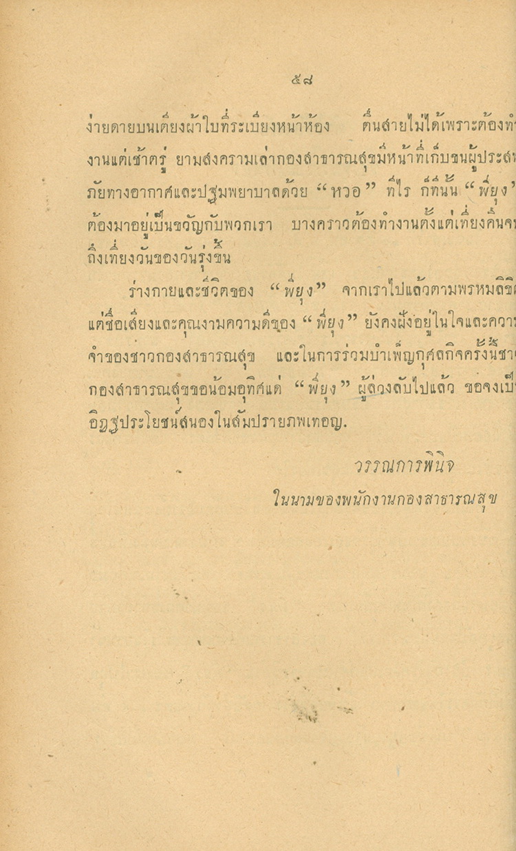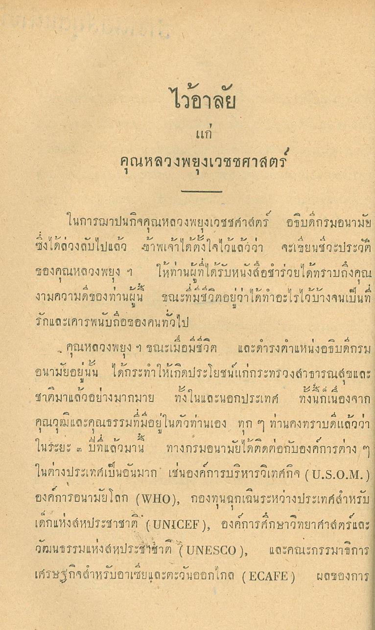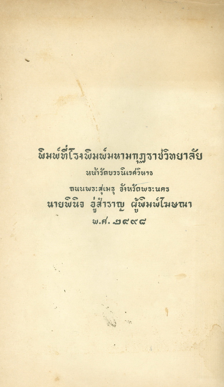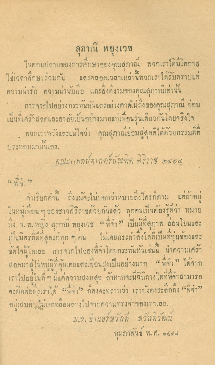 - พิมพ์แจกในงานพระราชทานเพลิงศพหลวงพยุงเวชชศาสตร์(พยุง พยุงเวช) และแพทย์หญิงสภาณี พยุงเวช วันทีี่่ี 12 กุมภาพันธ์ 2498