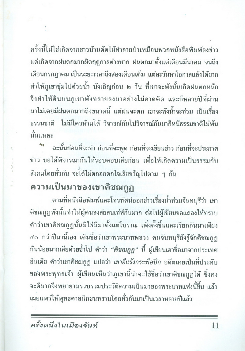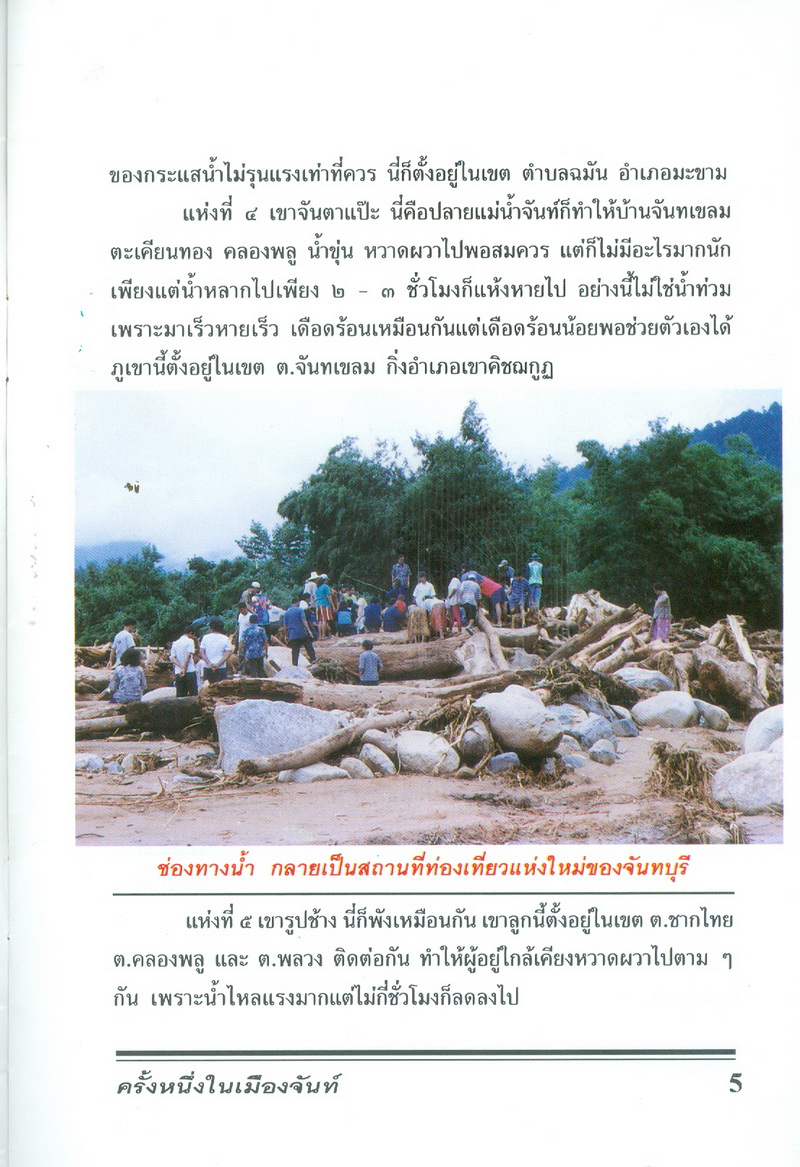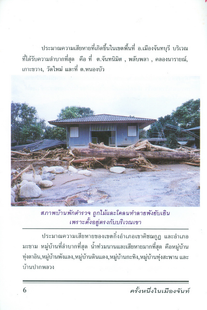 - เนื้อหาประกอบด้วย ประมวลความเป็นมาของอุทกภัยของจันทบุรี ลำดับเหตุการณ์น้ำท่วม ตั้งแต่อดีตจนถึงปัจจุบัน มีภาพประกอบ ความเป็นมาเขาคิชฌกูฏ สถานที่ศักดิ์สิทธิ์ ท่ี่พุทธศาสนิกชนให้ความเคารพเลื่อมใส.