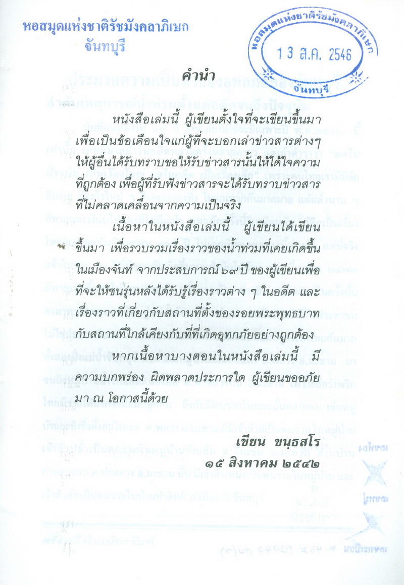 พระครูธรรมสรคุณ(ท่านพ่อเขียน), “ครั้งหนึ่งในเมืองจันท์อุทกภัยน้ำท่วม,” D-Library | National Library of Thailand, accessed April 2, 2026, http://164.115.27.97/digital2024/items/show/4769.