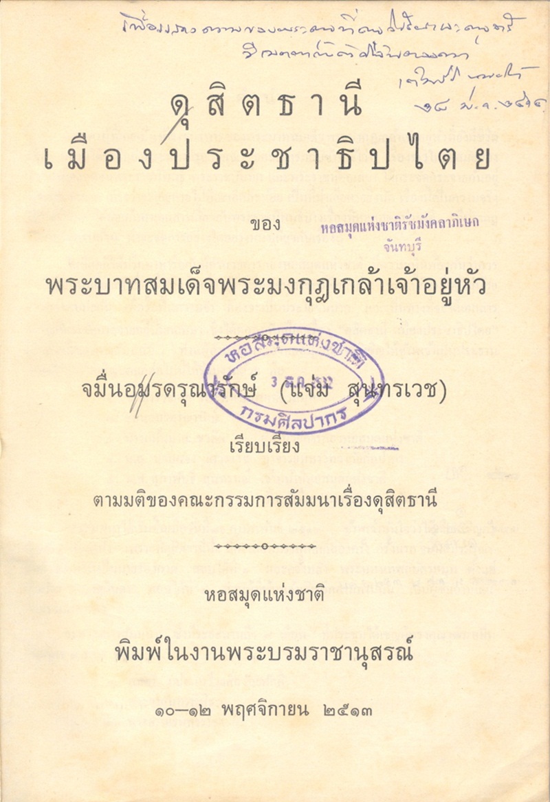 จมื่นอมรดรุณารักษ์ (แจ่ม สุนทรเวช), “ดุสิตธานี เมืองประชาธิปไตย,” D-Library | National Library of Thailand, accessed April 2, 2026, http://164.115.27.97/digital2024/items/show/4793.