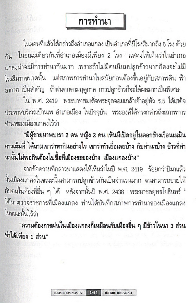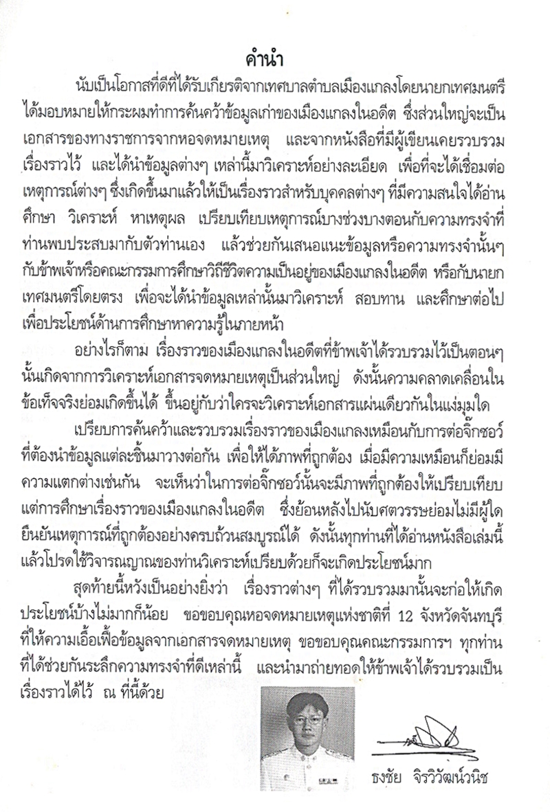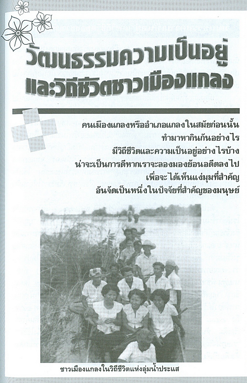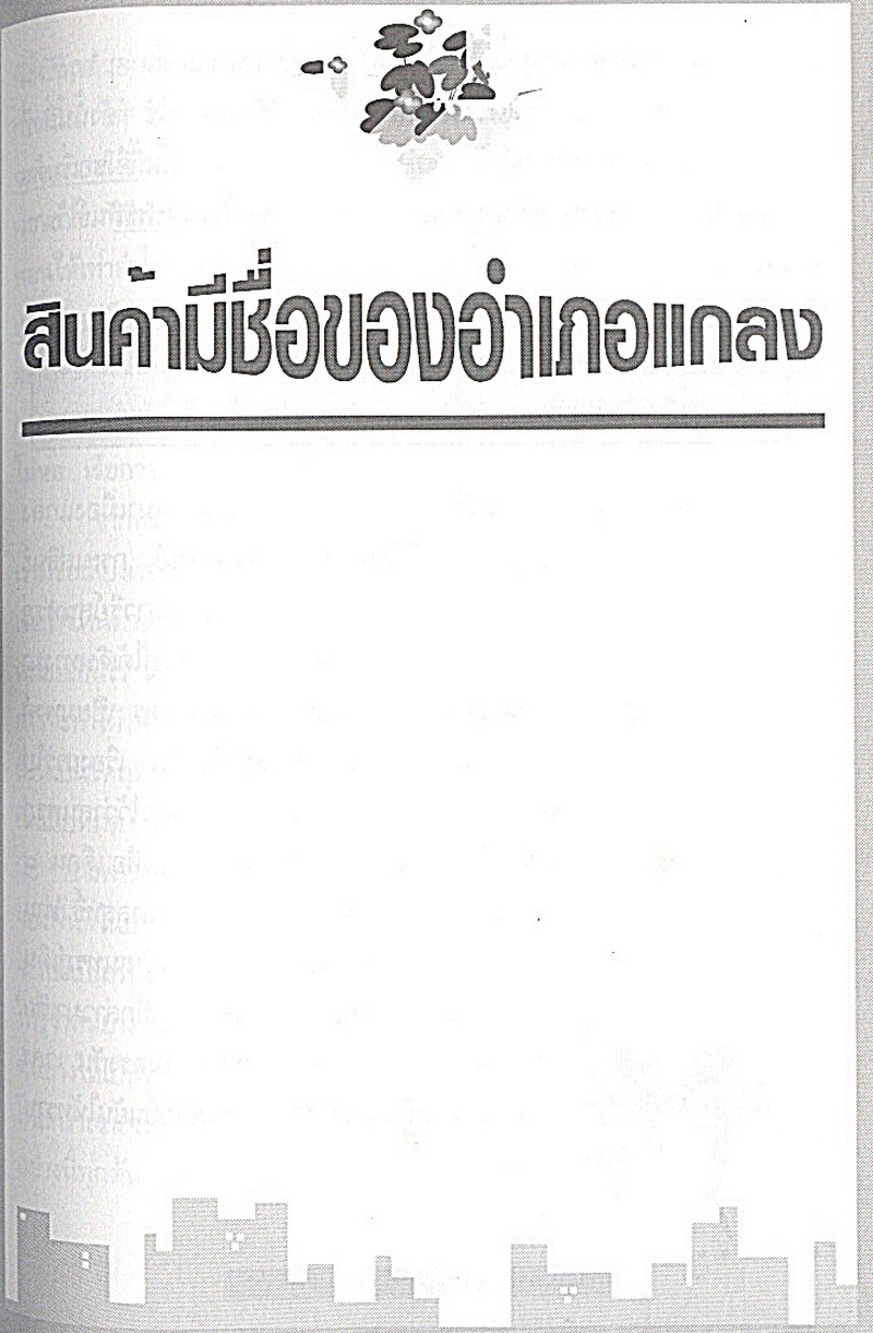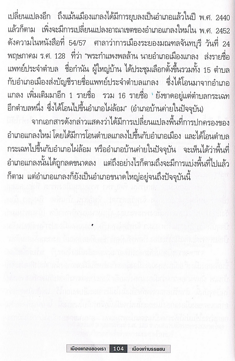 - เป็นหนังสือที่ผู้เขียนหลายท่านได้ทำการศึกษาค้นคว้า รวบรวมและเรียบเรียงในเรื่องต่างๆ ด้านต่างๆที่สำคัญของเมืองแกลงในอดีต ตั้งแต่ประวัติความเป็นมา เจ้าเมือง วิถีชีวิตความเป็นอยู่ของชาวแกลง ประเพณี วัฒนธรรม การค้า การขนส่ง เป็นต้น ท้ายเล่มมีตัวอย่างหนังสือราชการจากศาลากลางจังหวัดระยอง