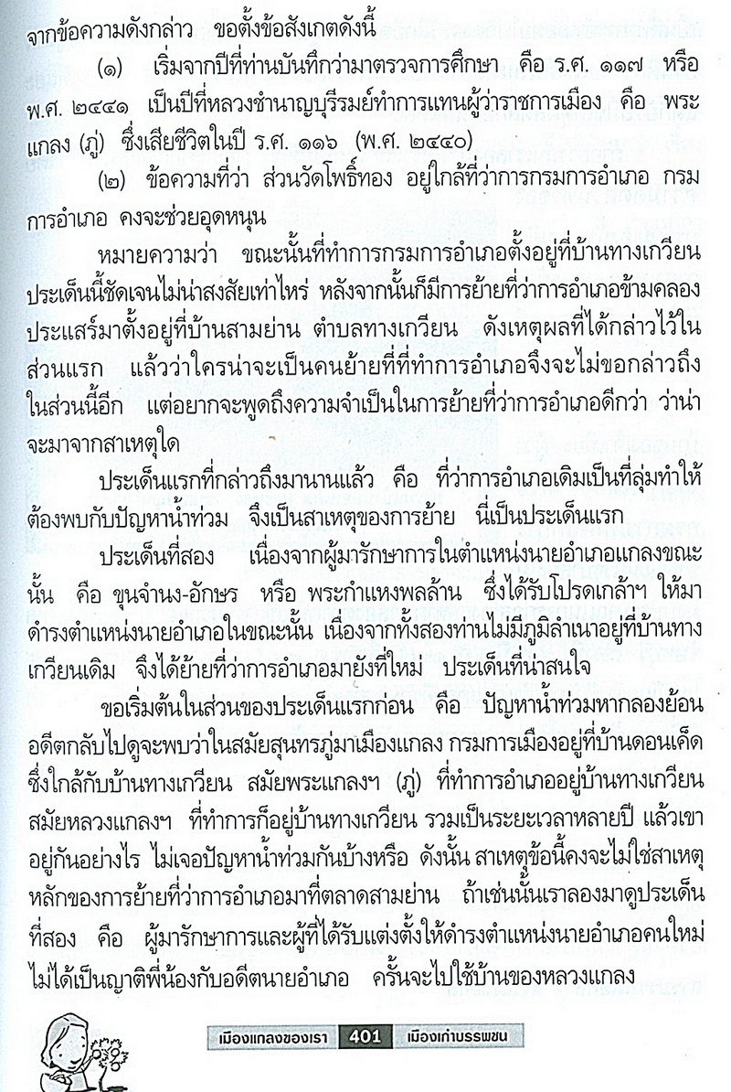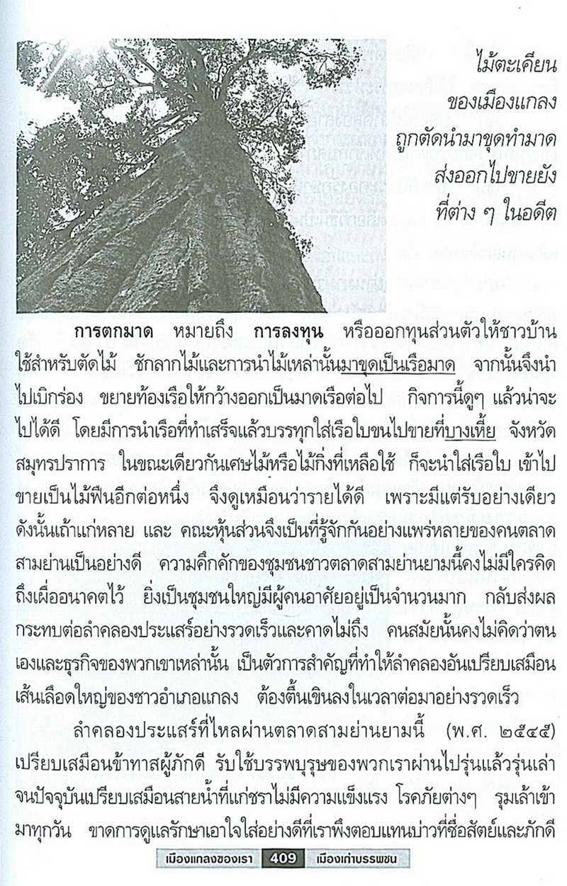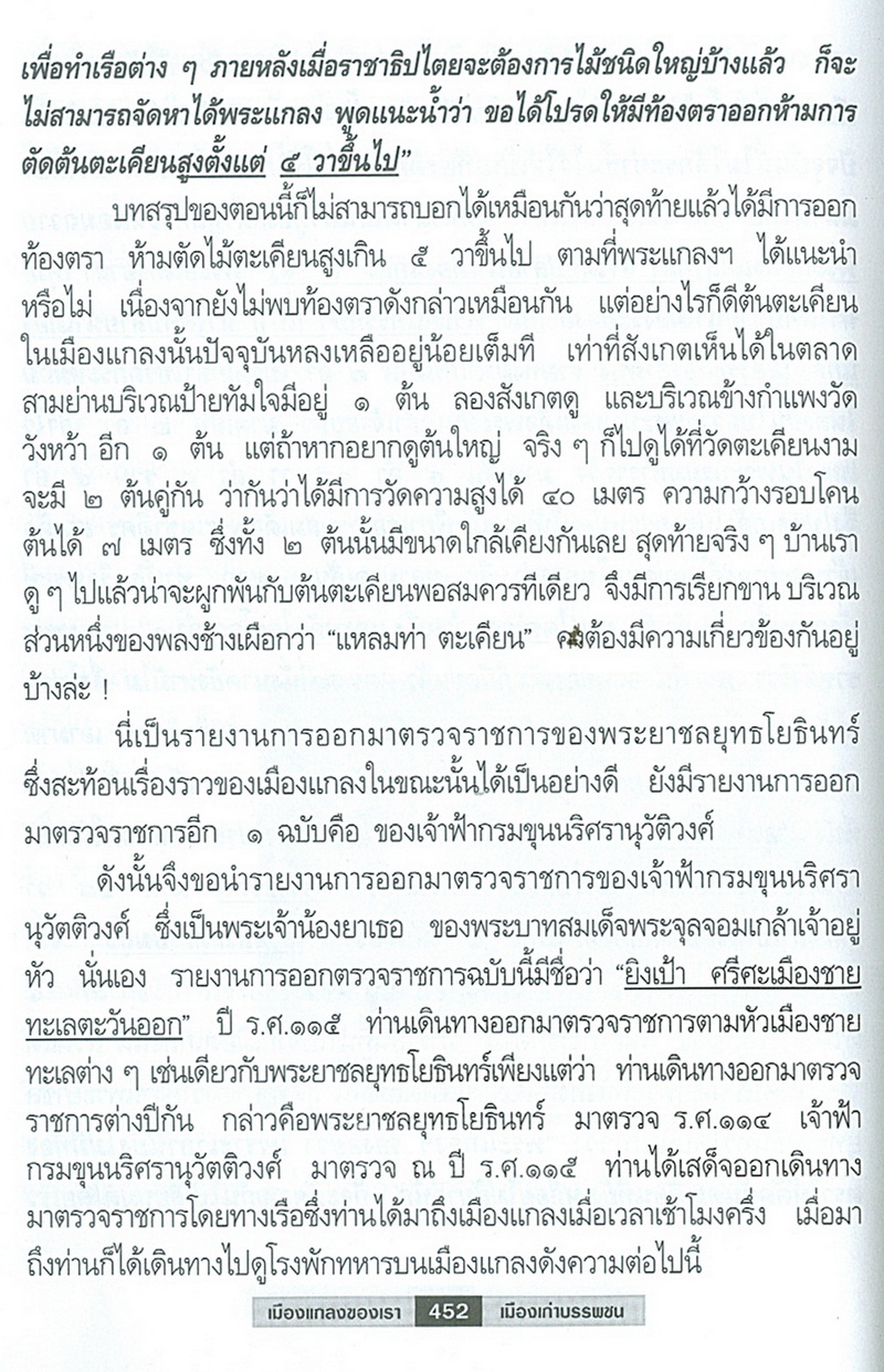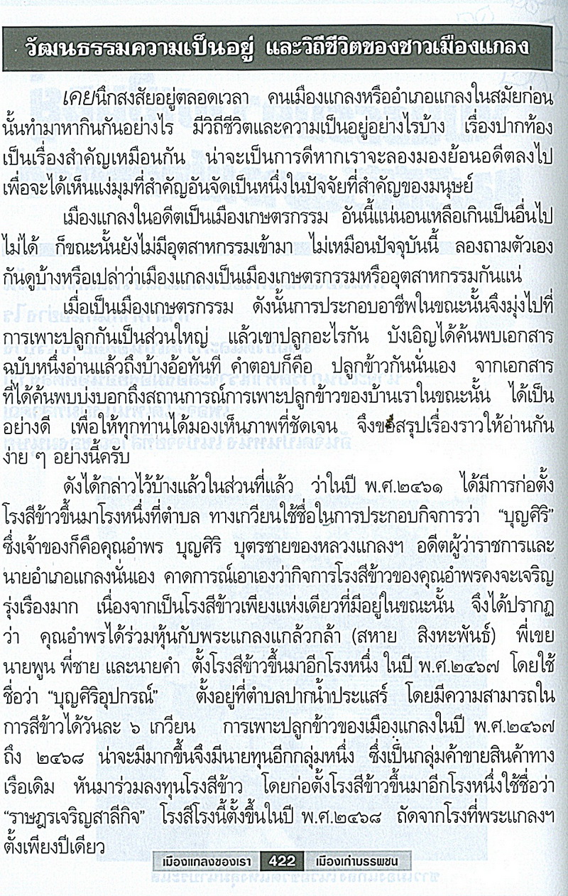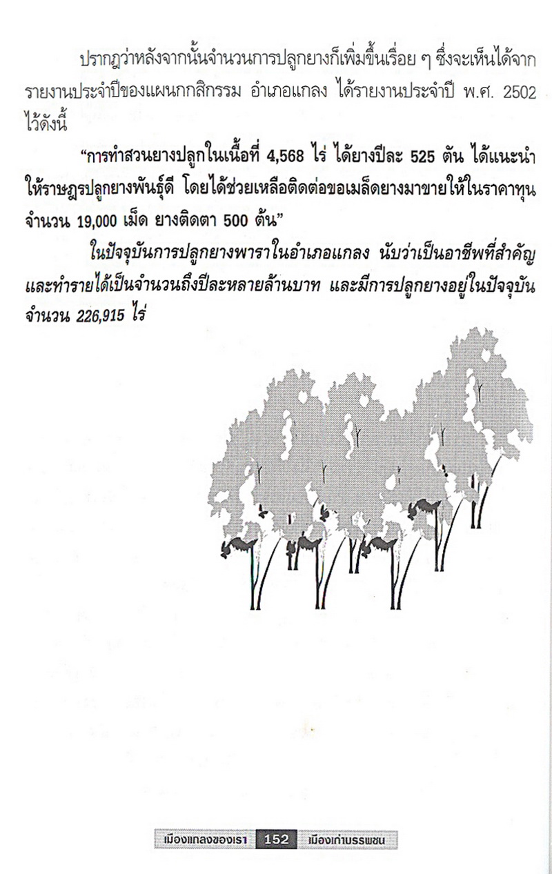 - เป็นหนังสือที่ผู้เขียนหลายท่านได้ทำการศึกษาค้นคว้า รวบรวมและเรียบเรียงในเรื่องต่างๆ ด้านต่างๆที่สำคัญของเมืองแกลงในอดีต ตั้งแต่ประวัติความเป็นมา เจ้าเมือง วิถีชีวิตความเป็นอยู่ของชาวแกลง ประเพณี วัฒนธรรม การค้า การขนส่ง เป็นต้น ท้ายเล่มมีตัวอย่างหนังสือราชการจากศาลากลางจังหวัดระยอง