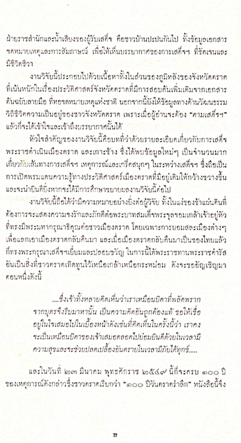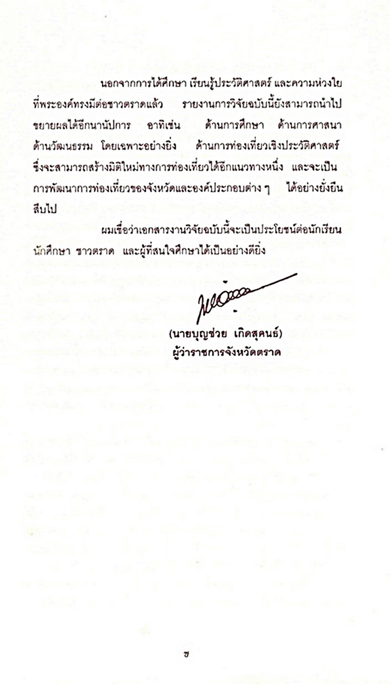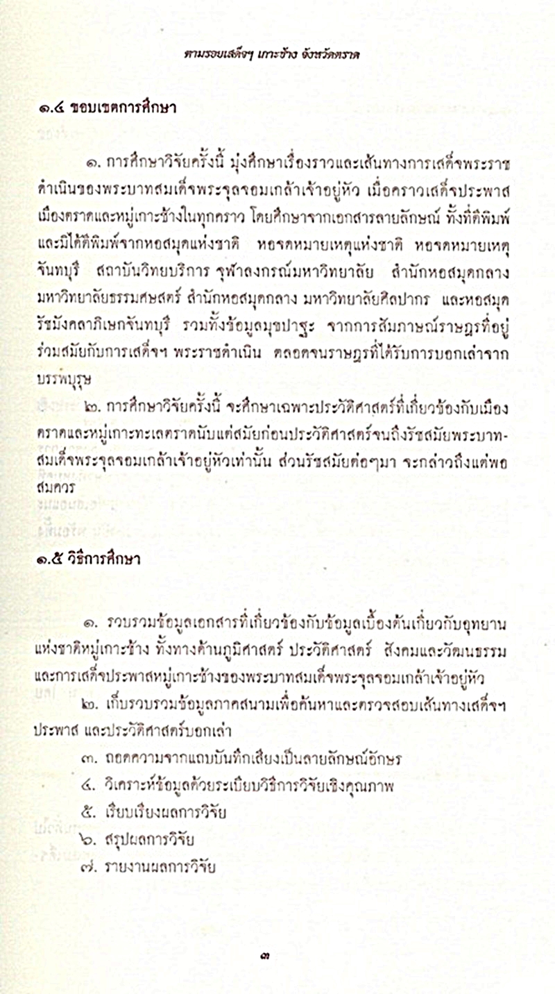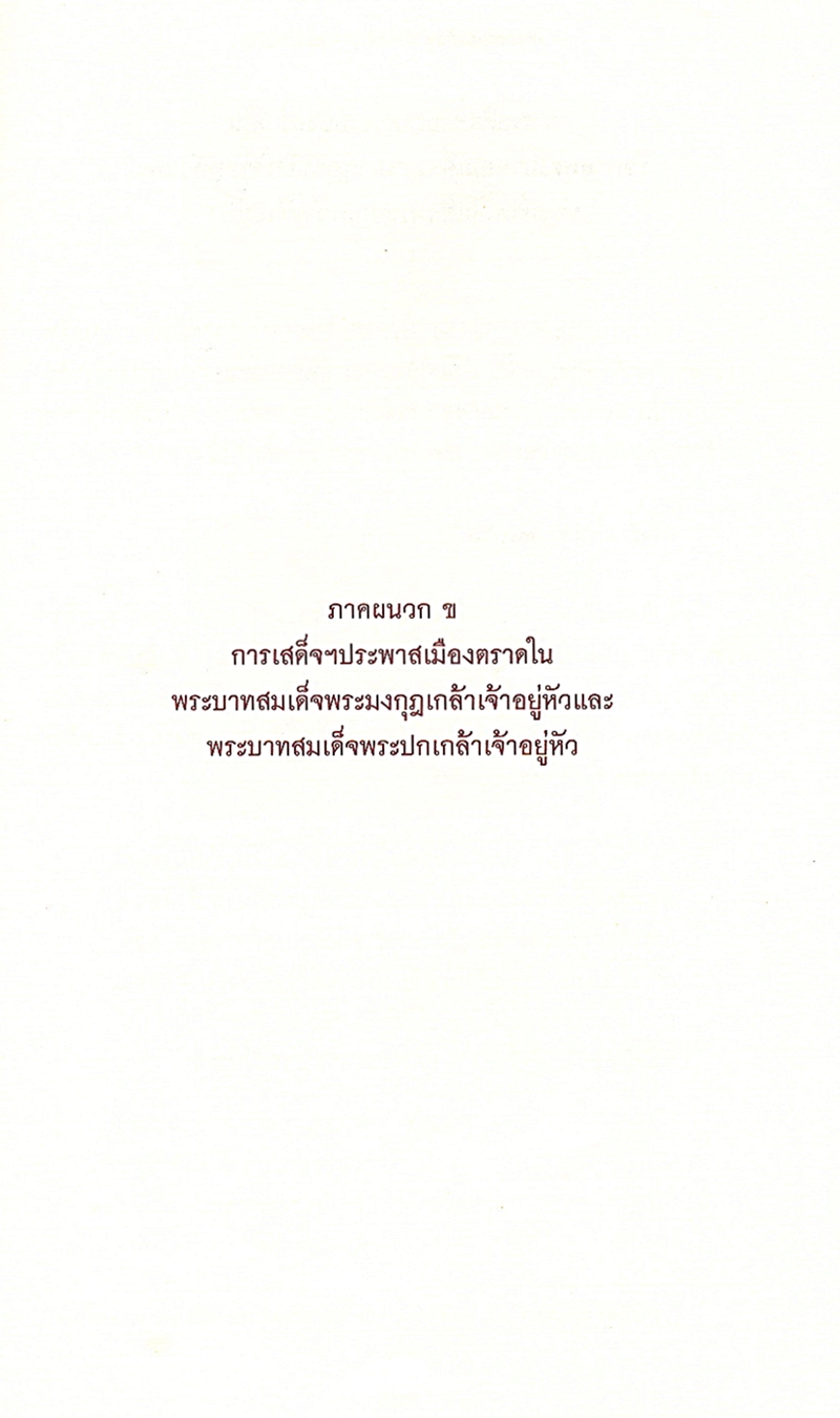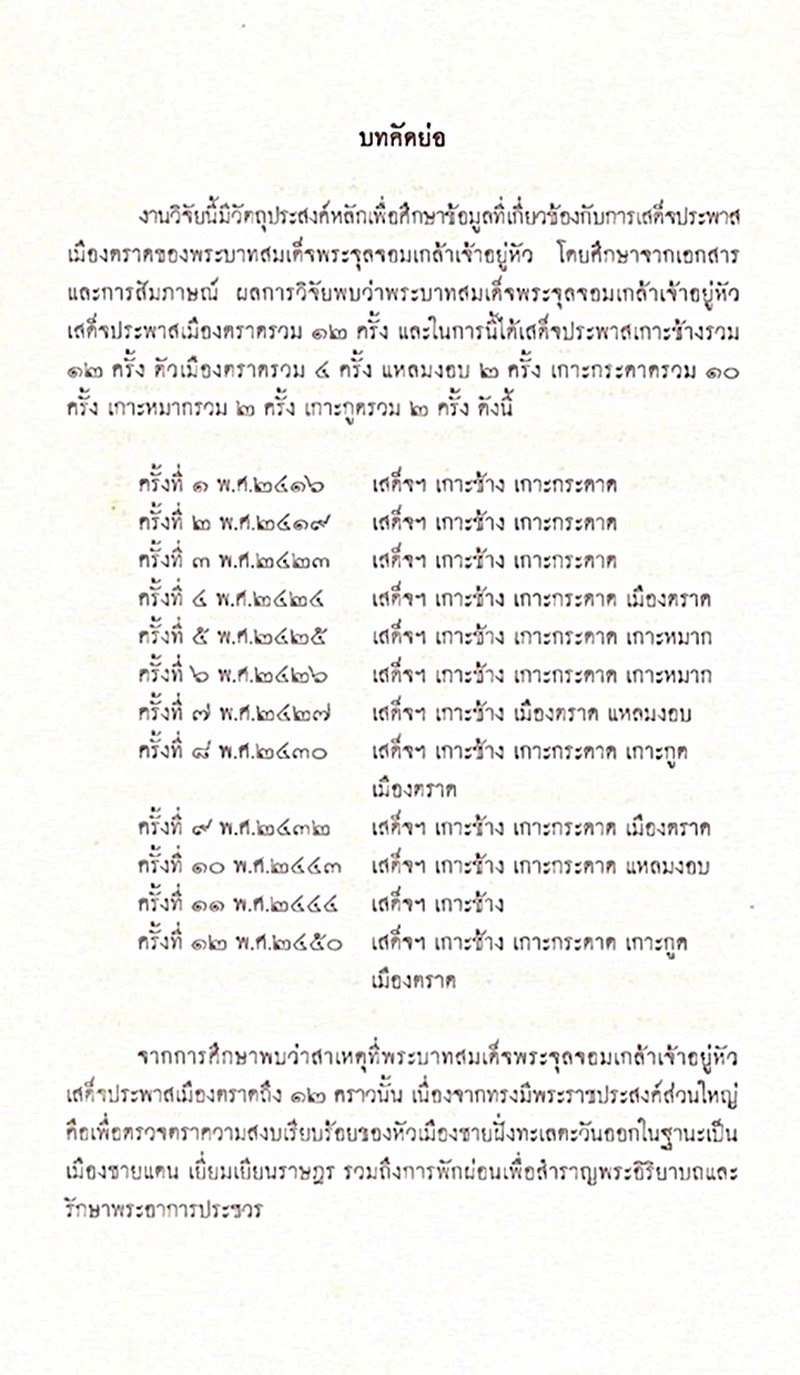 - เป็นงานวิจัยที่ศึกษาข้อมูลที่เกี่ยวข้องกับการเสด็จประพาสเมืองตราดของพระบาทสมเด็จพระจุลจอมเกล้าเจ้าอยู่หัว โดยศึกษาจากเอกสารและการสัมภาษณ์ และพบว่าพระองค์เสด็จประพาสเมืองตราด รวม 12 ครั้ง เนื่องจากทรงมีพระราชประสงค์เพื่อตรวจตราความสงบเรียบร้อยของหัวเมืองชายฝั่งทะเลตะวันออก เยี่ยมเยียนราษฎร รวมทั้งการพักผ่อนเพื่อสำราญพระอิริยาบถและรักษาพระอากาสประชวร