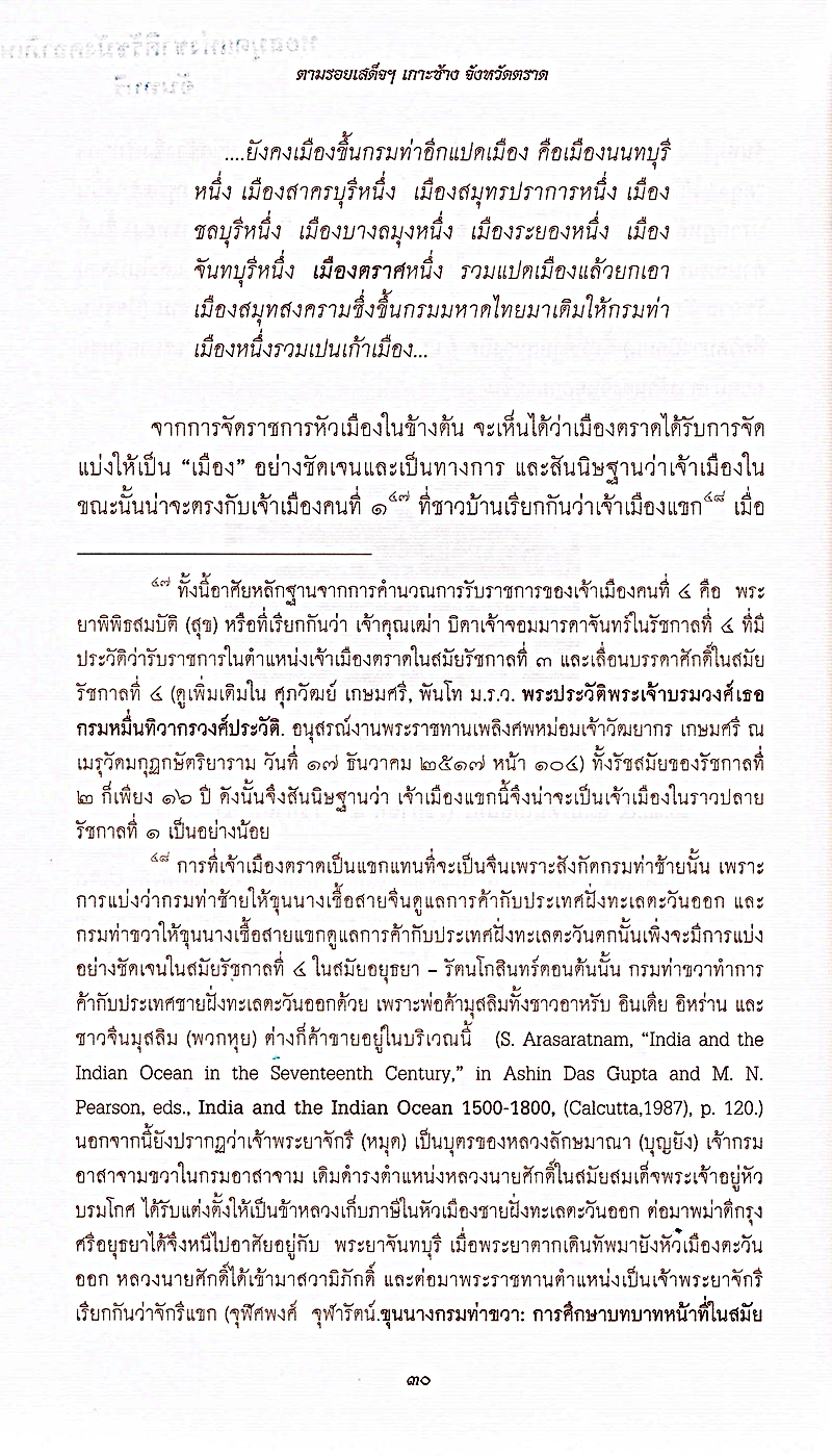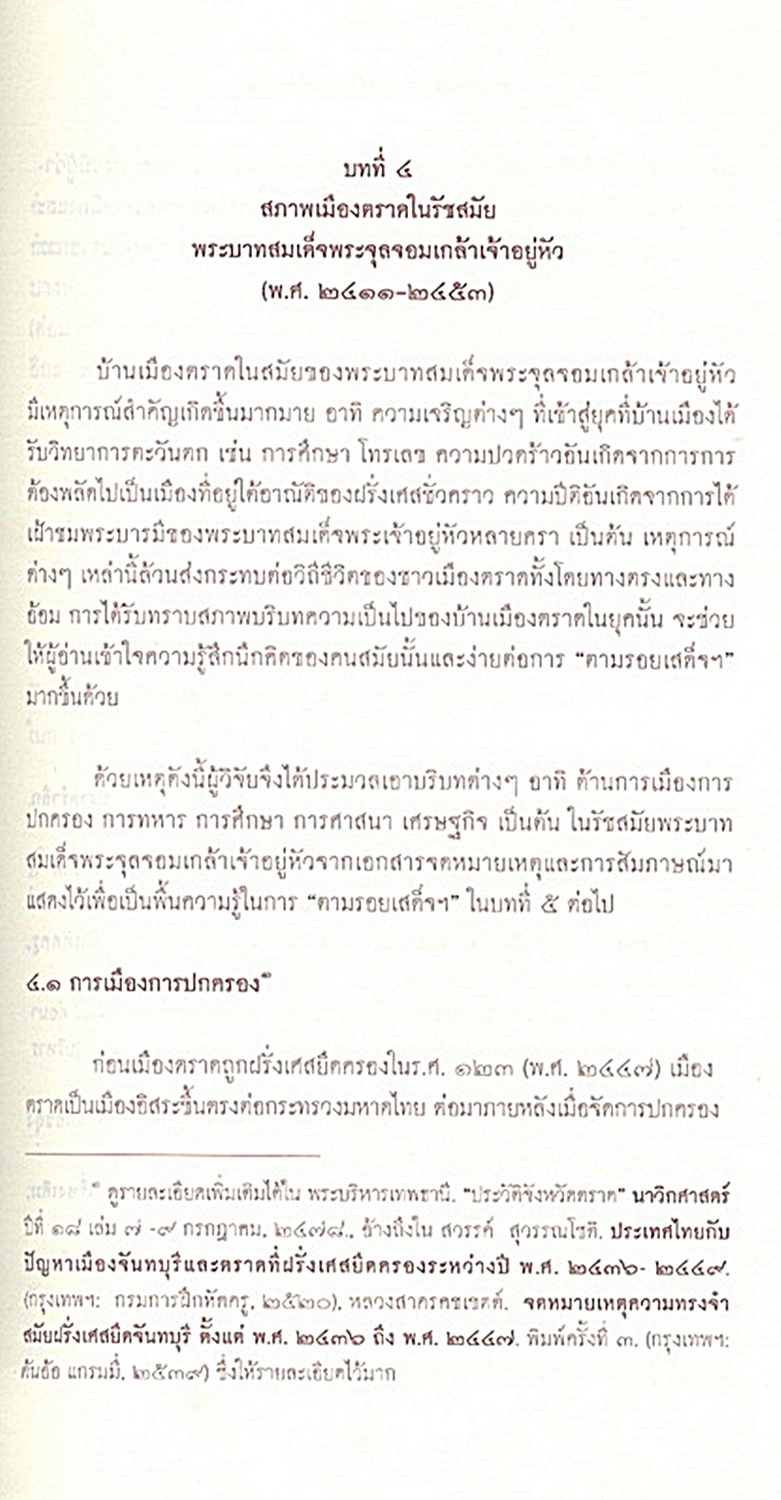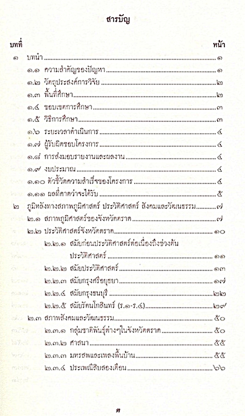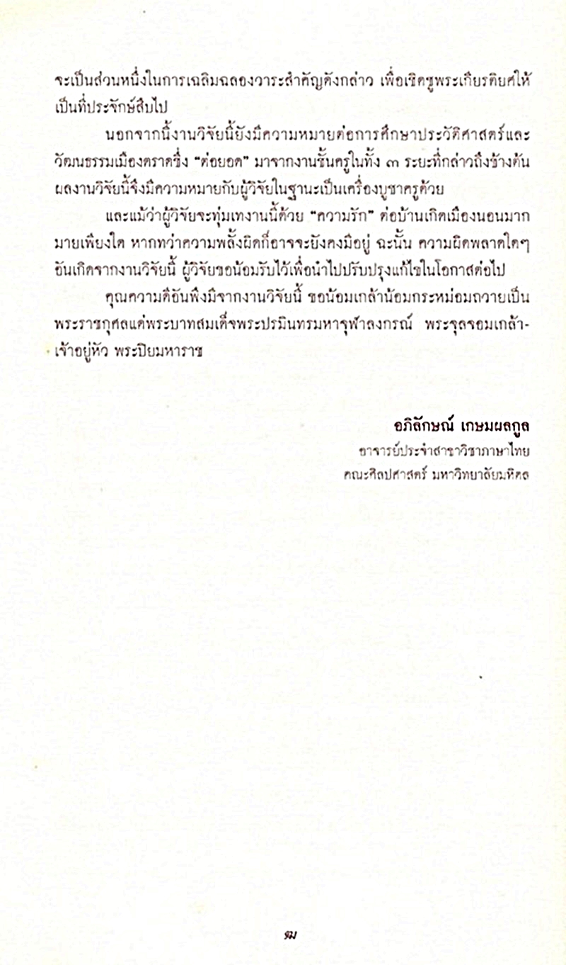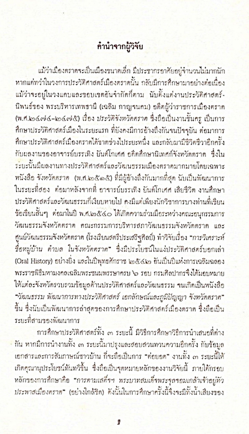 - เป็นงานวิจัยที่ศึกษาข้อมูลที่เกี่ยวข้องกับการเสด็จประพาสเมืองตราดของพระบาทสมเด็จพระจุลจอมเกล้าเจ้าอยู่หัว โดยศึกษาจากเอกสารและการสัมภาษณ์ และพบว่าพระองค์เสด็จประพาสเมืองตราด รวม 12 ครั้ง เนื่องจากทรงมีพระราชประสงค์เพื่อตรวจตราความสงบเรียบร้อยของหัวเมืองชายฝั่งทะเลตะวันออก เยี่ยมเยียนราษฎร รวมทั้งการพักผ่อนเพื่อสำราญพระอิริยาบถและรักษาพระอากาสประชวร