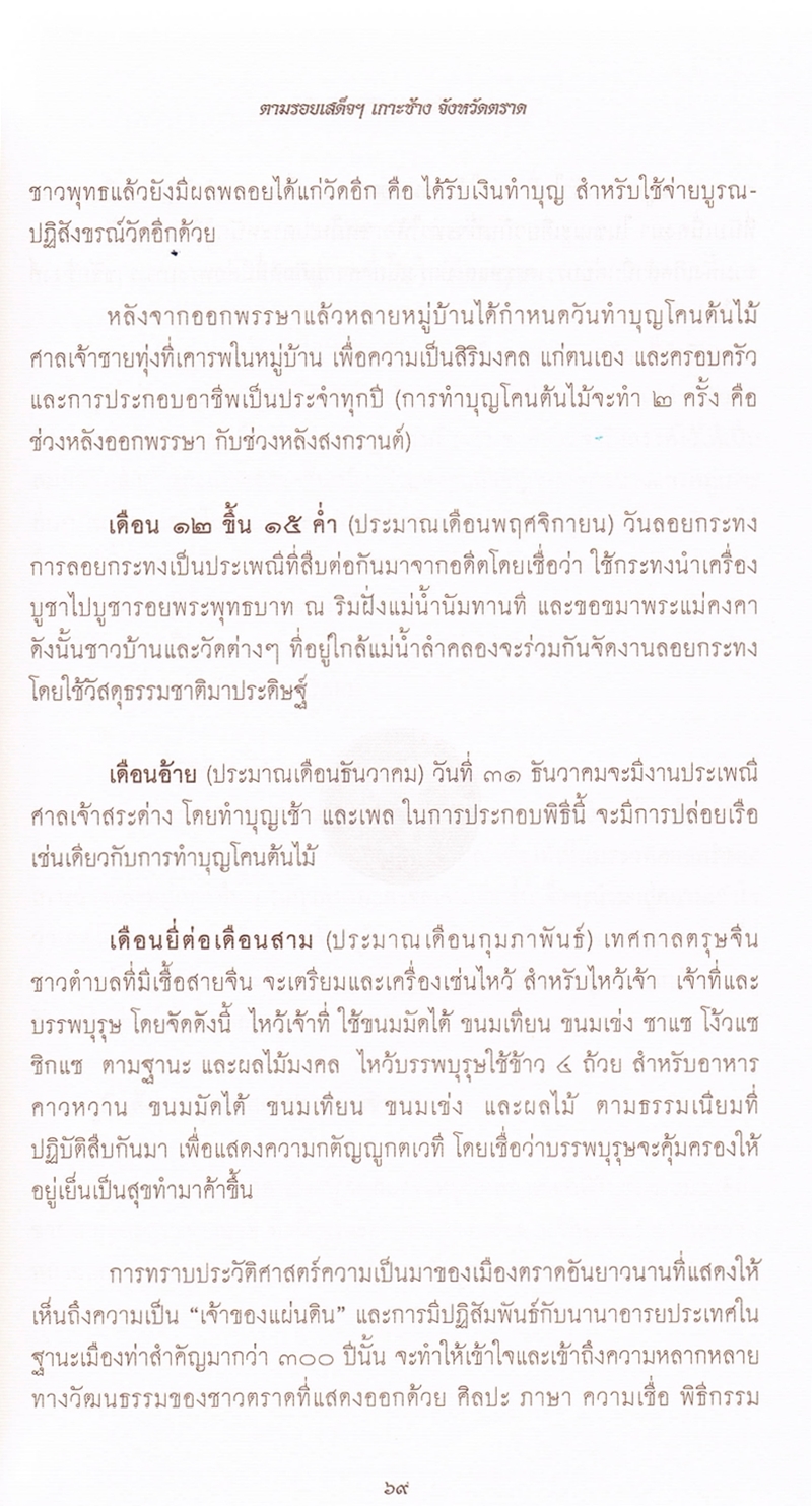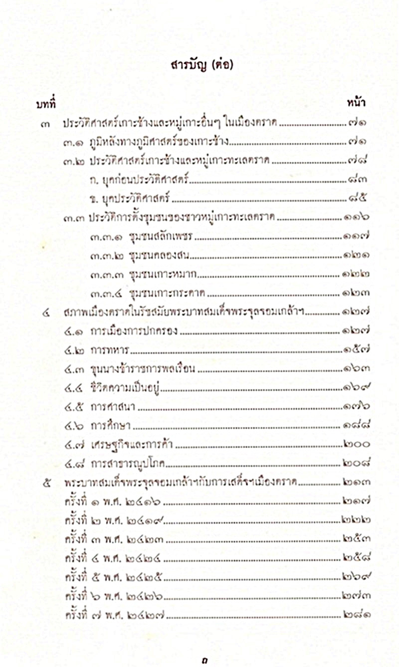 เนื้อหาแบ่งเป็น 6 บท ได้แก่ บทที่ 1 บทนำ บทที่ 2 ภูมิหลังทางสภาพภูมิอากาศ ประวัติศาสตร์ สังคมและวัฒนธรรม บทที่3 ประวัติศาสตร์เกาะช้างและหมู่เกาะอื่นๆ ในเมืองตราด บทที่ 4 สภาพเมืองตราด ในรัชสมัยพระบาทสมเด็จพระจุลจอมเกล้าเจ้าอยู่หัวฯ บทที่ 5 พระบาทสมเด็จพระจุลจอมเกล้าเจ้าอยู่หัวกับการเสด็จเมืองตราด บทที่ 6 แนวทางการพัฒนาการท่องเที่ยว "ตามเสด็จฯเกาะช้าง" ท้ายเล่มมีภาพจดหมายเหตุ - Contributor