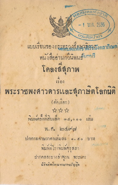 กรมวิชาการ, “หนังสืออ่านกวีนิพนธ์ โคลงสี่สุภาพ เรื่อง พระราชพงศาวดารและสุภาษิตโลกนิติ,” D-Library | National Library of Thailand, accessed April 2, 2026, http://164.115.27.97/digital2024/items/show/5083.