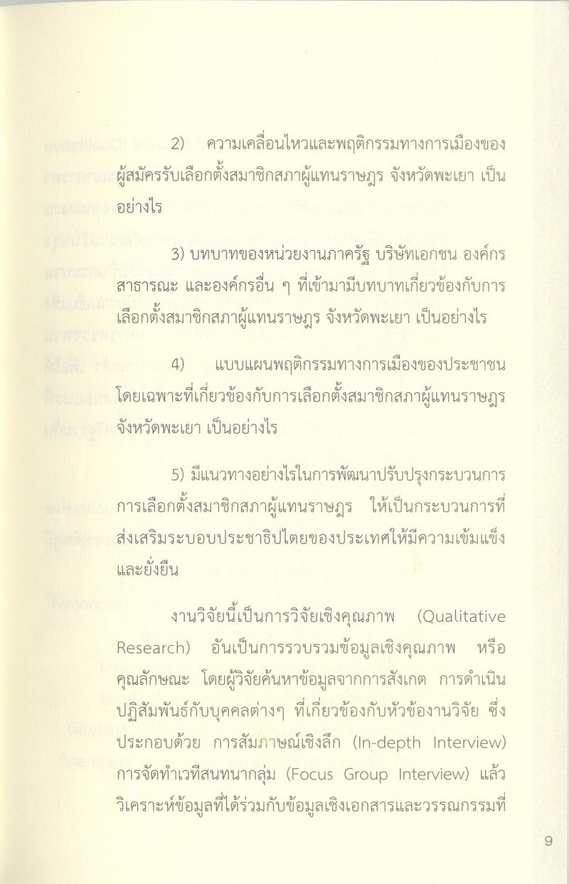 - เพื่อศึกษาความเคลื่อนไหว บรรยากาศ และพฤติกรรมทางการเมืองของผู้สมัครรับเลือกตั้งสมาชิกสภาผู้แทนราษฎรของจังหวัดพะเยา