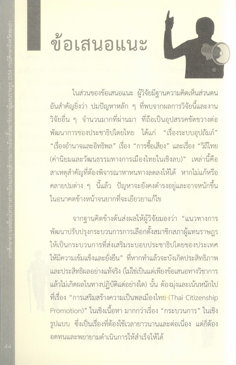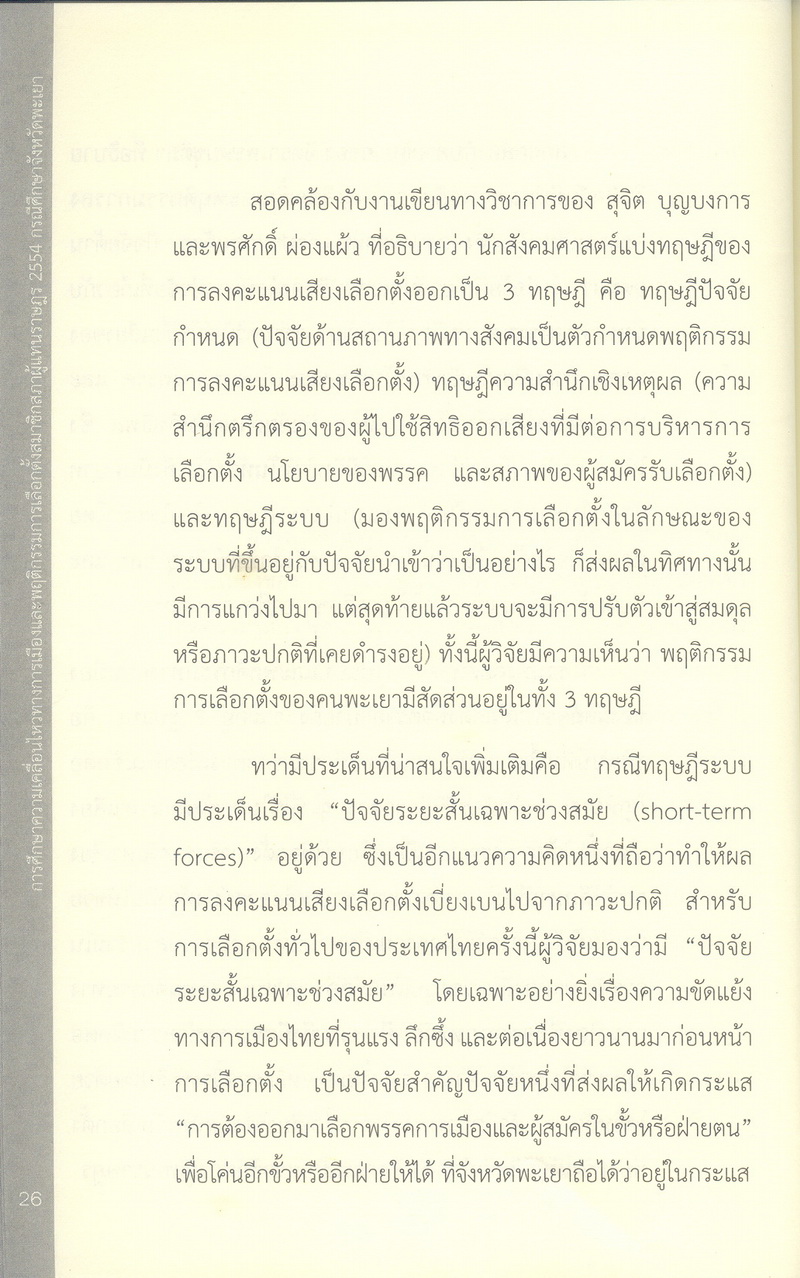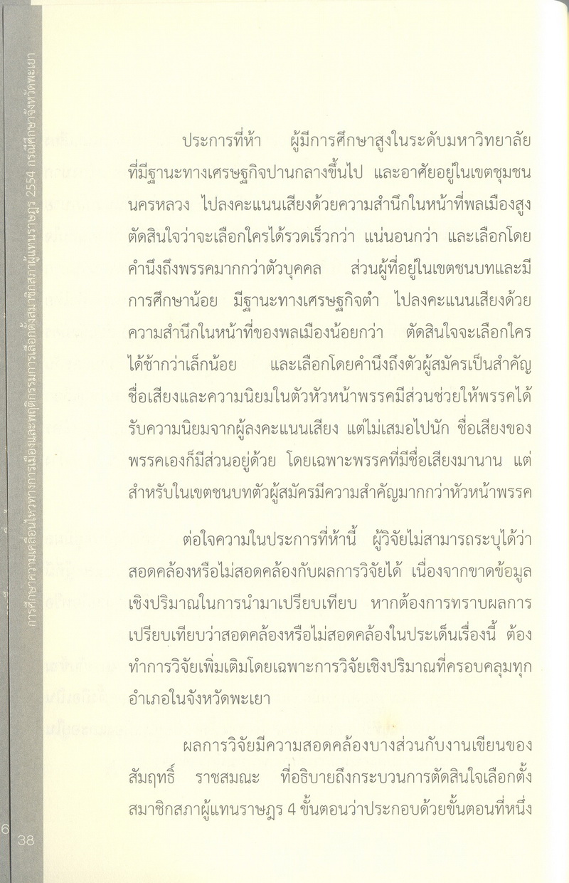 - การศึกษาความเคลื่อนไหวทางการเมืองและพฤติกรรมการเลือกตั้งสมาชิกสภาผู้แทนราษฎร 2554 กรณีศึกษาจังหวัดพะเยา