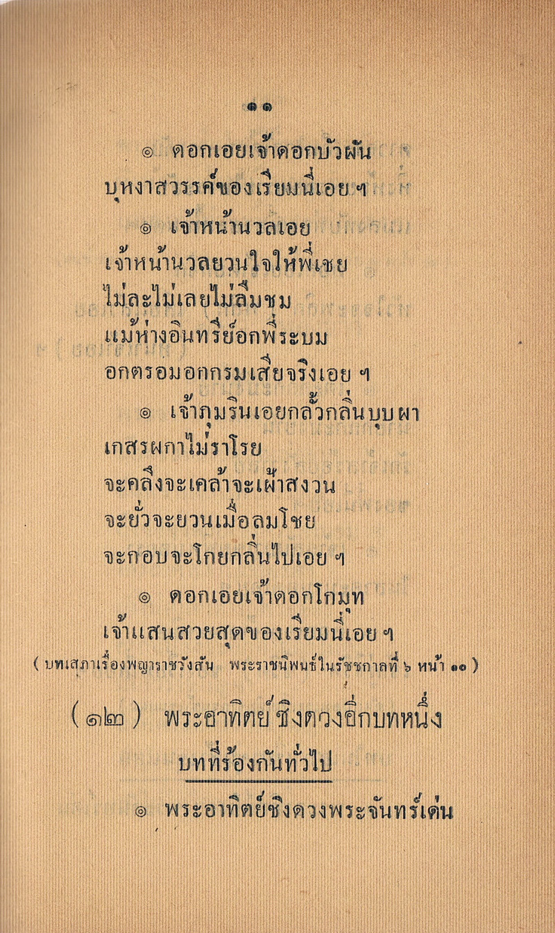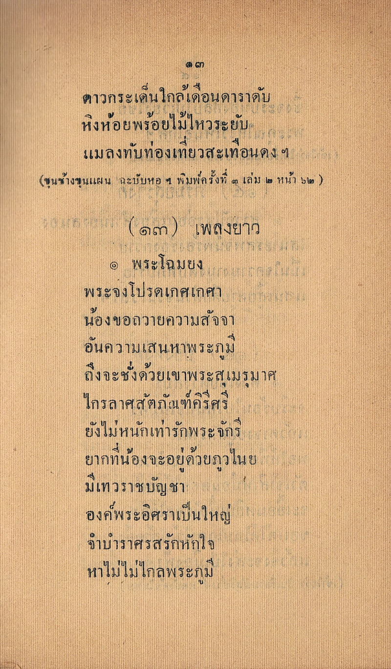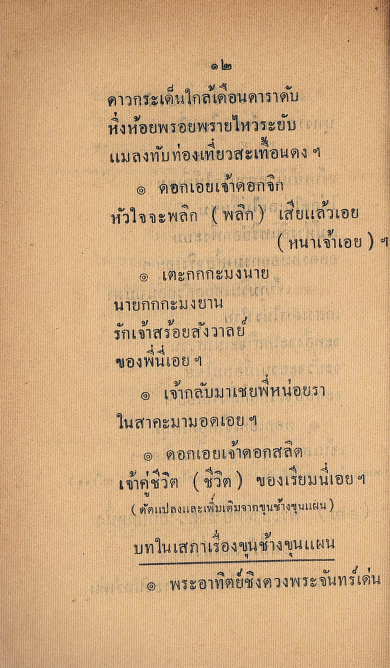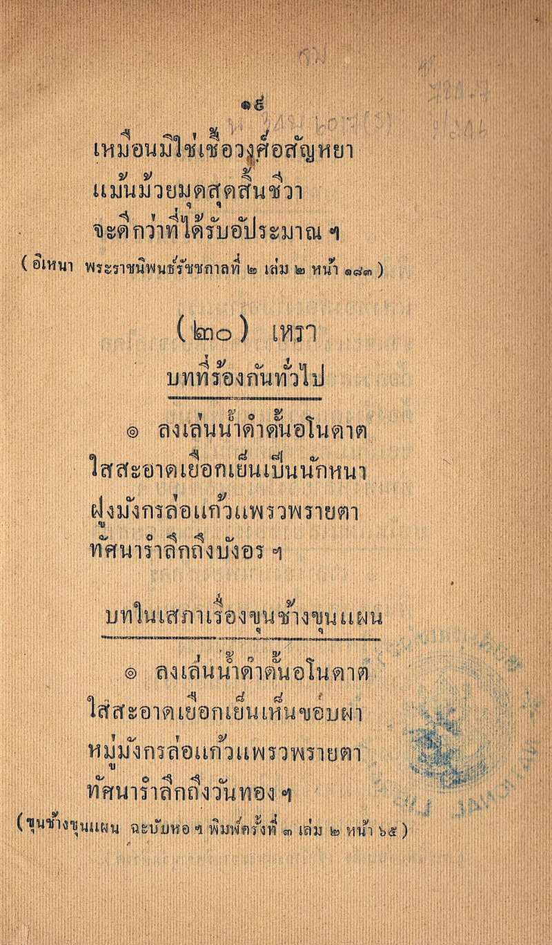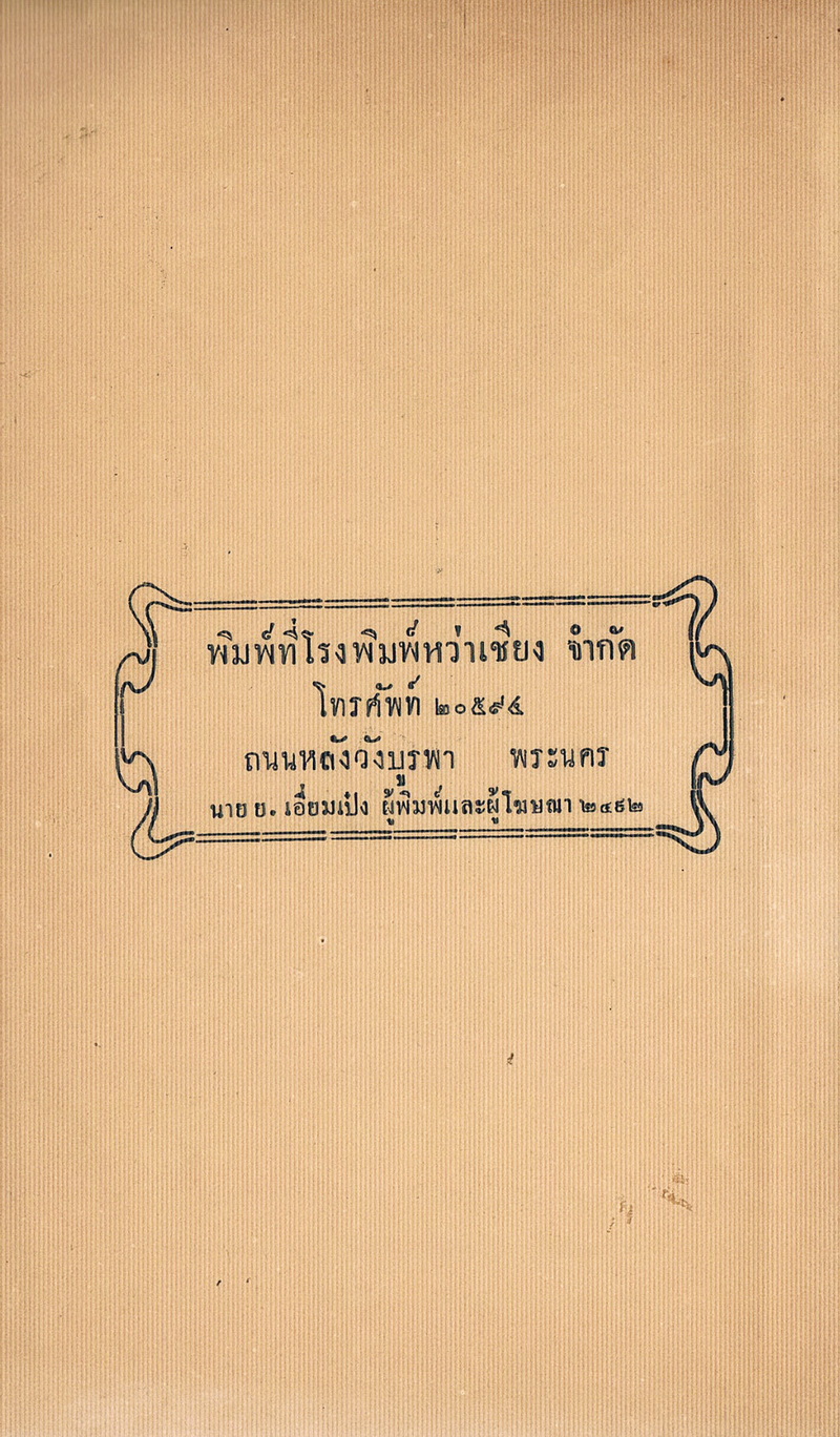 - พิมพ์แจกในงานพระราชทานเพลิงศพ เสวกตรี พระยาเสนาะดุริยางค์ (แช่ม สุนทรวาทิน) ณ สุสานวัดพระพิเรนทร์ วันที่ ๒๐ มีนาคม พ.ศ.๒๔๙๒