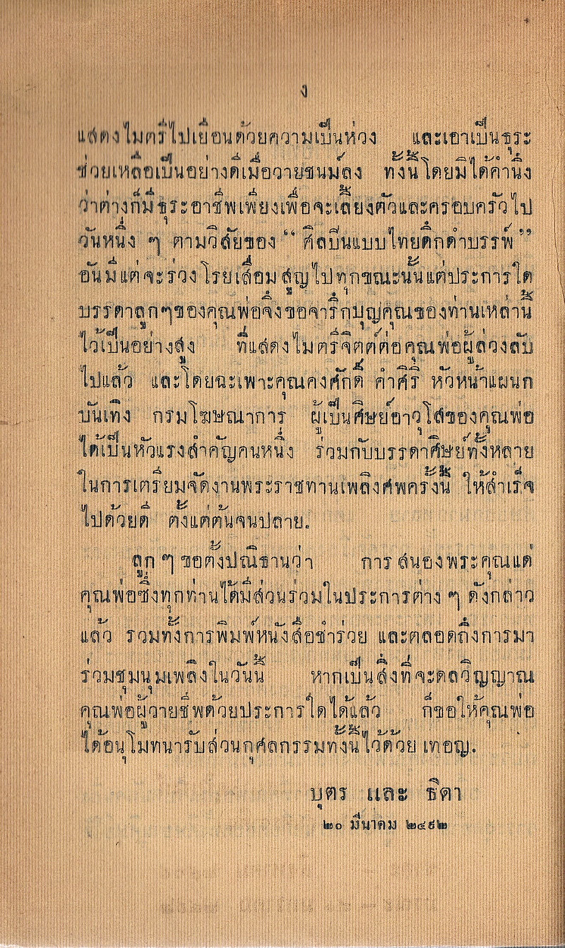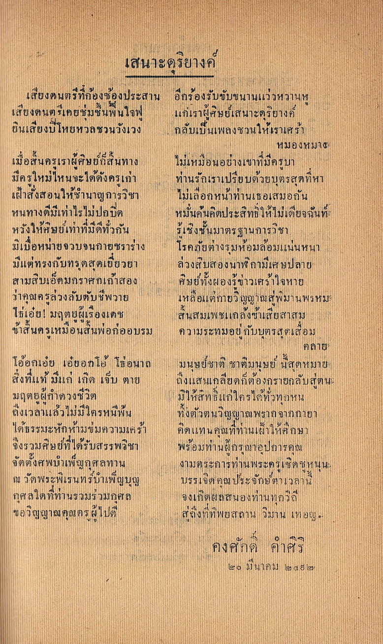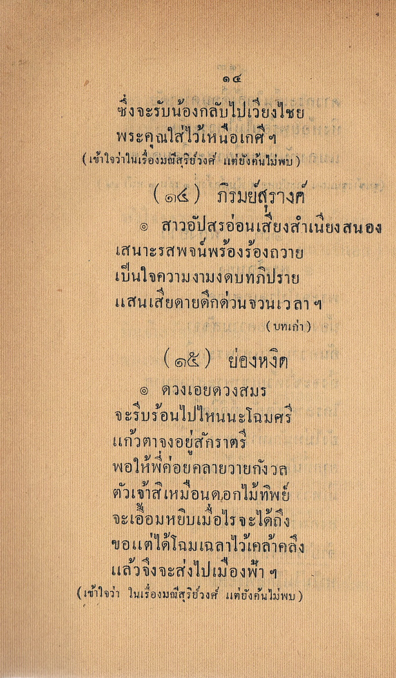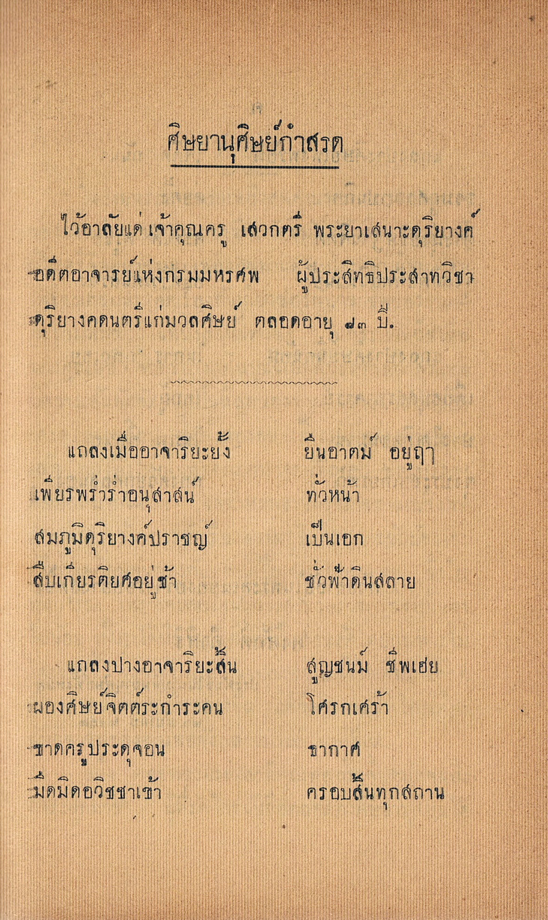 - พิมพ์แจกในงานพระราชทานเพลิงศพ เสวกตรี พระยาเสนาะดุริยางค์ (แช่ม สุนทรวาทิน) ณ สุสานวัดพระพิเรนทร์ วันที่ ๒๐ มีนาคม พ.ศ.๒๔๙๒