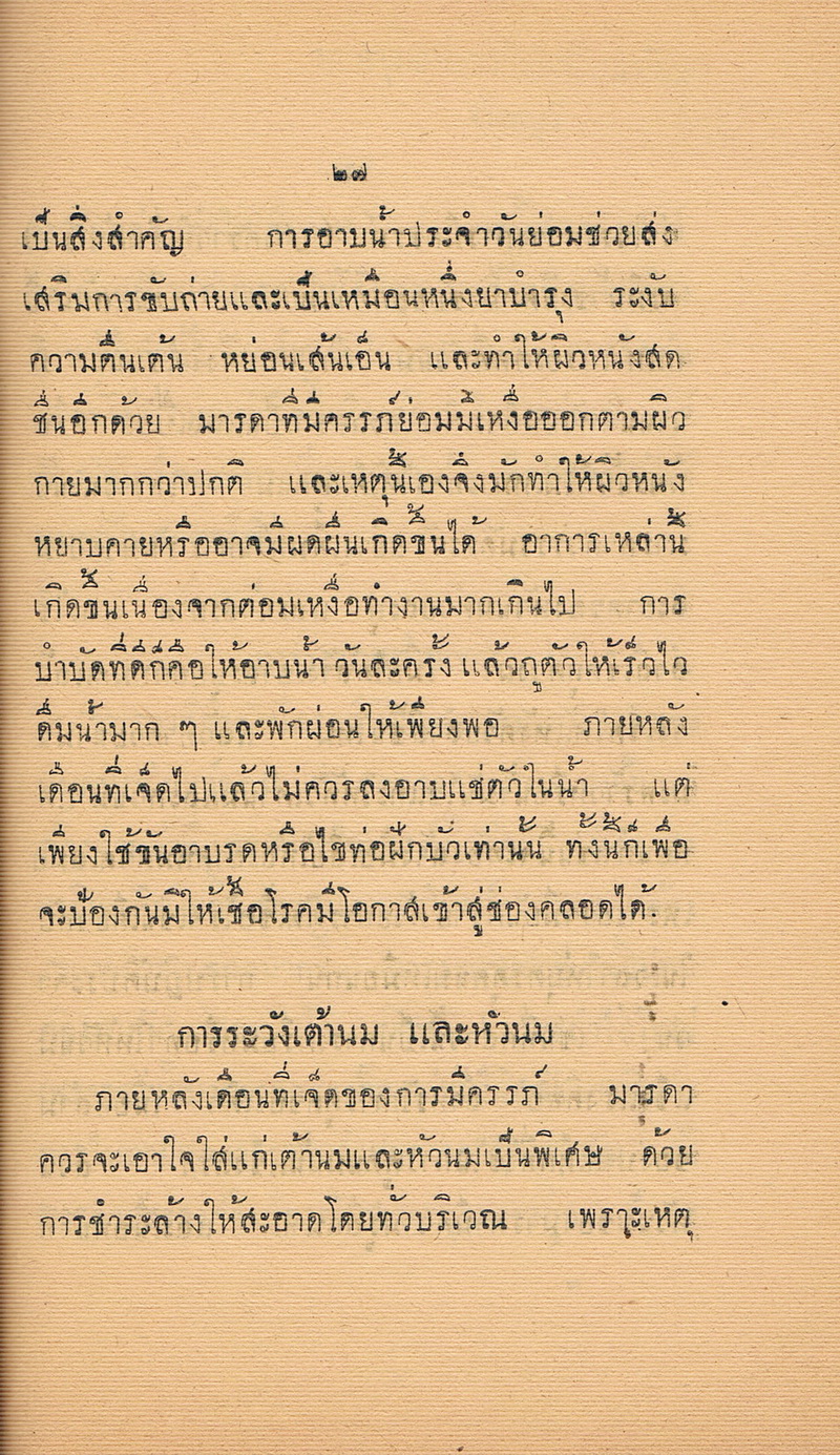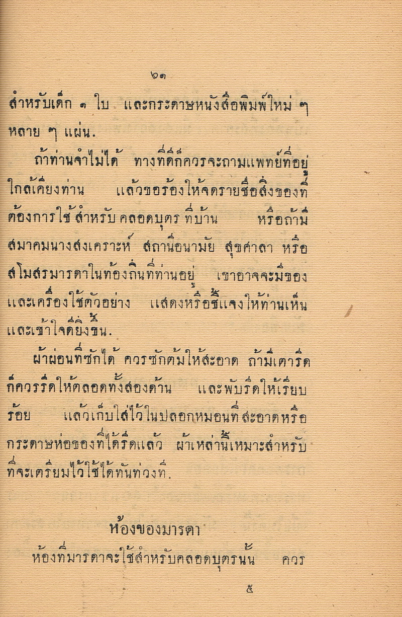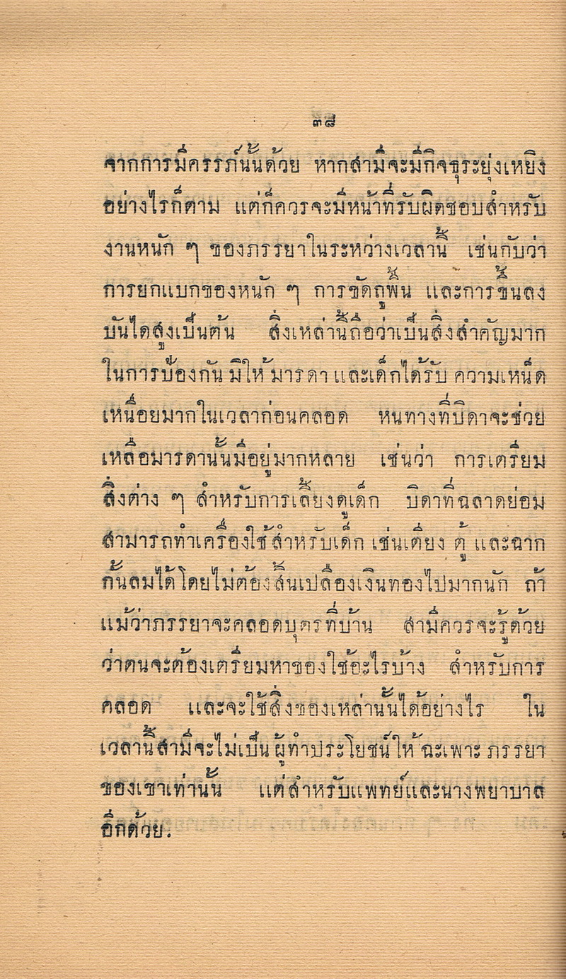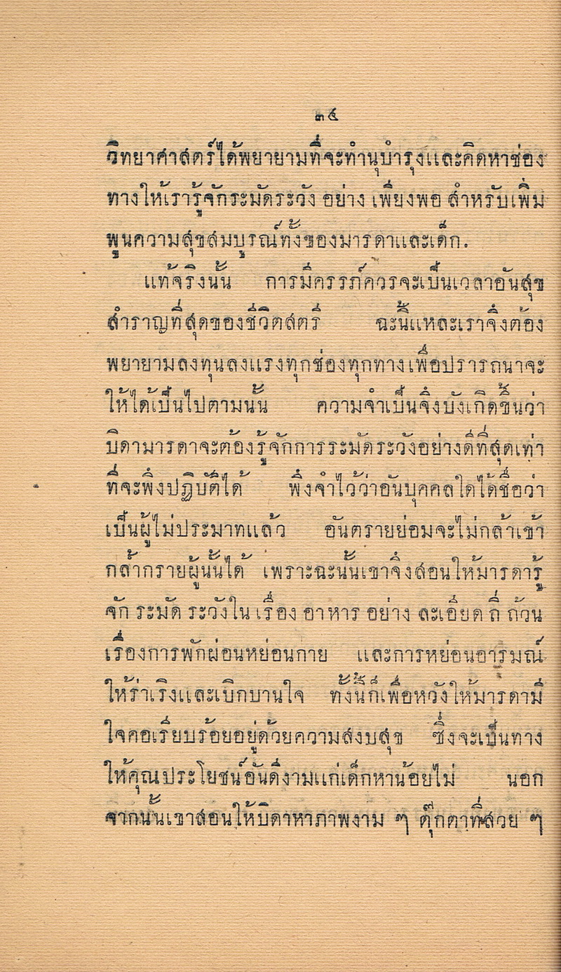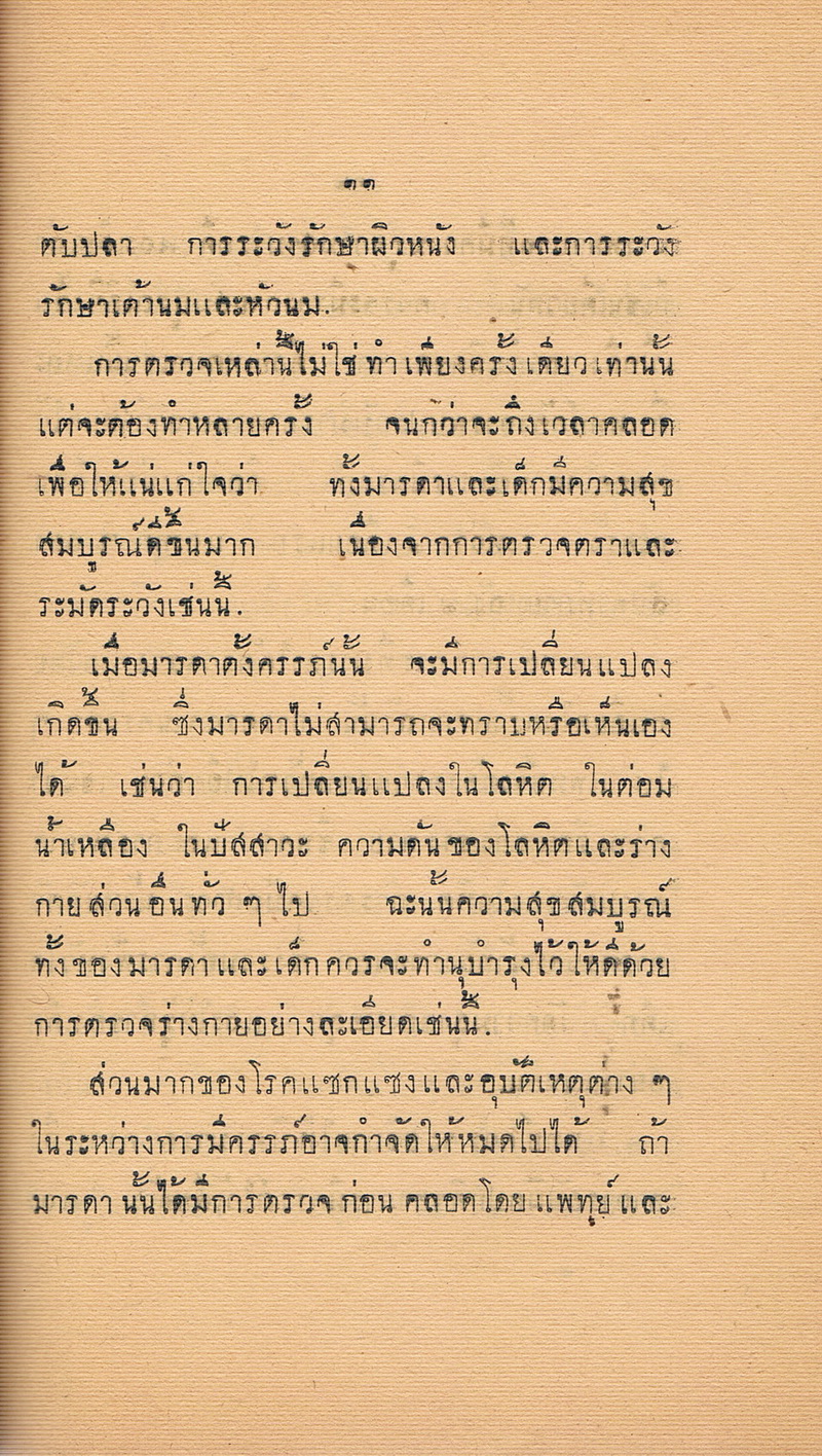 - บรรยายการดูแลการตั้งครรภ์ตั้งแต่ เริ่มตั้งครรภ์ การตรวจของแพทย์ อาหารของมารดา การพักผ่อน การออกกำลังกาย การเตรียมเครื่องอุปกรณ์เลี้ยงเด็ก ไปจนถึงการระมัดระวังมารดาภายหลังคลอด