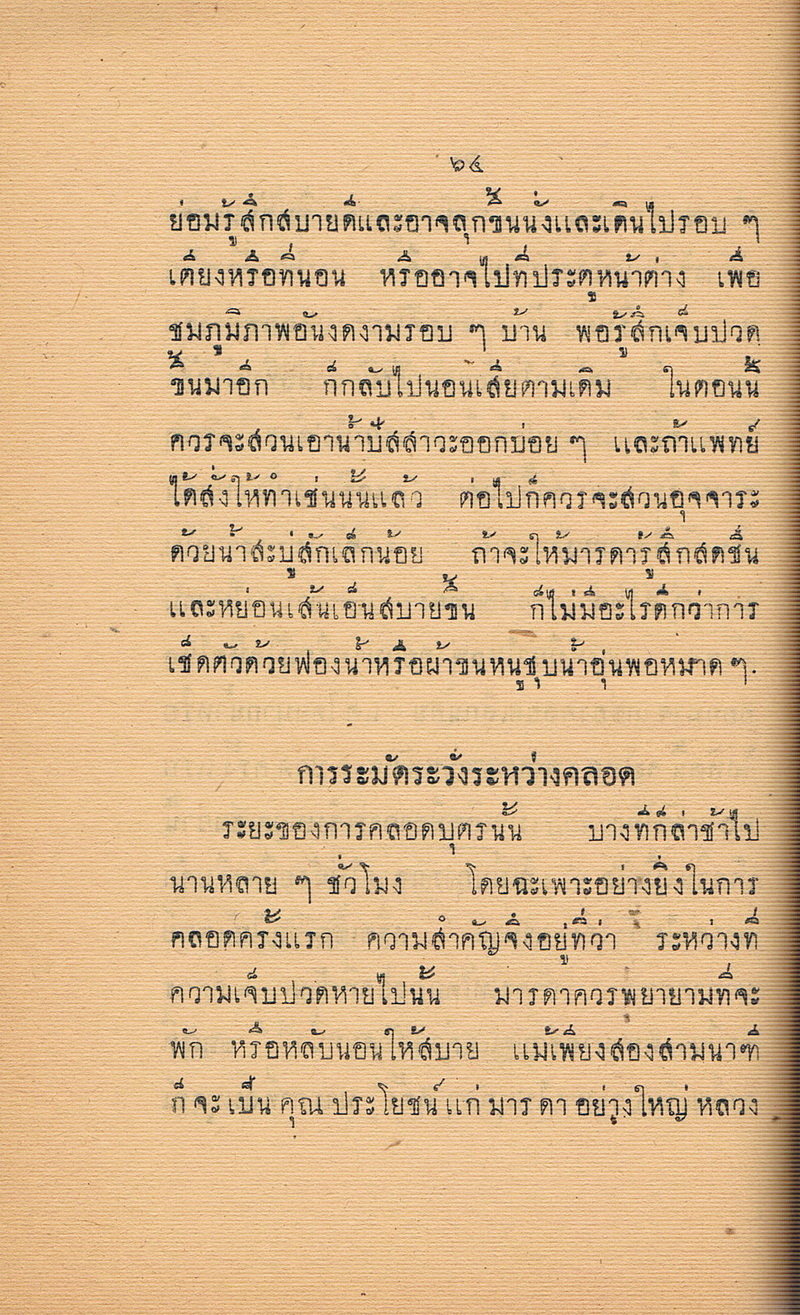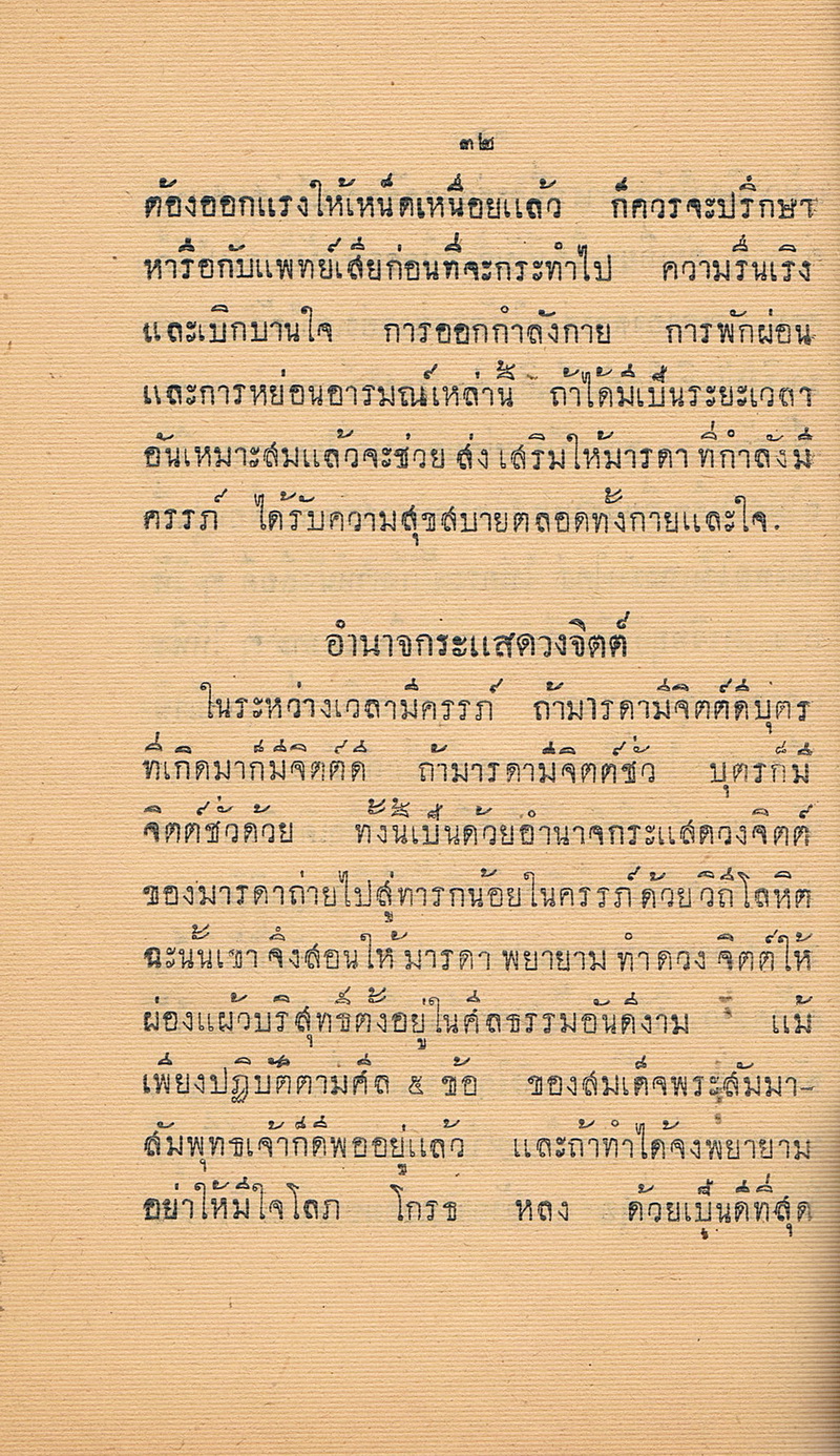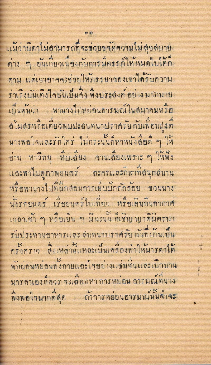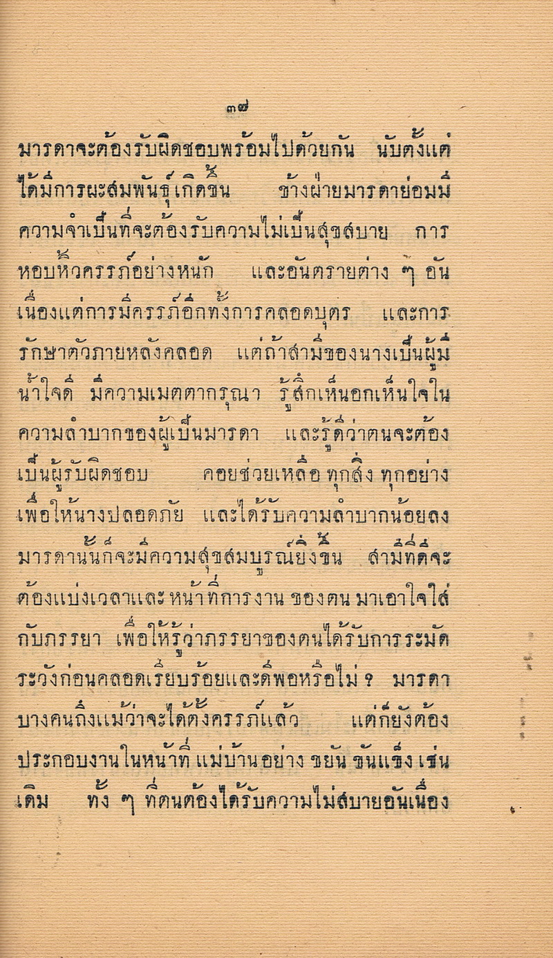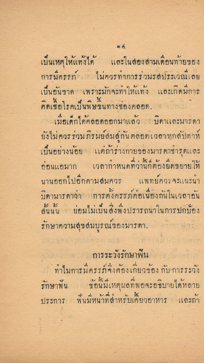 - บรรยายการดูแลการตั้งครรภ์ตั้งแต่ เริ่มตั้งครรภ์ การตรวจของแพทย์ อาหารของมารดา การพักผ่อน การออกกำลังกาย การเตรียมเครื่องอุปกรณ์เลี้ยงเด็ก ไปจนถึงการระมัดระวังมารดาภายหลังคลอด