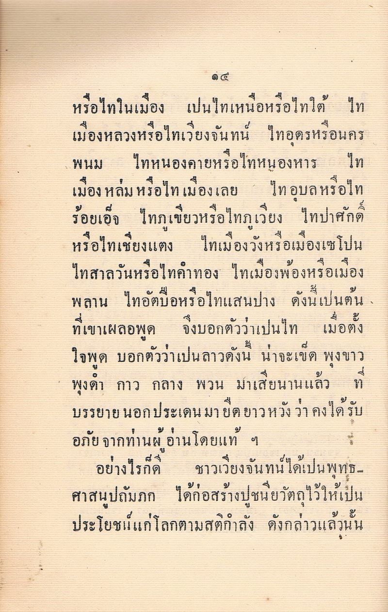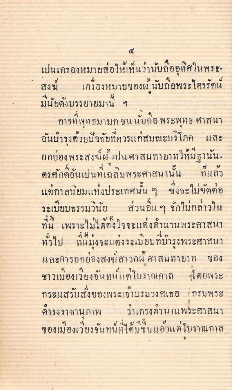 - ศาสนาเป็นสิ่งที่ผู้คนทั้งโลกให้ความเคารพนับถือยกย่องสักการบูชา เพราะถือว่าเป็นสิ่งศักดิ์สิทธิ์ที่สามารถป้องกันหรือขับไล่สรรพสิ่งที่ตนไม่ปราถนาให้หายไป และบรรดาลให้สมหวังกับสิ่งที่ปราถนาได้ ชาวเมืองเวียงจันทน์ได้รับรองพระพุทธศาสนาไปทำนุบำรุงให้เจริญรุ่งเรืองตลอดแคว้นของตน และได้เป็นพุทธศาสนูปถัมภก ได้ก่อสร้างปูชนียวัตถุไว้ให้เป็นประโยชน์แก่โลกตามสติกำลัง และได้ยกย่องสงฆ์สาวกผู้เป็นศาสนทายาทให้ธำรงฐานันดรศักดิ์ตามชั้นตามภูมิอีกด้วย