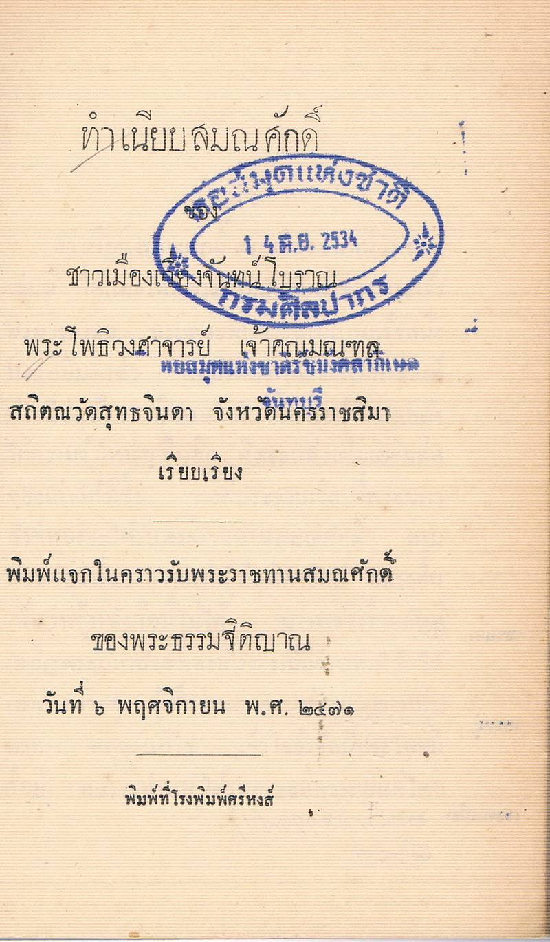 - พิมพ์แจกในคราวรับพระราชทานสมณศักดิ์ ของพระธรรมฐิติญาณ วันที่ ๖ พฤศจิกายน พ.ศ.๒๔๗๑