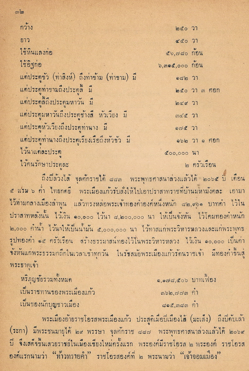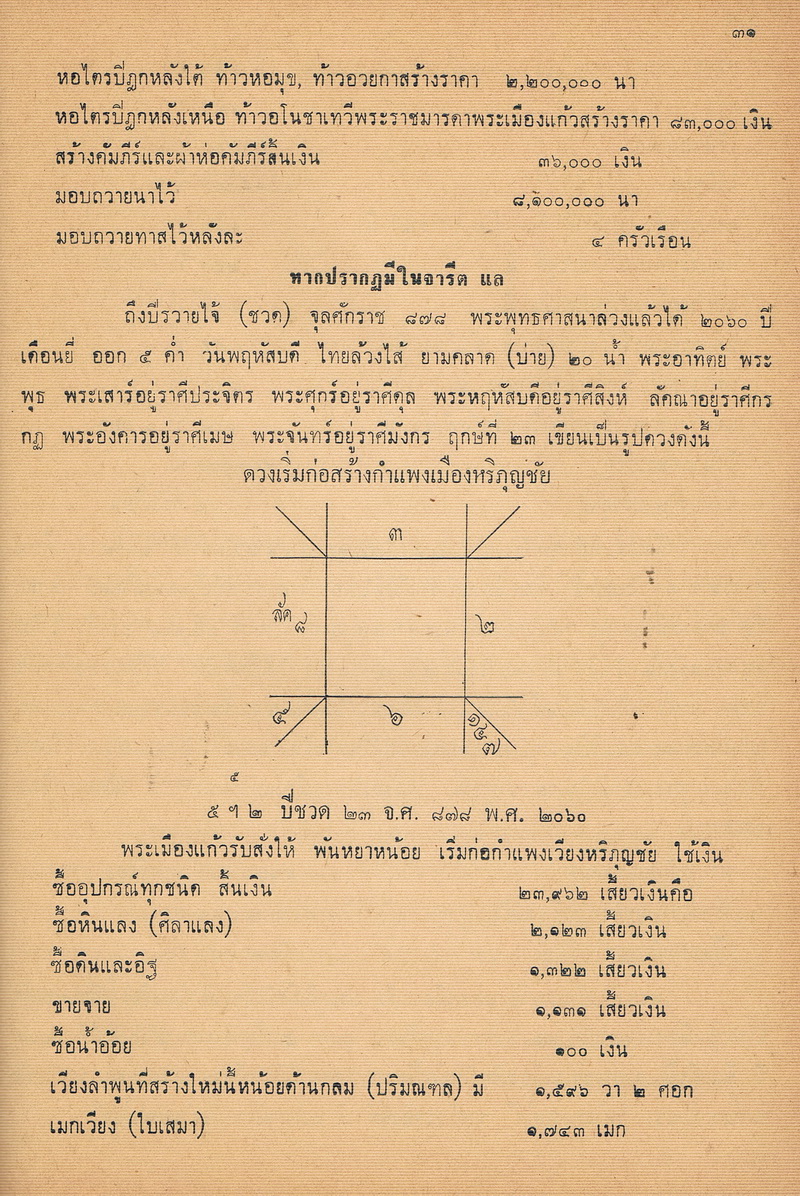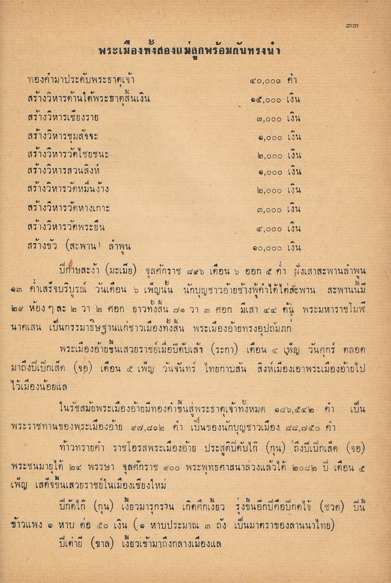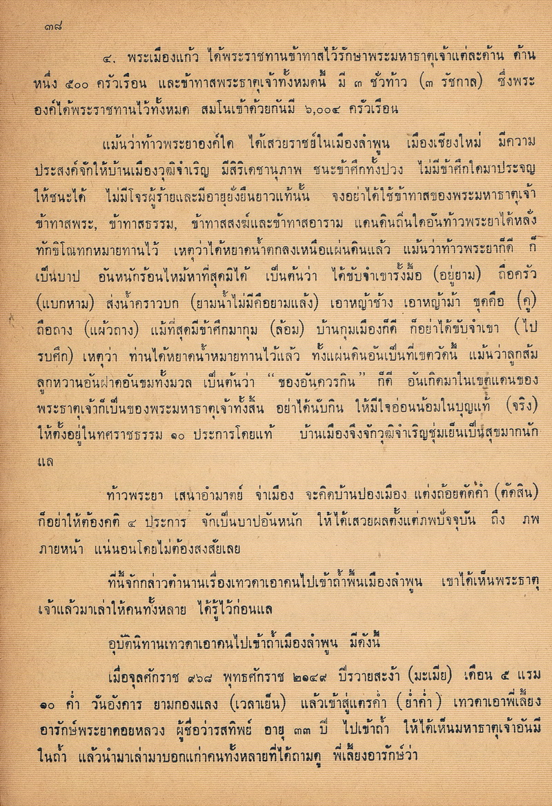 - หนังสือเล่มนี้ได้พูดถึงตำนานและความเป็นมาของพระธาตุเจ้าหริภุญชัยในสมัยก่อน รวมไปถึงรายการก่อสร้างในครั้งนั้นและงานประเพณีประจำของวัดพระธาตุหริภุญชัย ซึ่งตำนานพระธาตุเจ้าหริภุญชัยนี้เป็นไปในรูปของจดหมายเหตุ บันทึกข้อเท็จจริงมี วัน เดือน ปี และอ้างอิง พ.ศ. ไว้อย่างชัดเจนเพื่อให้คนในปัจจุบันได้วิจารณ์ได้อย่างกว้างขวางอีกด้วย
