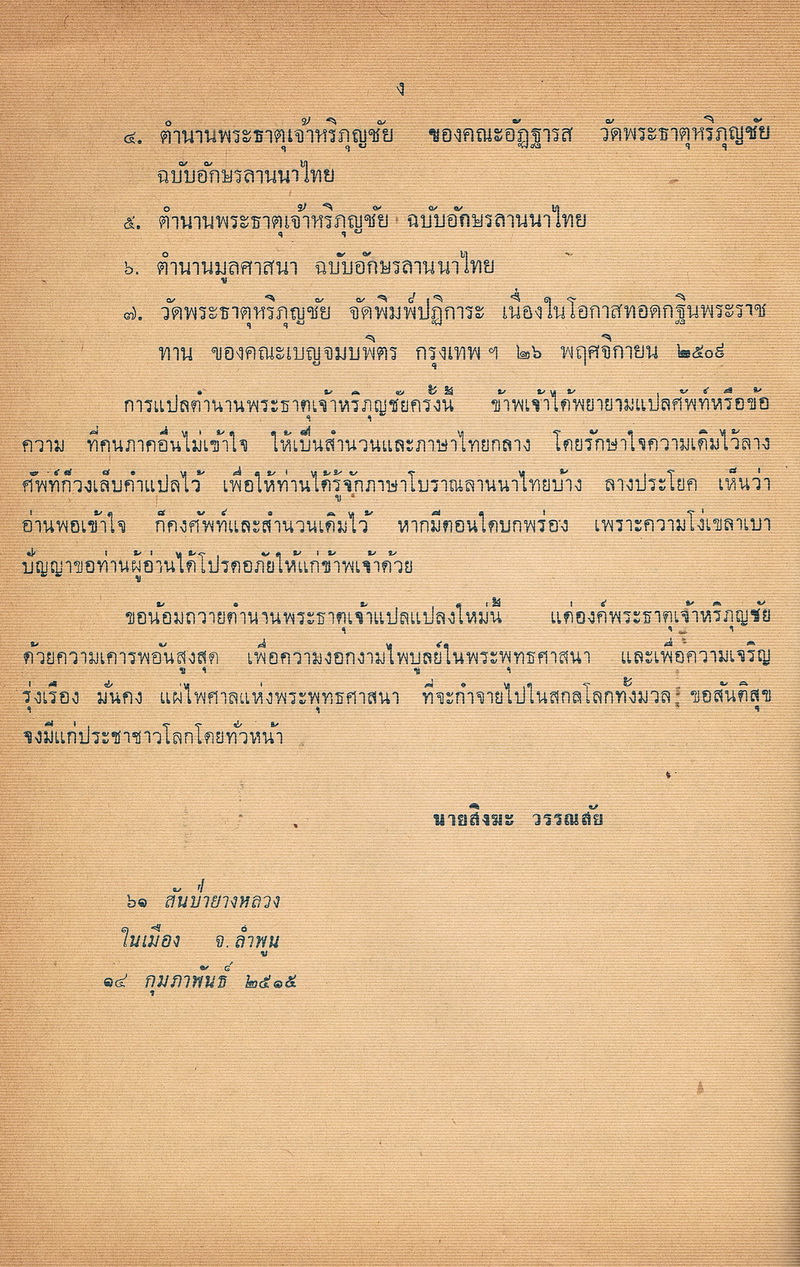 - พิมพ์เป็นที่ระลึก ในงานสมโภชสมณศักดิ์ พระครูประสาท สุตาคม เจ้าคณะอำเภอเมืองลำพูน เลื่อน เป็นพระครูรองเจ้าอาวาส พระอารามหลวงชั้นเอก คณะหลวง วัดพระธาตุหริภุญชัย วรมหาวิหาร อ. เมืองลำพูน 17 มีนาคม 2516