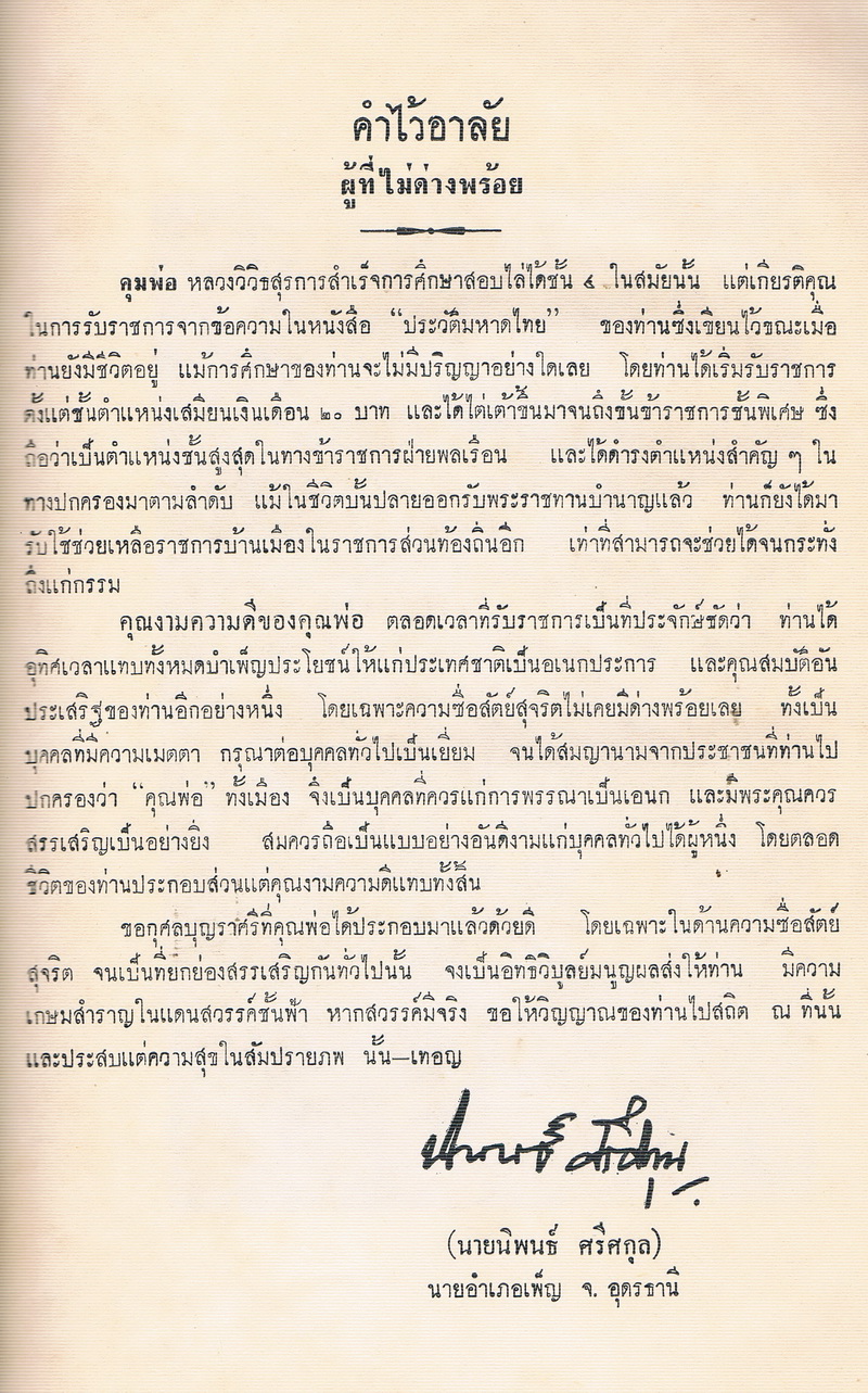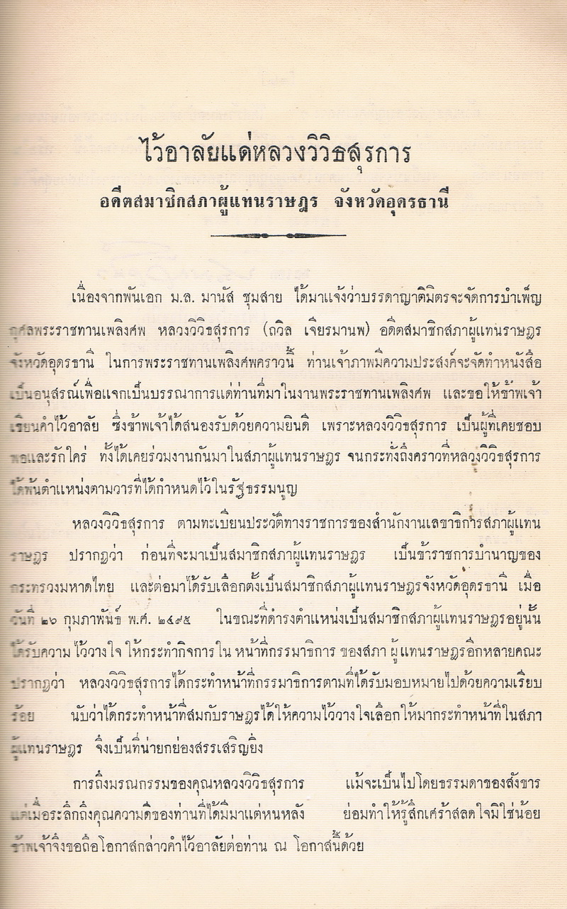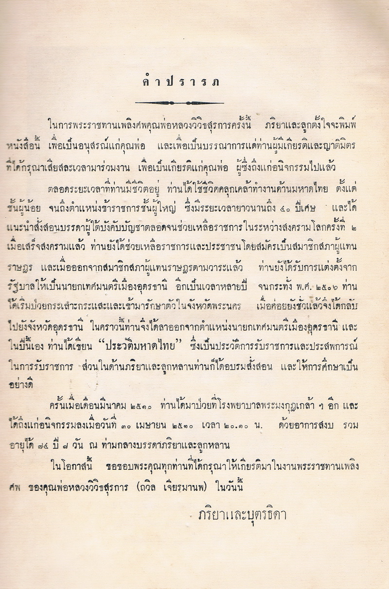 - พิมพ์เป็นอนุสรณ์ในงานพระราชทานเพลิงศพ หลวงวิวิธสุรการ ณ เมรุหน้าพลับพลาอิสริยาภรณ์ วัดเทพศิรินทราวาส วันที่ ๒๑ ตุลาคม ๒๕๑๐