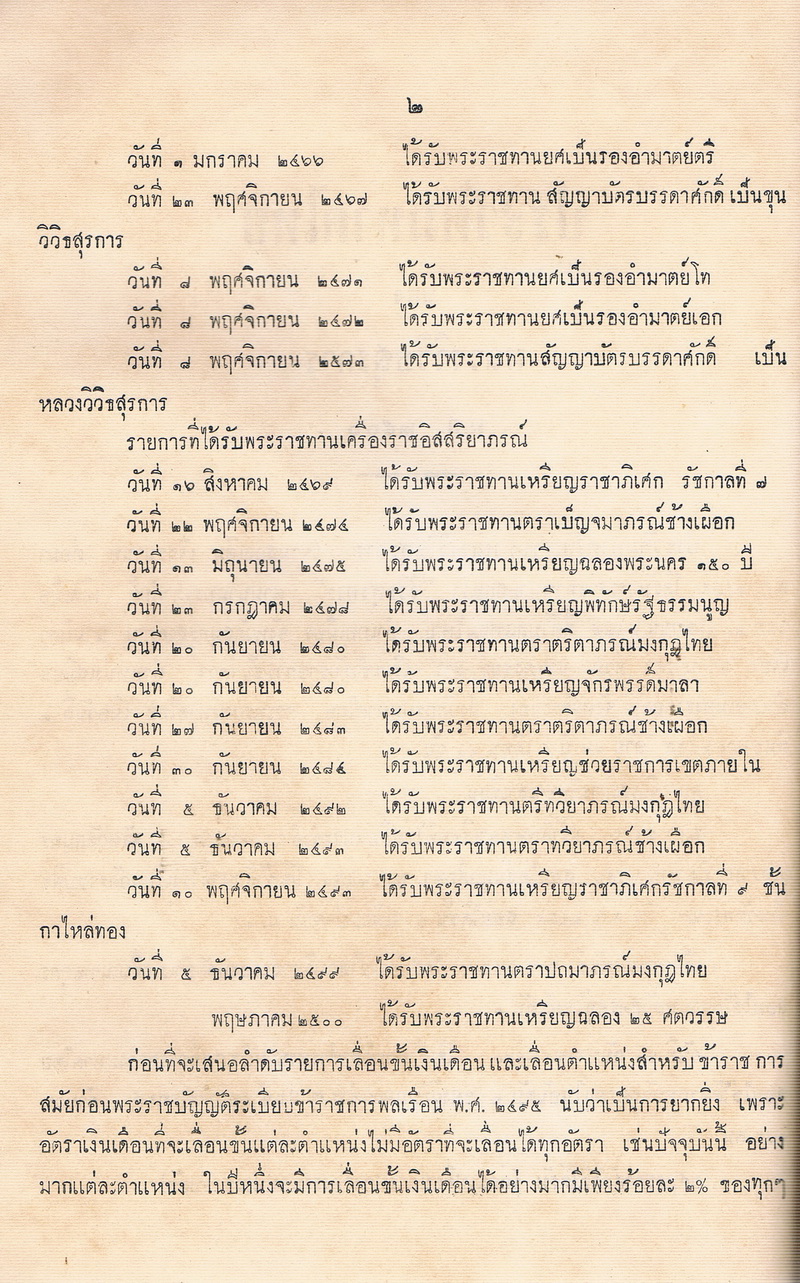 - หลวงวิวธสุรการได้เขียนประวัติมหาดไทย ซึ่งเป็นประวัติการรับราชการและประสบการณ์ในการรับราชการ และยศบรรดาศักดิ์ดังนี้ รองอำมาตย์ตรี, ขุนวิวิธสุรการ, รองอำมาตย์โท, รองอำมาตย์เอก, หลวงวิวิธสุรการ และได้รับเครื่องราชอิสริยาภรณ์ เช่น เหรียญราชภิเศก รัชกาลที่ ๗, เบ็ญจมาภรณ์ช้างเผือก, เหรียญฉลองพระนคร ๑๕๐ ปี, เหรียญพิทักษ์รัฐธรรมนูณ, ตริตราภรณ์มงกุฎไทย, เหรียญจักรพรรดิ์มาลา, ตริตราภรณ์ช้างเผือก, เหรียญช่วยราชการเขตภายใน, ทวิยาภรณ์มงกุฎไทย, ปถมาภรณ์มงกุฎไทย, และเหรียญฉลอง ๒๕ ศตวรรษ