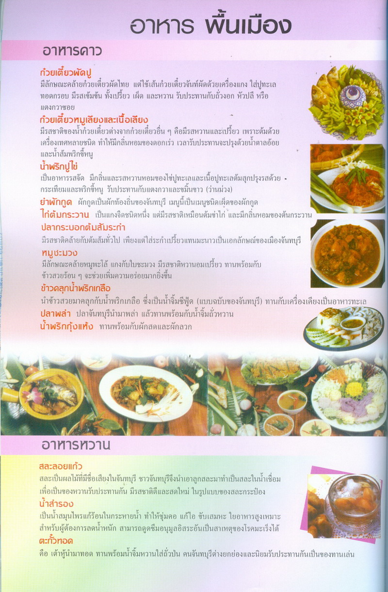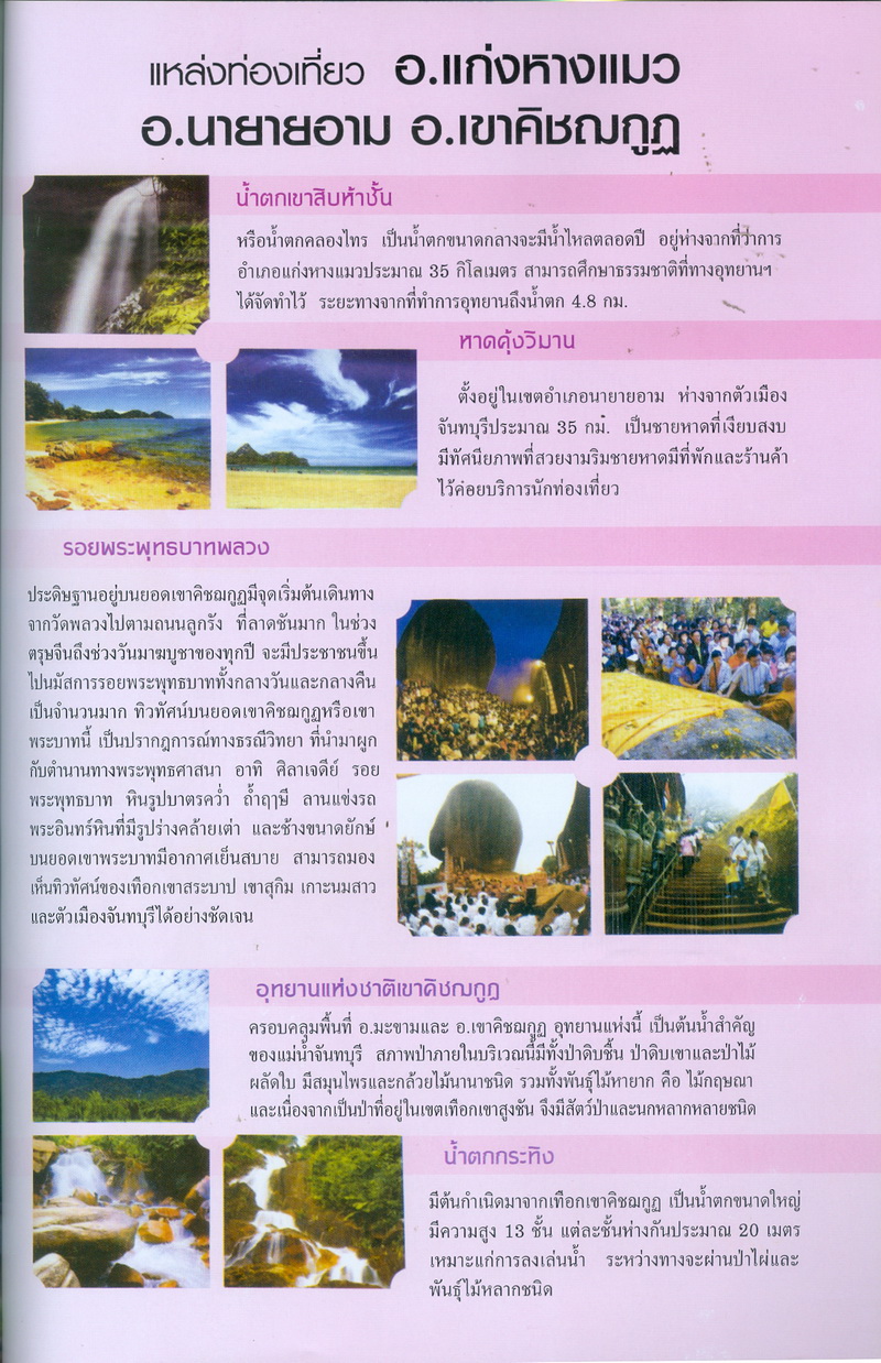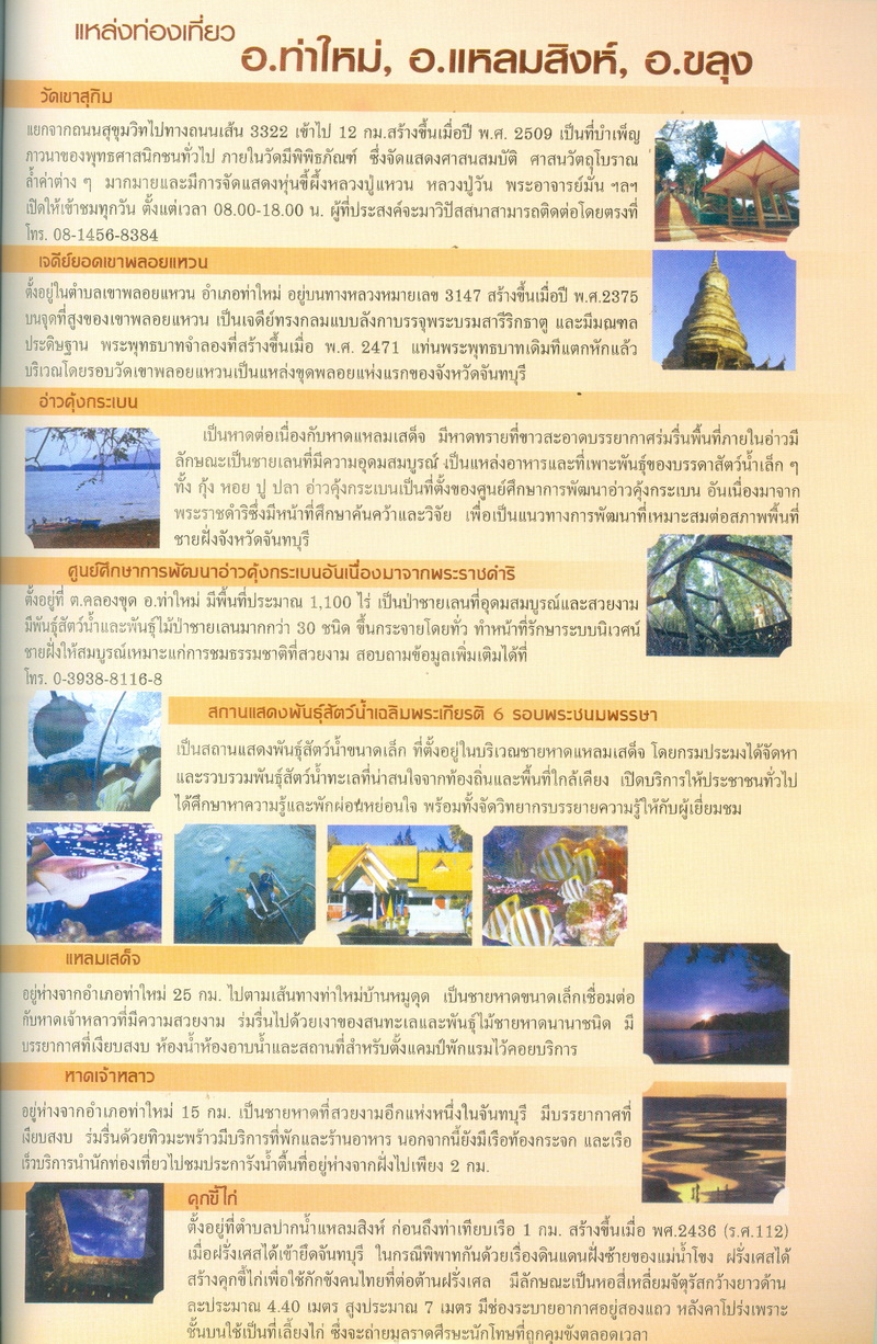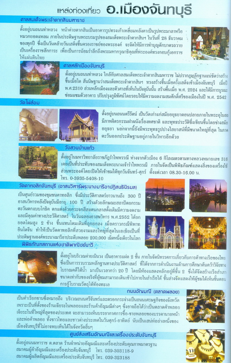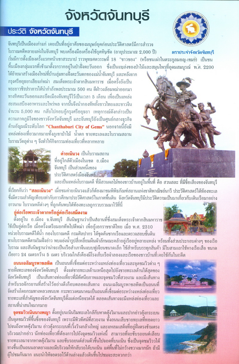 - เนื้อหาประกอบด้วย เปิดประตูสู่จันทบุรี ประวัติศาสตร์จันทบุรี ศิลปะสมัยก่อนเมืองพระนคร ศิลปะหลังเมืองพระนคร หลักศิลาจารึก 1-7 หน้าประวัติศาสตร์ชาวจันทบุรีภาคภูมิใจ หน้าประวัติศาสตร์ชาวจันทบุรีขมขื่นใจ ที่มาของชื่อ "จันทบุรี" พระบรมราชานุสาวรีย์ฯ อันเป็นที่มาของพระราชสมัญญานาม "สมเด็จพระเจ้าตากสินมหาราช" กับพระราชกรณียกิจสมเด็จพระนางเจ้ารำไพพรรณี แหล่งท่องเที่ยวอำเภอต่างๆ ในจันทบุรี อาหารพื้นบ้าน พลอยเมืองจันท์ "ตราดเพชรงามแดนบูรพา อาหารดังจังหวัดตราด และแหล่งท่องเที่ยวเมืองตราด