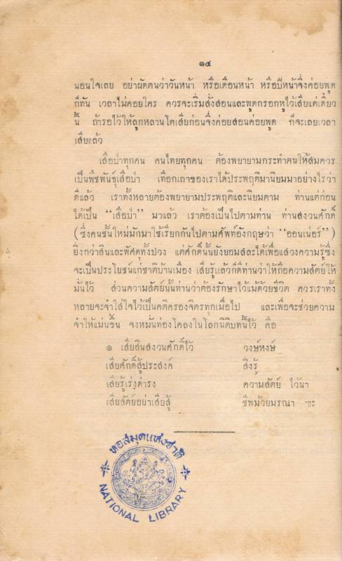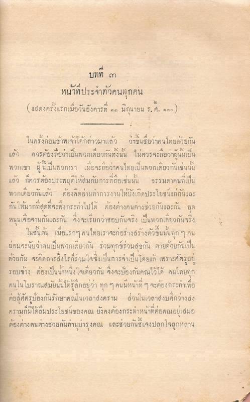 - เป็นหนังสือรวบรวมพระบรมราโชวาทในพระบาทสมเด็จ พระมงกุฎเกล้าเจ้าอยู่หัว พระบรมราโชวาท หน้าที่ประจำตัวคนทุกคน ทรงแสดงครั้งแรกเมื่อ วันที่ 13 มิถุนายน ร.ศ. 130 ให้คนไทยรักชาติบ้านเมืองรู้จักหน้าที่ของตน ทำประโยชน์เพื่อชาติบ้านเมือง ชาติไทยตั้งขึ้นได้เพราะผู้ที่เป็นชนกนั้นมีใจเหมือนดั่ง "เสือป่า" เหล่าลูกเสือหรือเสือป่าต้องมีความซื่อตรง รู้จักความภักดีต่อพระเจ้าแผ่นดิน รักชาติ เคารพนับถือและเลื่อมใสในพระศาสนา รักษาความเป็นไทยถือเป็นหน้าที่สำคัญ ปลุกใจเสือป่า