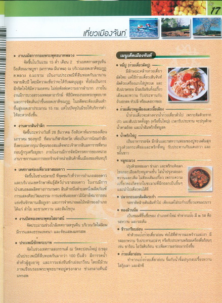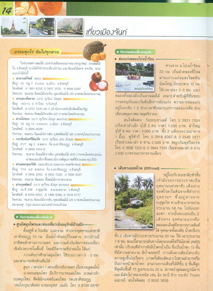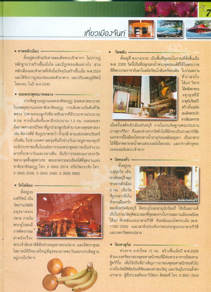 - เนื้อหาประกอบด้วย เล่าเรื่องเมืองจันท์ ล้อหมุน เที่ยวเมืองจันท์ เปิดตำนานประวัติศาสตร์ สักการะพุทธสถานและสิ่งศักดิ์สิทธิ์ เที่ยวป่า เล่นน้ำตก กินลมชมทะเล สัมผัสวิถีชีวิตคนจันท์ กิจกรรมท่องเที่ยวที่น่าสนใจ แผนที่จันทบุรีและแหล่งท่องเที่ยวที่สำคัญ อำเภอต่างๆ เทศกาลประเพณี เมนูเด็ดเมืองจันท์ ซื้อของกลับบ้าน ฯ.