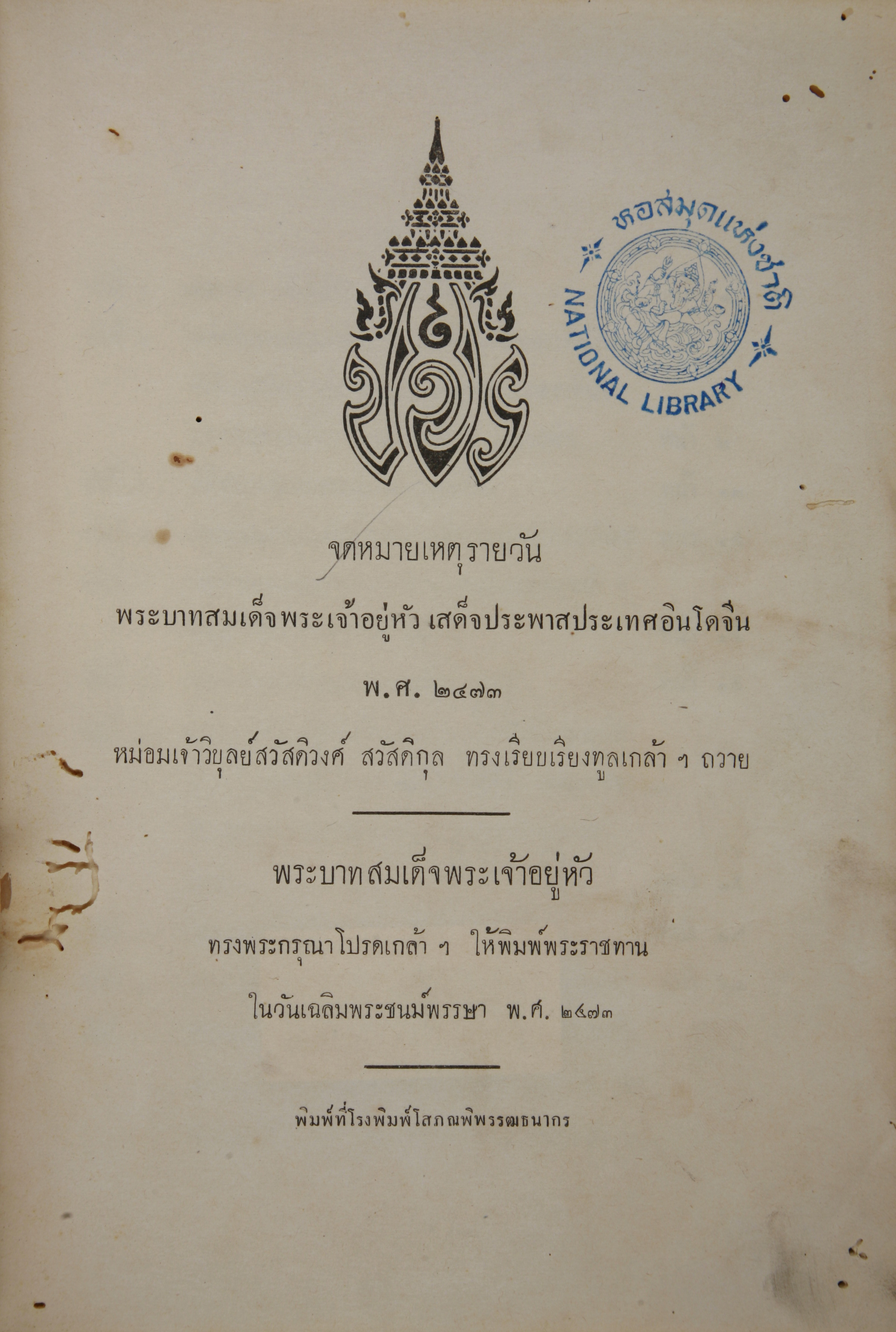 หม่อมเจ้าวิบุลย์สวัสดิวงศ์ สวัสดิกุล, “จดหมายเหตุรายวัน พระบาทสมเด็จพระเจ้าอยู่หัว เสด็จประพาสประเทศอินโดจีน พ.ศ. 2473,” D-Library | National Library of Thailand, accessed April 2, 2026, http://164.115.27.97/digital2024/items/show/5996.