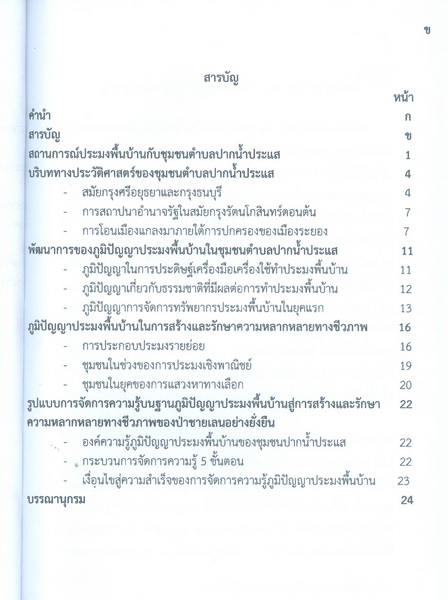 - เนื้อหาประกอบด้วย สถานการณ์ประมงพื้นบ้าน กับ ชุมชนตำบลปากน้ำประแส บริบททางประวัติศาสตร์ของชุมชนตำบลปากน้ำประแสสมัย กรุงศรีอยุธยา และกรุงธนบุรี พัฒนาการของภูมิปัญญาประมงพื้นบ้าน ในการสร้างและรักษาความหลากหลายทางชีวภาพองค์ความรู้ภูมิปัญญาประมงพื้นบ้าน 5 ขั้นตอนสู่ความสำเร็จ บรรณานุกรม