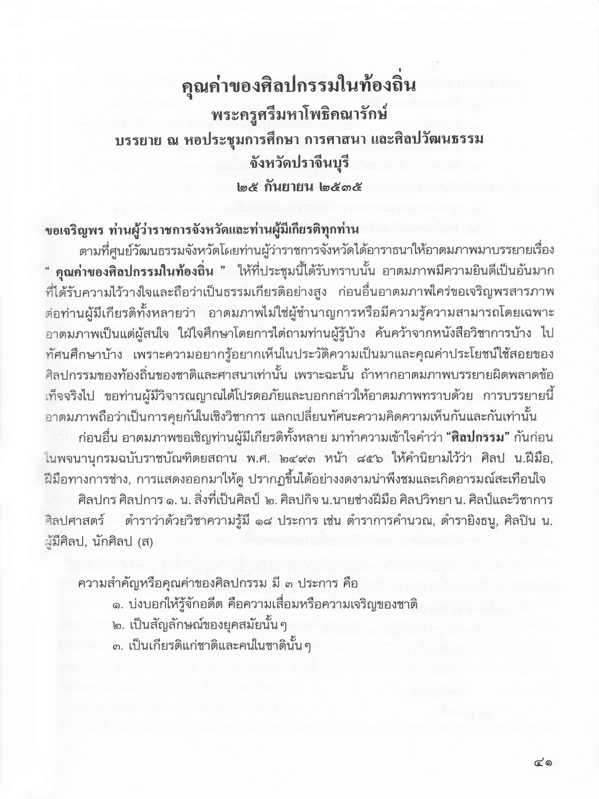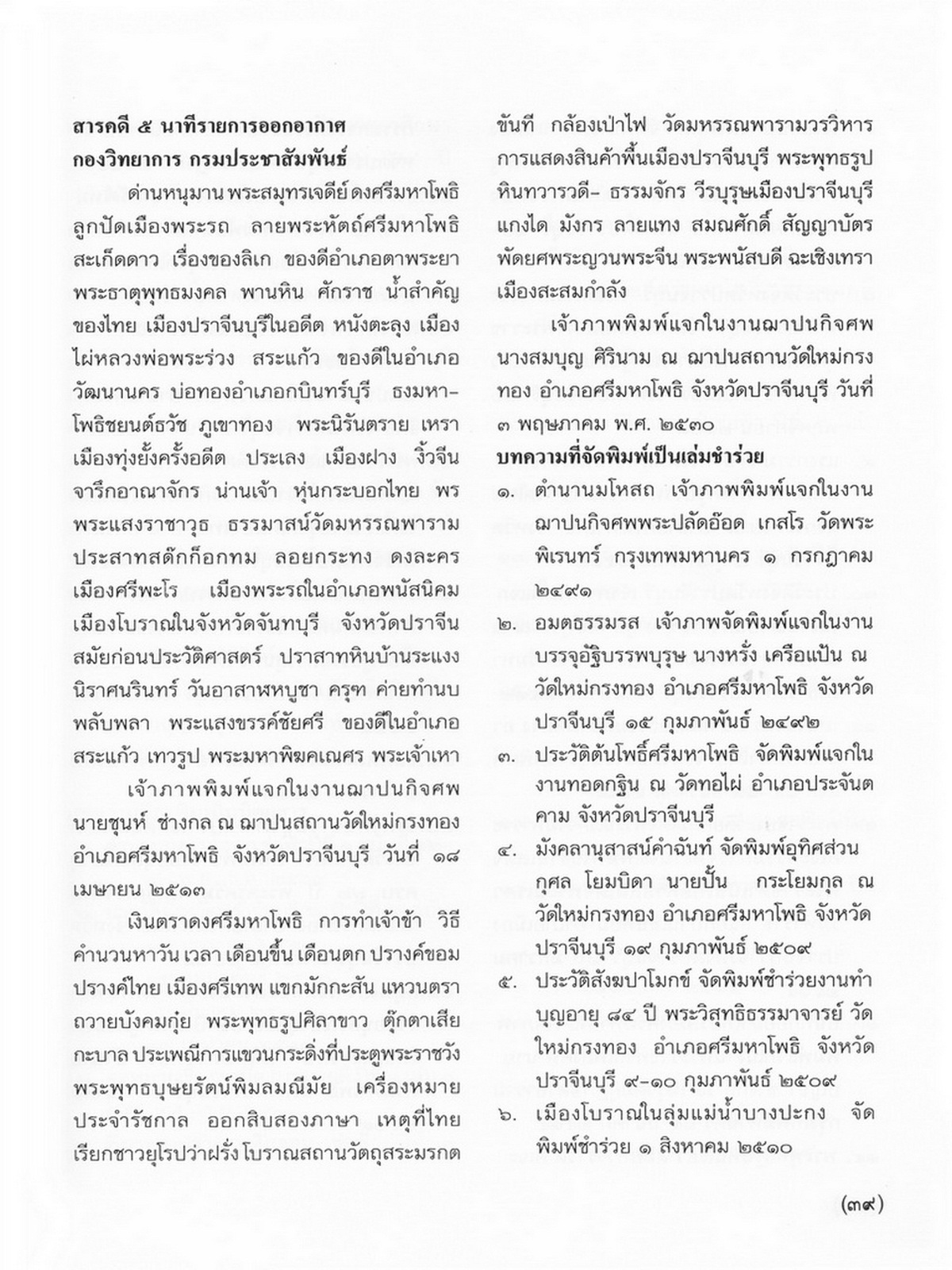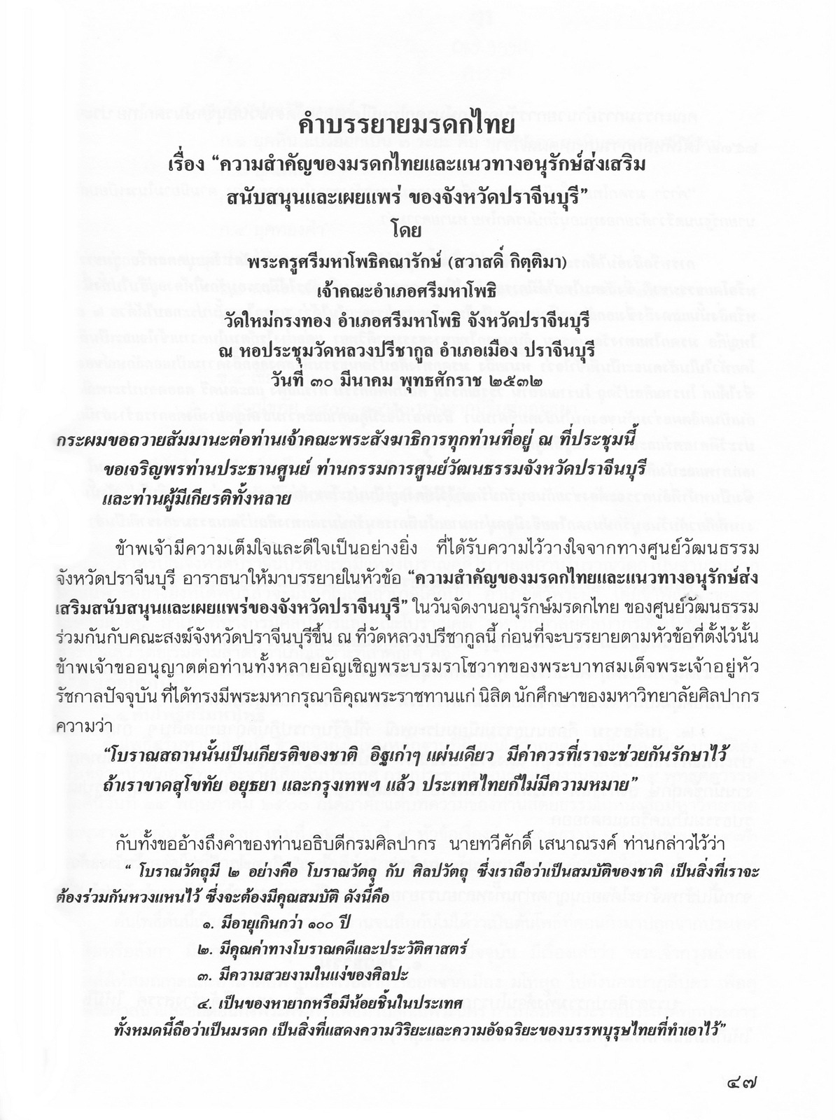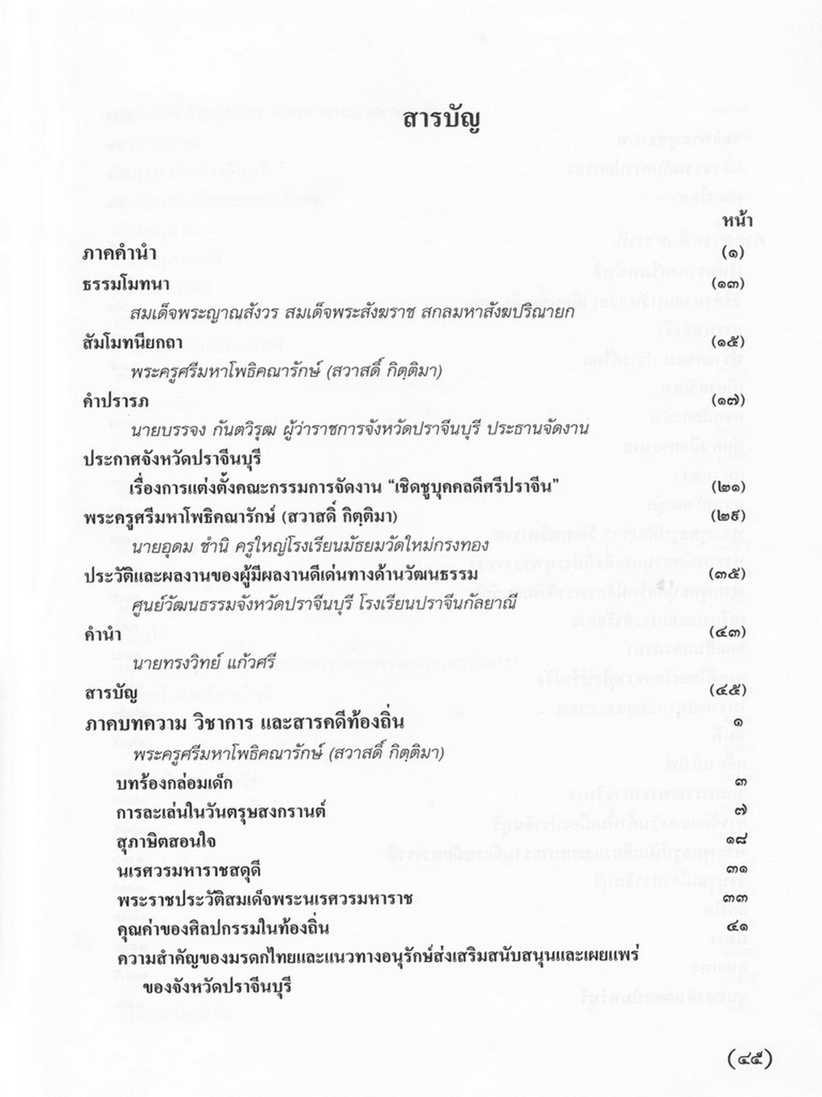 - เป็นหนังสือที่รวบรวมบทความวิชาการและสารคดีท้องถิ่นของพระครูศรีมหาโพธิคณารักษ์(สวาสดิ์ กิต.ติมา) ได้แต่งบทร้องกล่อมเด็กการละเล่นในวันตรุษสงกรานต์ สุภาษิตสอนใจ นเรศวรมหาราชสดุดี พระราชประวัติสมเด็จพระนเรศวรมหาราช คุณค่าของศิลปกรรมในท้องถิ่น ความสำคัญของมรดกไทย และแนวทางการอนุรักษ์ส่งเสริมสนับสนุนและเผยแพร่ของจังหวัดปราจีนบุรี.